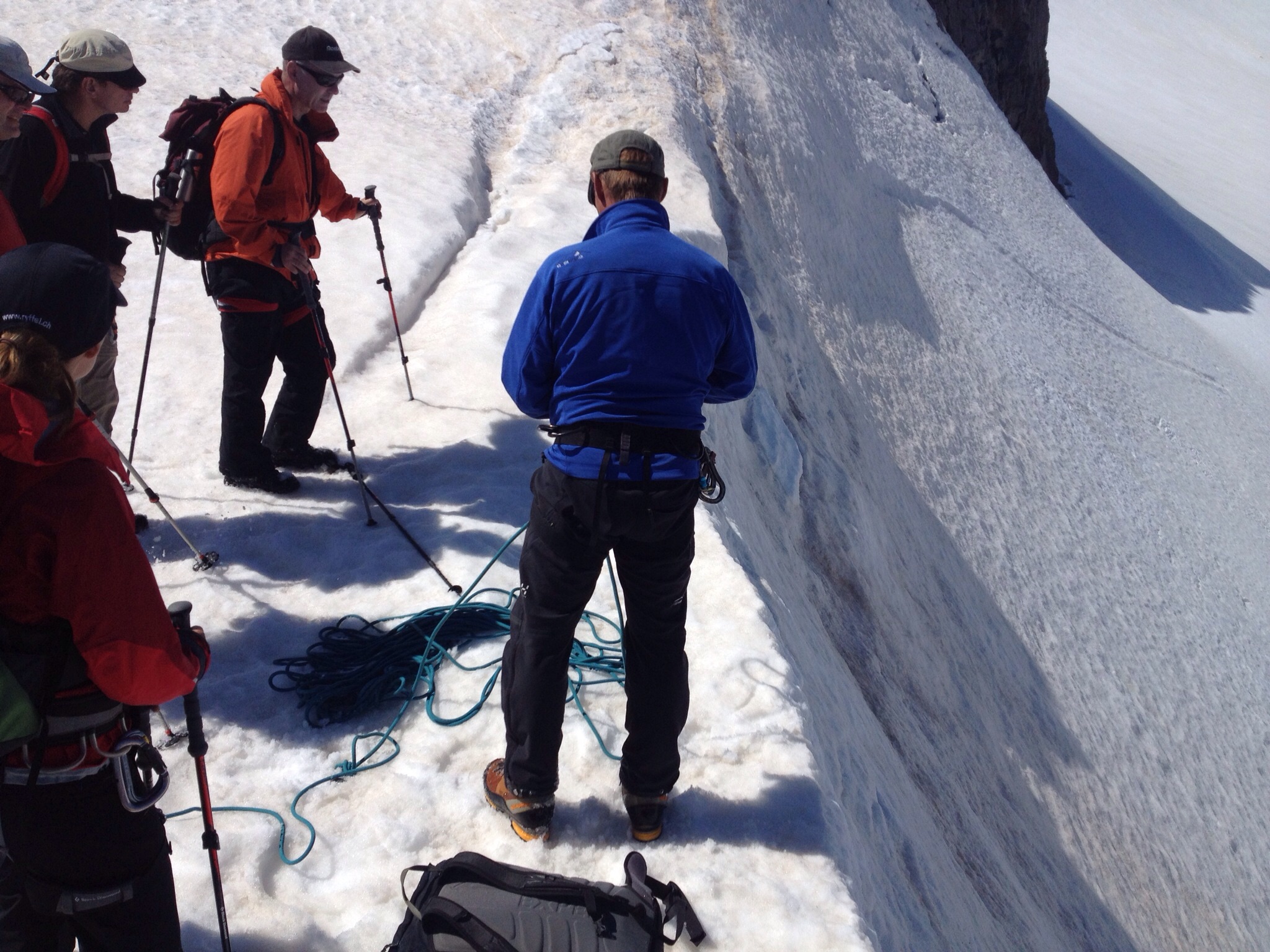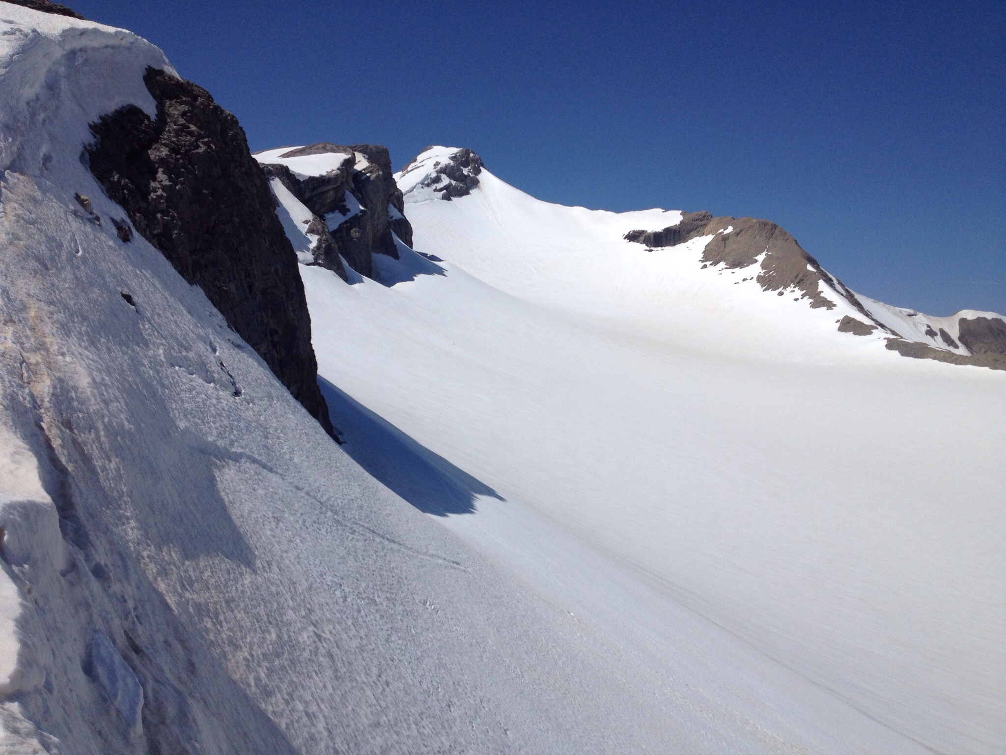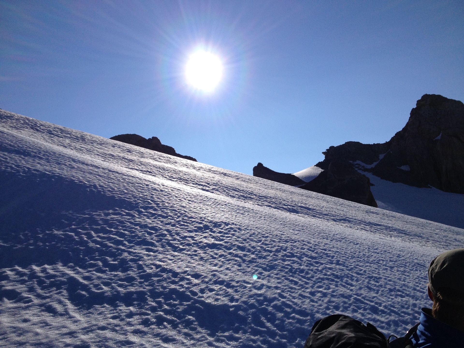 Morgens um fünf Uhr beginnt der Aufstieg. Schon auf 2300m ü M. müssen die Steigeisen montiert werden. Zuviel Schnee liegt noch an den Flanken des Wildhorn an diesem 5. Juli 2013. Die Route führt über den Col du Brochet rund um den Mont Pucel auf die südliche, vergletscherte Seite des Wildhorns. Die Direttissima über den Westgrat erscheint Bergführer Peter Sollberger noch zu riskant. Beim Pucel-Grat auf 3000m ü M. erwartet uns die wärmende Sonne und ein fantastischer Blick in die Walliser Alpen. Es wird ein herrlich klarer und wolkenloser Sommertag. Für Einige beginnt der weicher werdende Schnee dann aber doch zu einer echten Challenge zu werden. Nur Bergfloh Christine scheint das alles nichts anzugehen, so leichtfüssig wie sie die letzten Höhenmeter zum Gipfelgrat bewältigt. Philipp droht andererseits schon früh, mich ans Gipfelkreuz zu schlagen – aber oben fehlt ihm dann glücklicherweise die Kraft dazu.