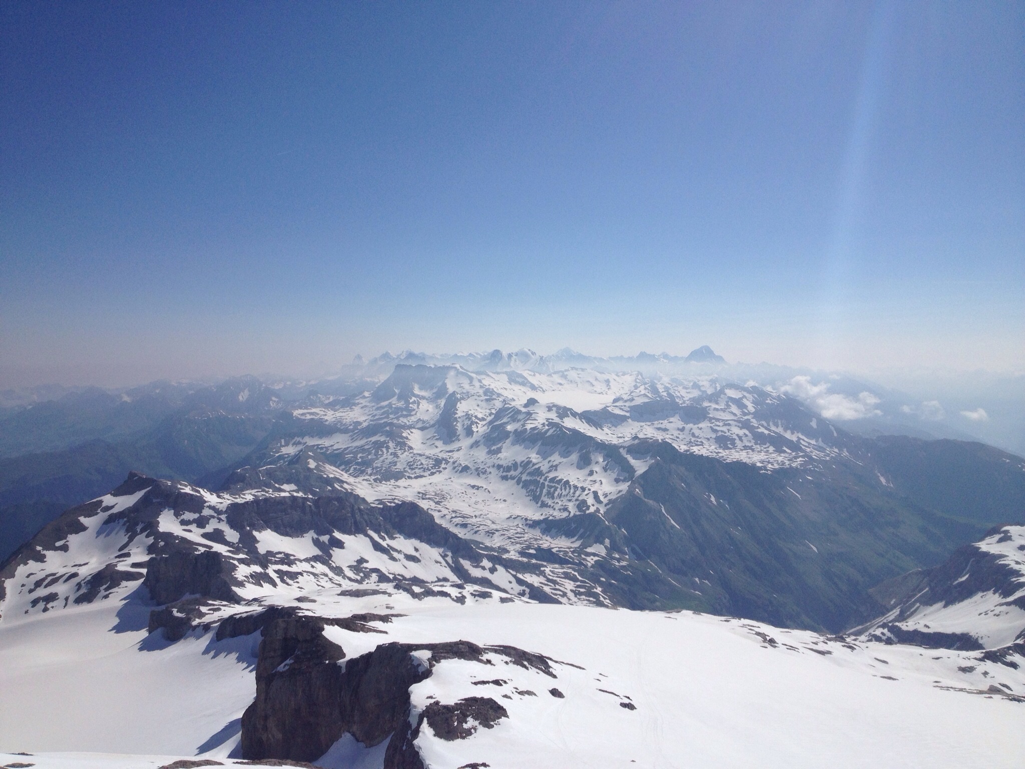 Was uns dann auf dem Gipfel erwartet verschlägt allen die Sprache: Sicht ohne Ende vom Säntis bis zum Montblanc und ein wunderbarer schneefreier Platz auf dem Ostgipfel zum Relaxen, Dösen und Staunen. Erst hier oben realisieren die Berggänger, wie unendlich frei und stolz dieses Wildhorn über ihre Umgebung trohnt. Die Glückshormone sprudeln nur so.
