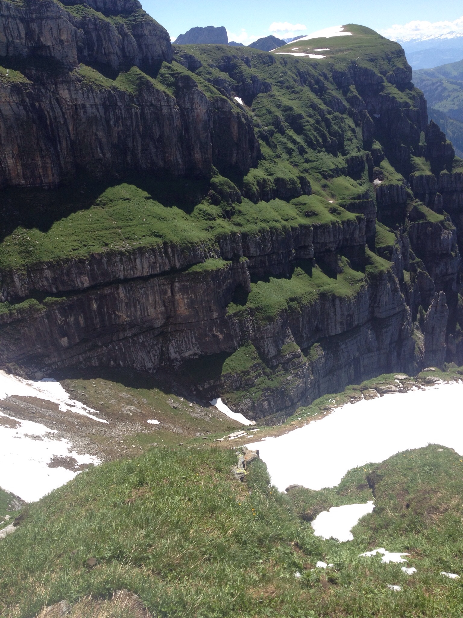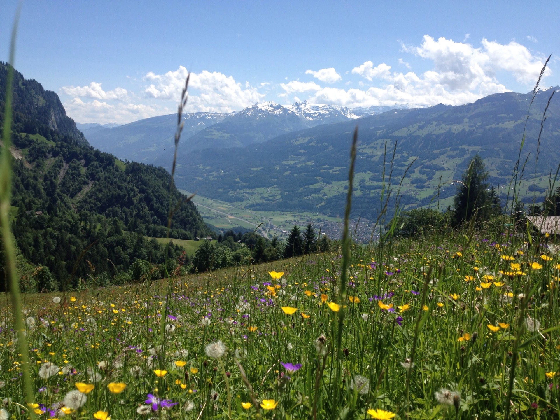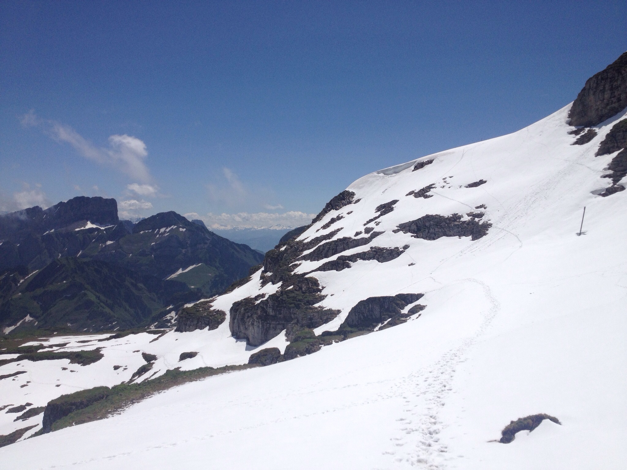 Durch saftige Alpweiden stapfend folge ich dem Bergweg in Richtung Westen, zunächst kaum steigend etwa entlang der 1300er-Höhenkurve. Es bleibt Zeit für genussvolle Blicke auf die reiche Flora um mich herum, den türkisblauen Walensee unter mir und die für anfangs Juli noch reichlich verschneiten Bergreihen vor mir. Ich singe vor Freude – wohl wissend, dass mir keiner zuhören kann.
