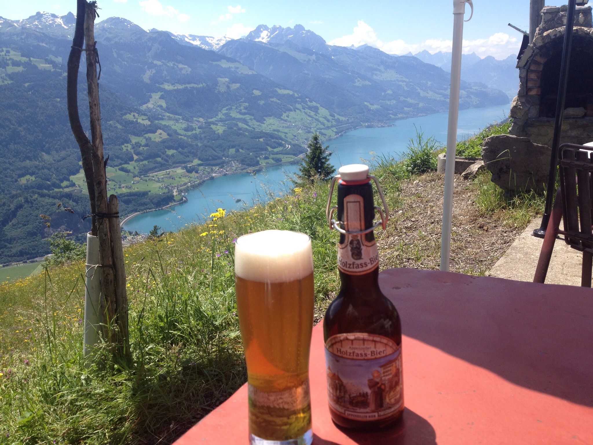 Nur wenige Schritte vom Chäserrugg-Trubel entfernt bin ich dann wieder alleine für den Rest der Tour. Die Route führt teilweise surfend über die noch weisse Nordflanke zum Sattel des Gamserruggs, dort zweigt ein Weg südöstlich in Richtung Nideri-Pass ab. Die 120 Höhenmeter Gegensteigung vor diesem Übergang sind etwas hässlich für die schon müden Beine, dafür entpuppt sich der Abstieg vom Pass nach Lüsis – mit schönem Weitblick ins Rheintal – als zwar steil aber leicht. Durch blumenreiche Alpwiesen erreiche ich schliesslich den verschlafenen Weiler und freue mich auf das Holzfass-Bier aus der Bügelflasche. Das gibts im schön gelegenen Beizli neben dem Parkplatz, auch der Apfelkuchen ist fein.