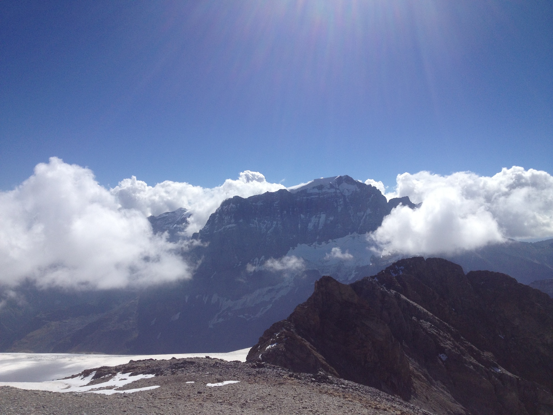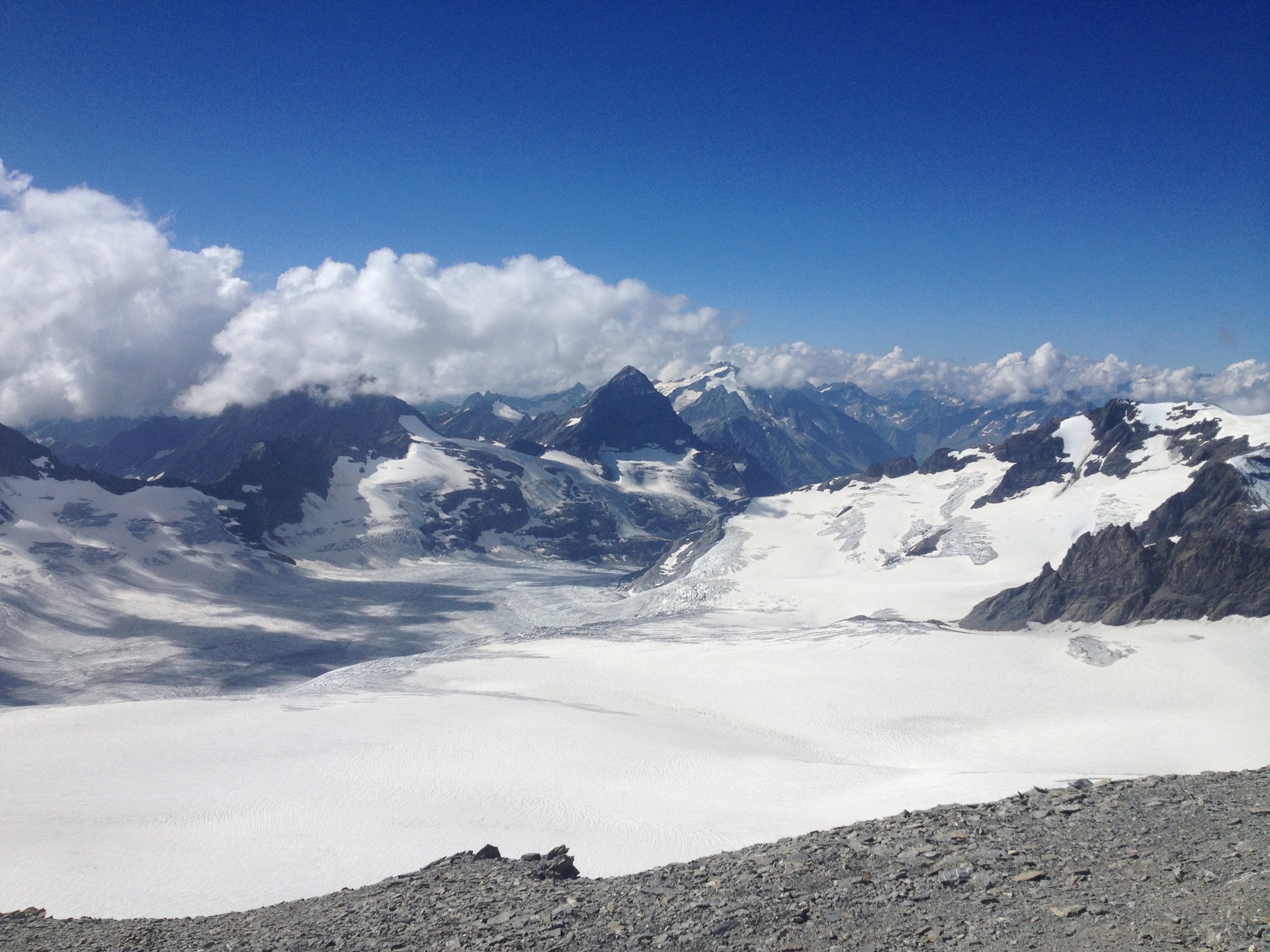Der Gipfel bietet dann die erhoffte Kanzelsicht. Wow! Das breite Gipfelplateau erlaubt ein ausführliches Sonnenbad auf den gewärmten Steinen. Wir geniessen es, den Clariden an diesem praktisch wolkenlosen Wochentag ganz für uns alleine zu haben.