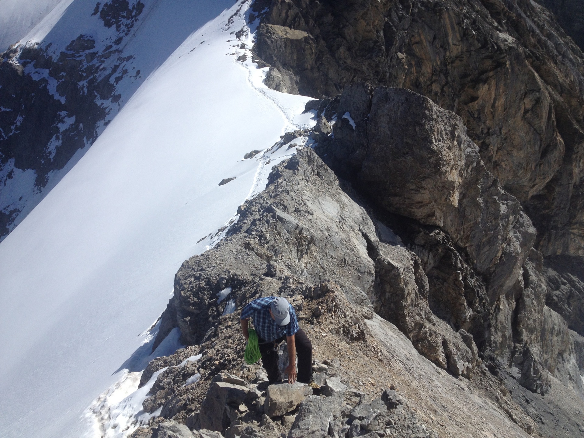 Der Blick vom Vorgipfel zum Gipfel. Dort wo die Spuren in den Schatten führen wird es heikel – die Rutschbahn hat kein Auffangnetz….nach 50m erreicht man aber den „sicheren“ Fels, der einfach erkraxelt werden kann