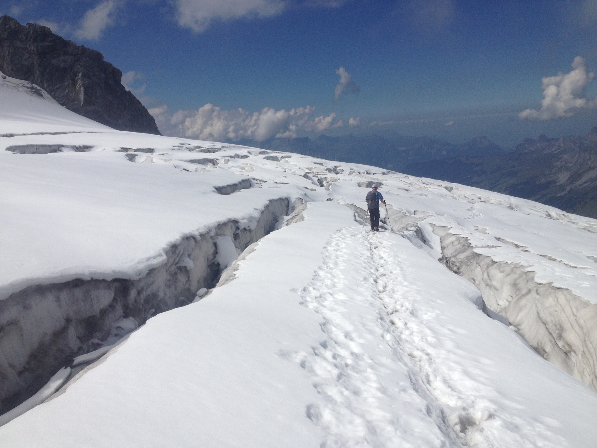 Der Gletscher ist nach dem anfänglichen Steilstück einfach begehbar, die Spalten sind gut sichtbar, und die Planurahütte-Tourengänger haben gut gespurt. Bald naht der Grat, der einen fantastischen Einblick in den oberen Teil des Hüfifirns zulässt. Wie eine riesige Suppenküche wirkt diese gigantische, von Felsen und Gipfeln umgebenen Eisebene. Wenig später erreichen wir den Vorgipfel, das Ziel der Tourenskifahrer im Winter.