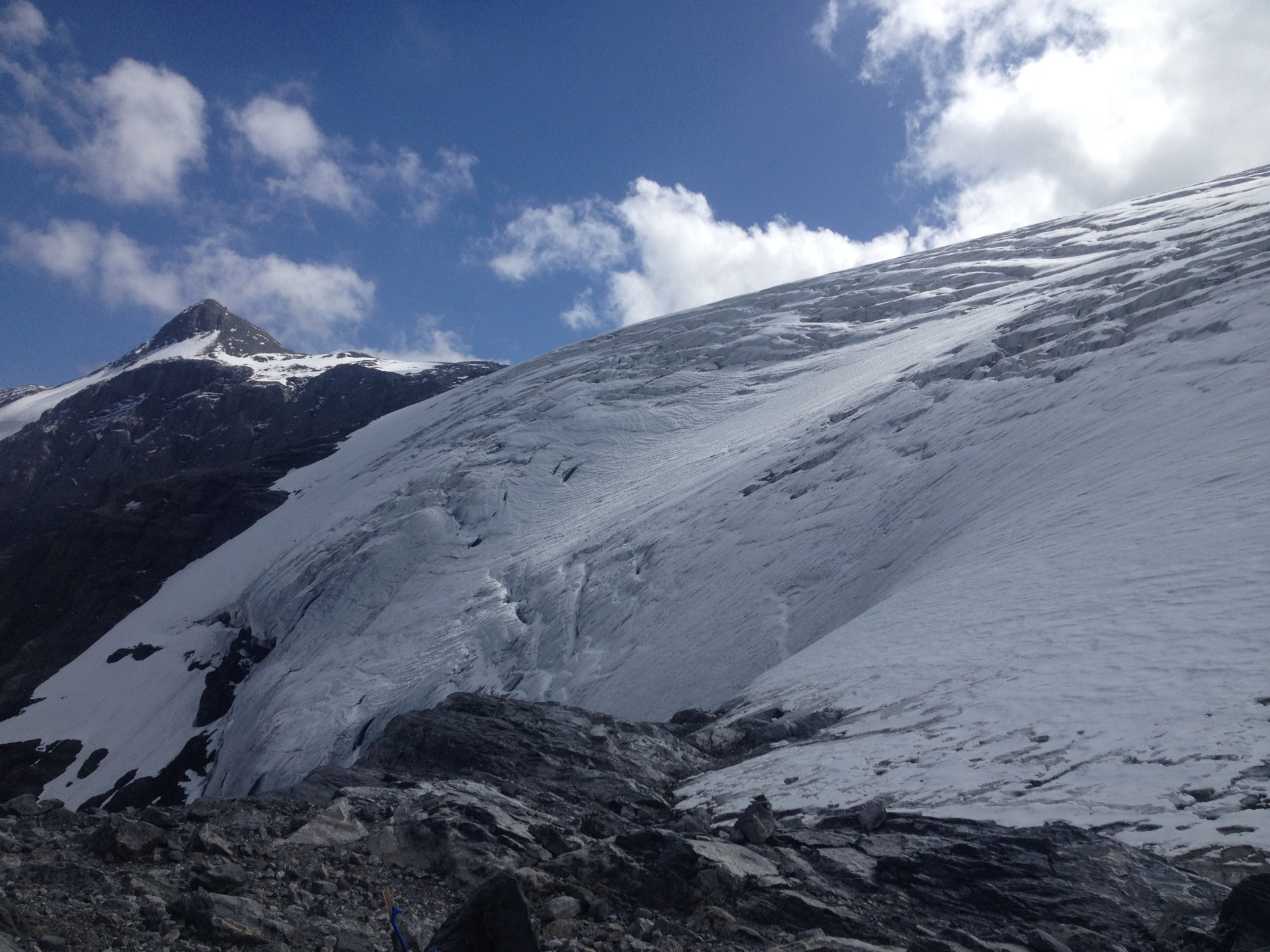 Der Normalwanderer wird schon früh durch eine kleine Kraxelpassage abgeschreckt – unnötigerweise. Denn mit vielen Steinmännchen versehen führt die gut findbare Route durch verschiedenste interessante Geländekammern höher und höher. Auf über 2800m ü M. erscheint hinter einer Moräne das Iiswändli – so bezeichnet wird das letzte, steil abfallende Stück des Claridengletschers.