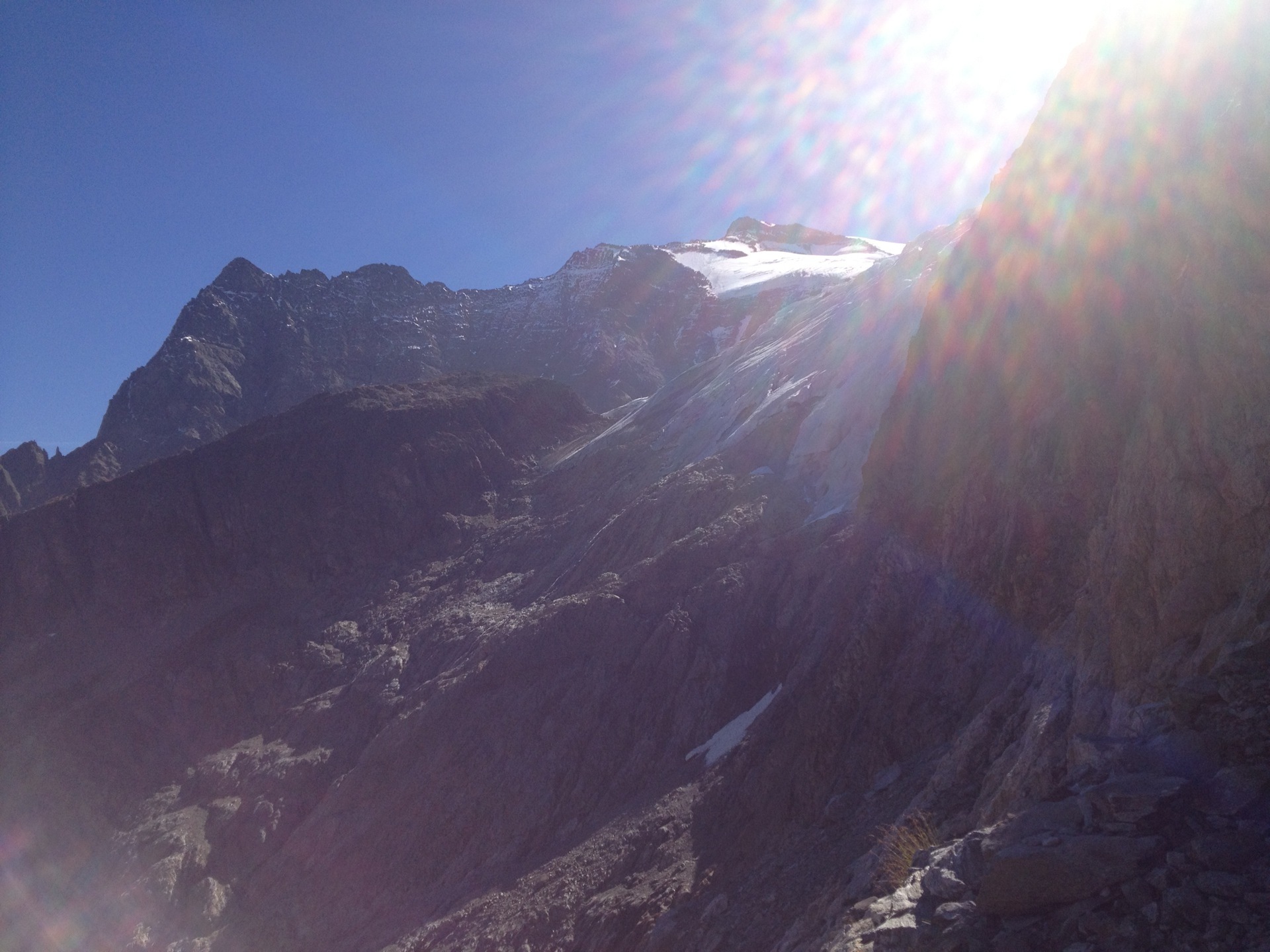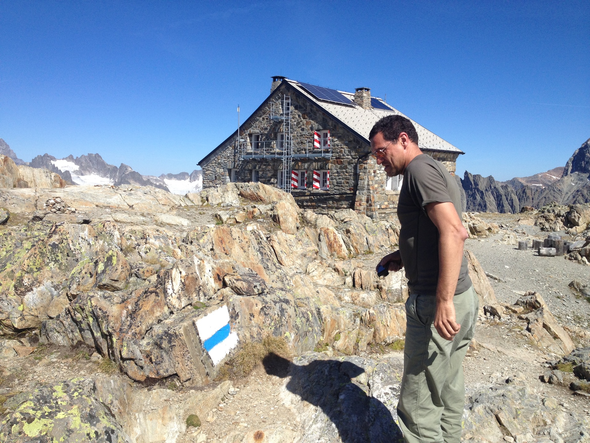 Wir beobachten schmunzelnd das Hüttenteam, das sich etwas schwertut mit der Installation der Winterschleuse vor der Türe. Der erste Schnee ist schon im Anzug, auch wenn es an diesem Septembertag noch fast hochsommerlich warm ist. Mit Respekt besinne ich mich auf die Schwierigkeiten, die mir der hartgefrorene Neuschnee beim Hüttenbesuch über die Normalroute vor zwei Jahren bereitete. Der Bergweg zur Hütte liegt an einem Nordhang, der sich immer schwertut, den frühen Neuschnee mit Hilfe der wenigen Stunden Herbstsonne wieder loszuwerden.