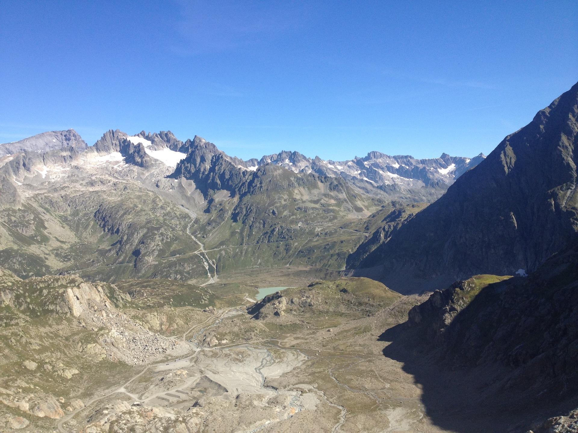 Der Abstieg über den Hüttenweg ist steil und landschaftlich abwechslungsreich. Der Weg schlängelt sich zuerst durch Felsen, dann durch offenes Brockengelände. Erst viel weiter unten hat sich das Gras eine bescheidene Existenz erkämpft, noch weiter unten die mickrigsten Bergblumen. Wir sehen auf die gewaltige Südwand des Titlis und den unverwechselbaren Fünffingerstock. Darunter windet sich die kunstvoll angelegte Sustenpasstrasse.
