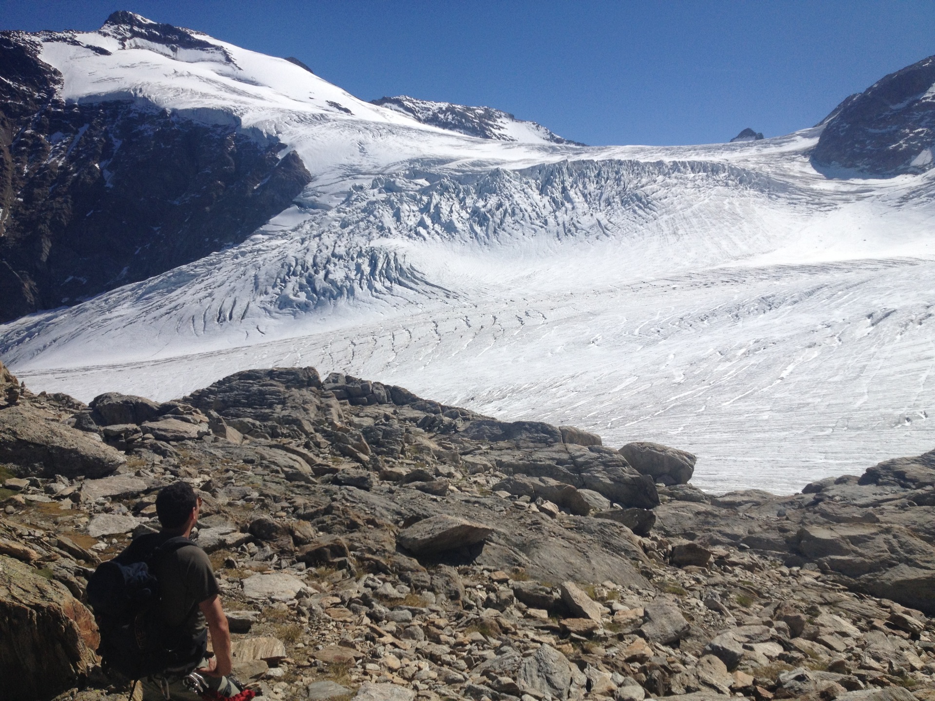 Wir beobachten die Hochtourengänger, die sich wie schwarze Punkte auf weissem Feld bewegen und sich einen Weg vom Sustenhorn zurück durch das Spaltenlabyrinth suchen. Die Besteigung des Sustenhorns ist ja so nicht schwierig, nur sind diese stundenlangen Gletscherwanderungen nicht jedermanns Sache. Mit den Tourenskis müsste das hingegen toll sein, leider bin ich diesbezüglich noch traumatisiert aus meiner Jugend.