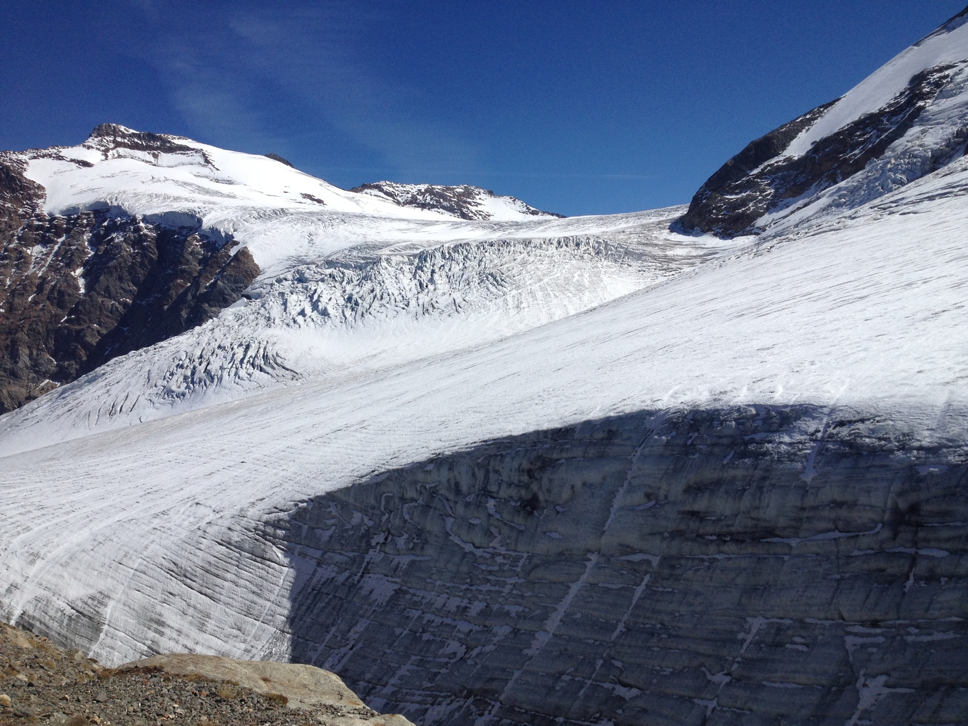 Nach knapp zwei Stunden Aufstieg erreichen wir die Hütte, die so wunderbar exponiert auf der Felsnase vor dem ewigen Eis steht. Gleich vor der Hütte bekommt man einen Eindruck von der Dicke des Eispanzers, über hundert Meter sollen es sein. Wir machen es uns bequem und lassen uns eine deftige Gemüsesuppe mit Würsten reichen.