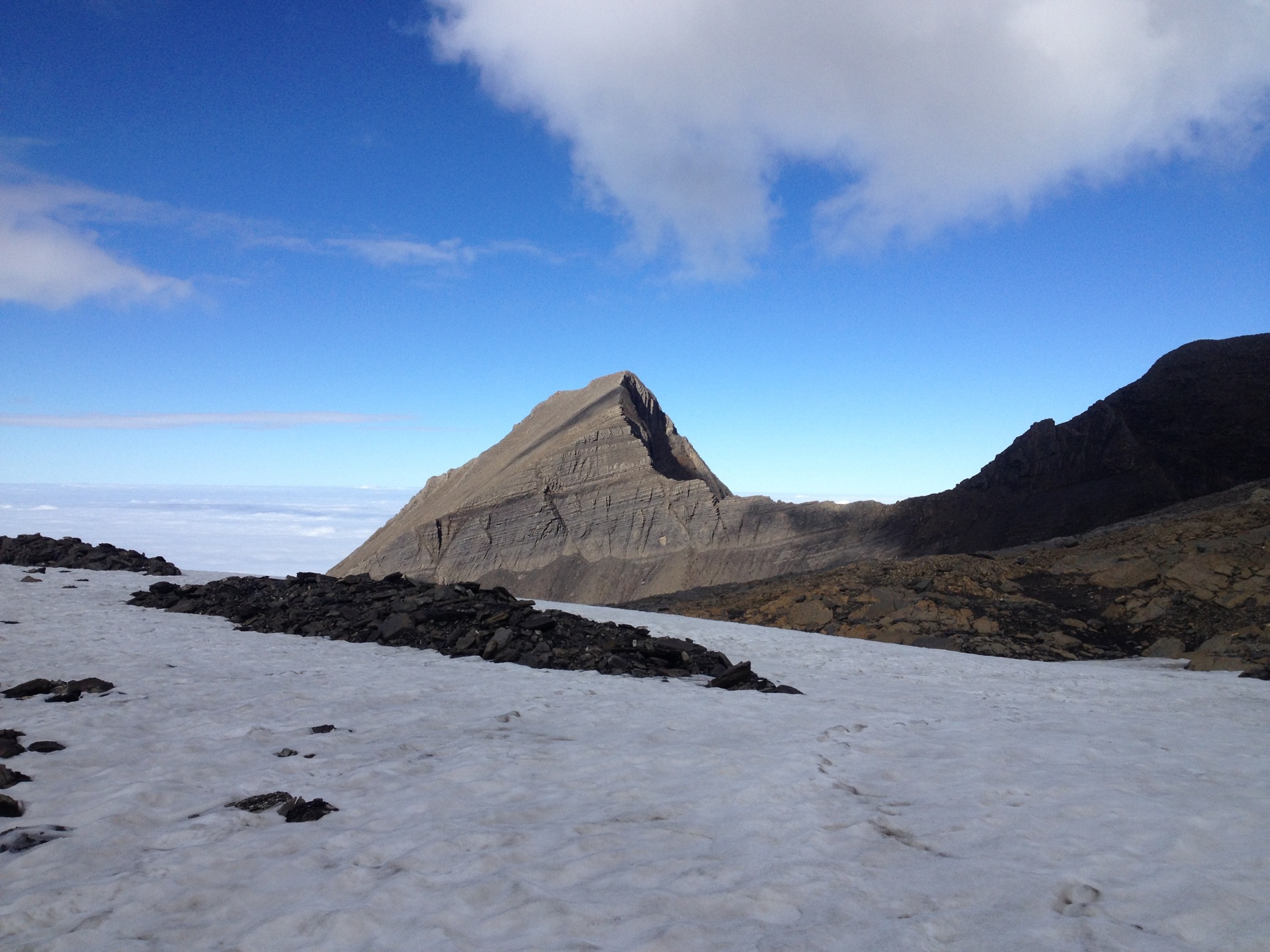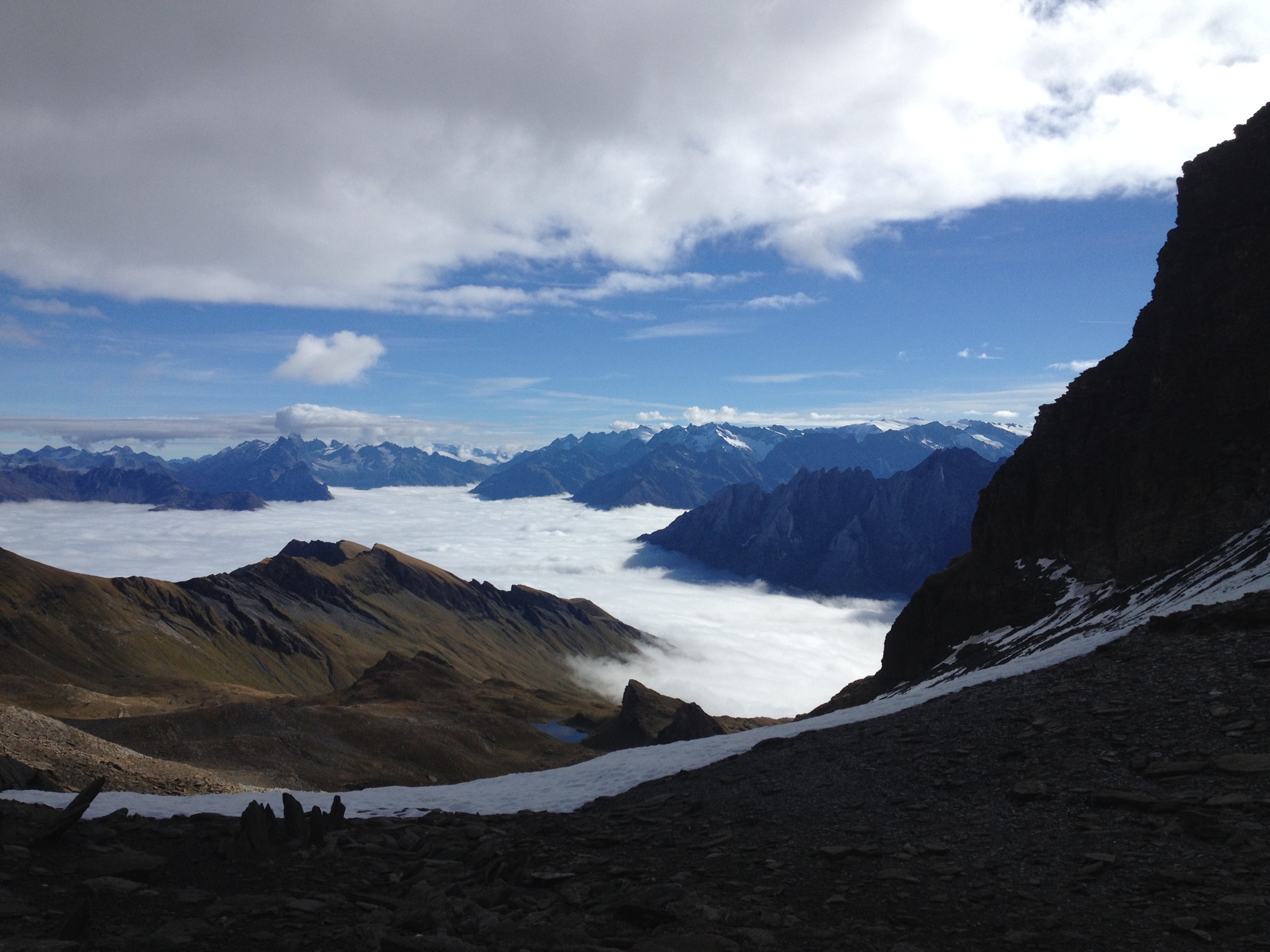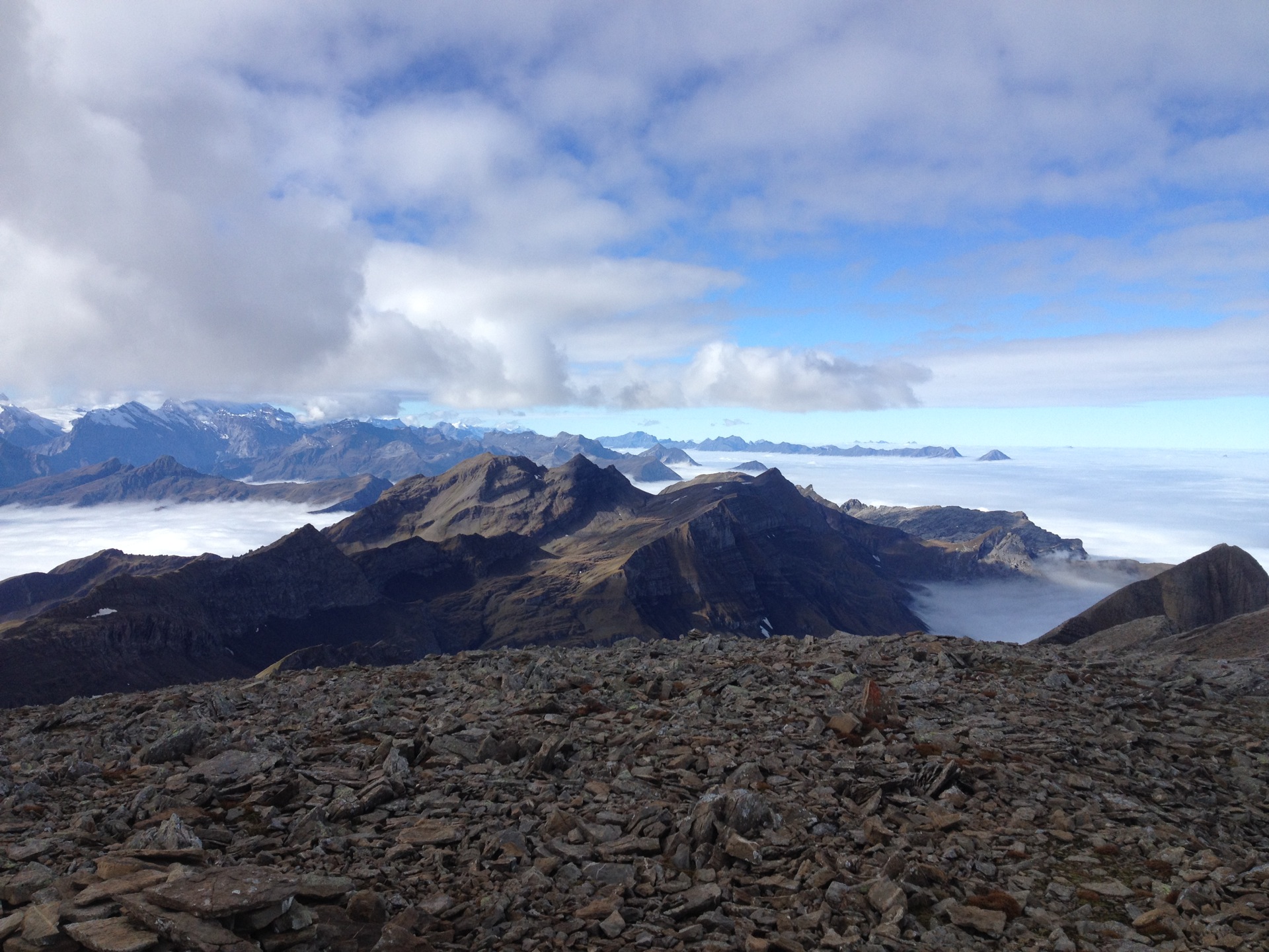 Steil geht es weiter über den schuttigen, breiten Gratrücken zum Wildgärst. Hier erwartet mich der erhoffte, grandiose Rundblick. Das breite Gipfelplateau erschwert die Wahl des besten Plätzchens für die Gipfelpause – ein Luxusproblem. Ich beisse in mein Thon-Sandwich, fasziniert gleiten meine Blicke über die Wolkendecke. Ich probiere die Gipfelchen zu erkennen, die aus dem Nebel herausragen. Hinter mir präsentieren sich, frisch verschneit, die Berner Oberländer Popstars Eiger, Mönch und Jungfrau.
