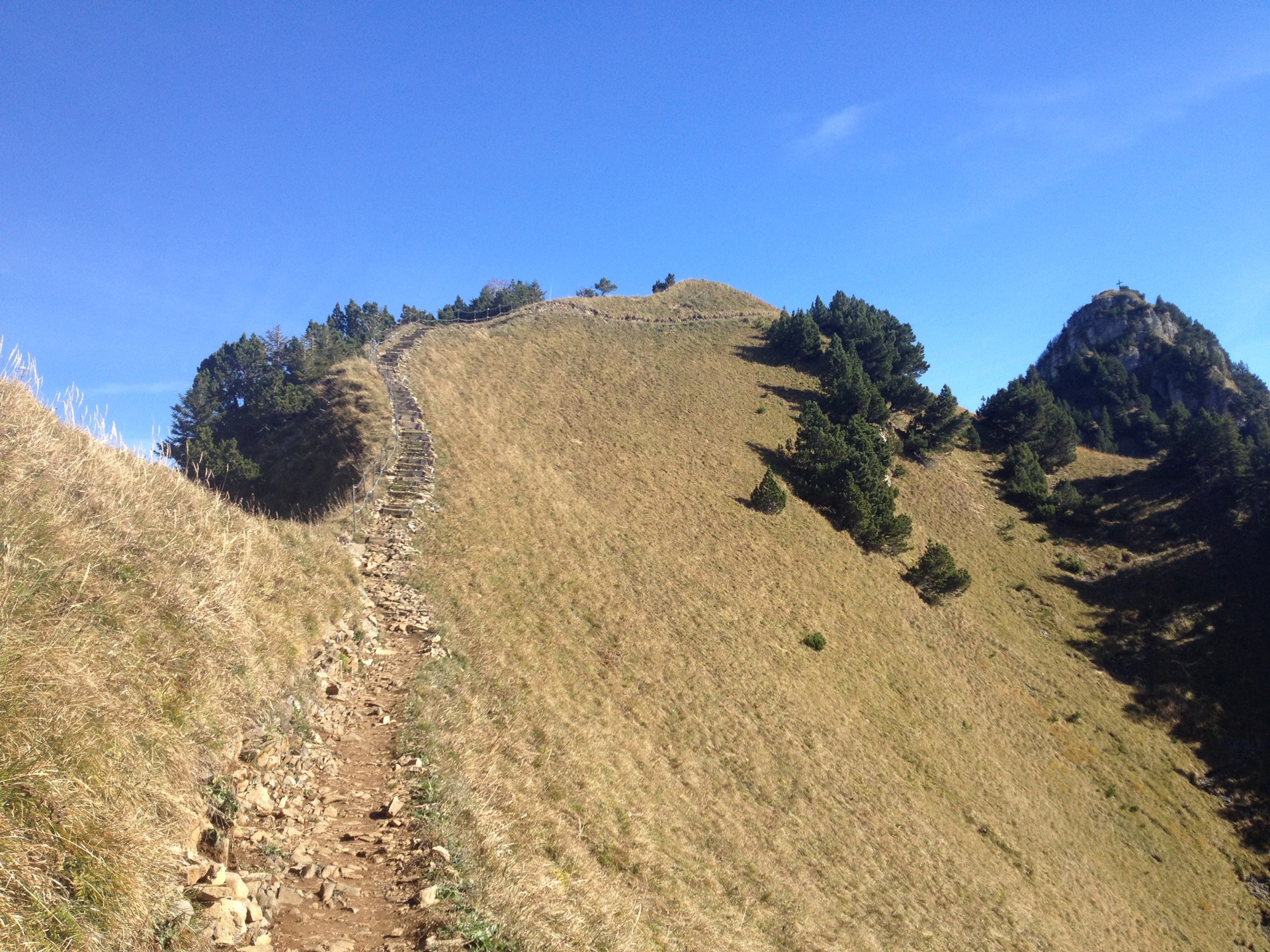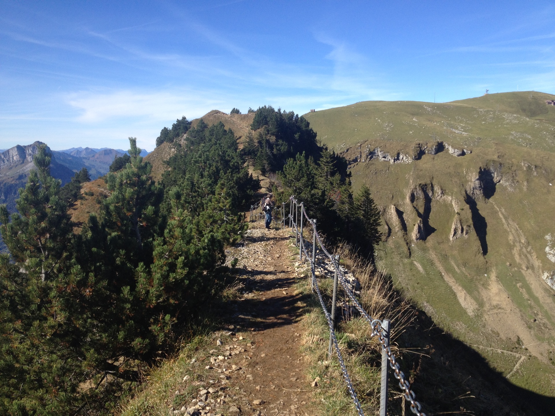 Die Route von hier zum Klingenstock ist logischerweise gut begangen, auch an diesem letzten Freitag der Herbsferien. Mit Hilfe der beiden Sesselbahnen kommen Bergfreunde mit wenig Mühe zu einem grossartigen Panorama-Trail. Der Weg ist perfekt ausgebaut, die wenigen ausgesetzten Stellen sind gut gesichert. Im leichtem Auf und Ab führt der Gratweg je nach Lauftempo in ein bis zwei Stunden zum Klingenstock.