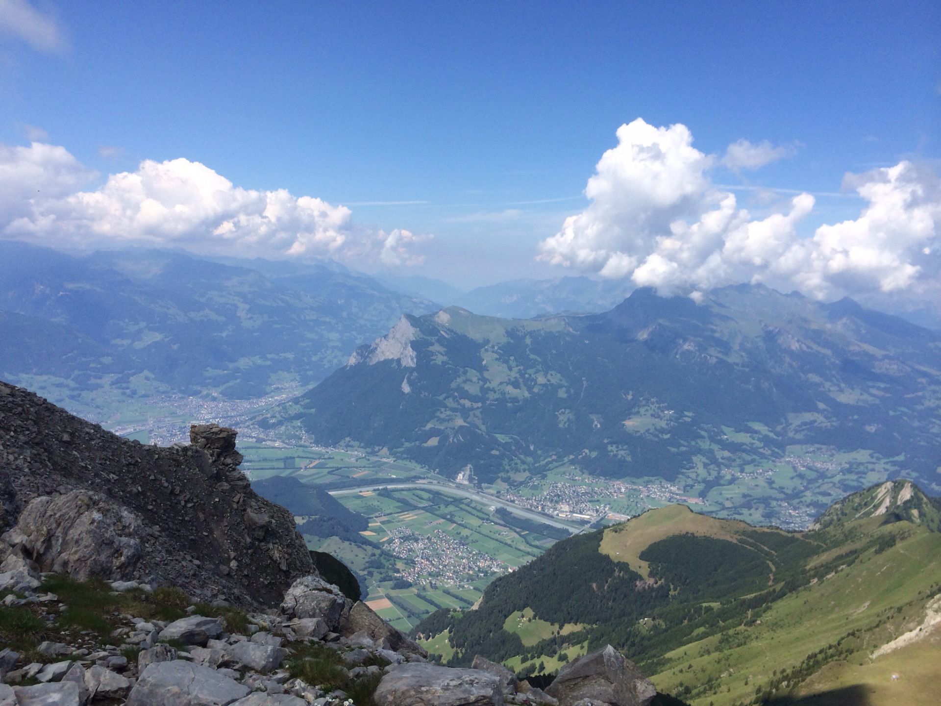 Jetzt hat man den Gipfel vor Augen. Er ist noch ziemlich weit weg. Der schmale Pfad führt zunächst zu einem Pass, der den Blick auf das weite Rheintal freigibt. Wie Ameisen krabbeln die Autos auf der Autobahn, hier oben herrscht hingegen totale Ruhe. Ein leichter Wind treibt die warme Luft aus dem tiefen Tal nach oben, auf dem Grat wirbelt er mir um die Ohren. Der Pfad wird nun wirklich steil. Ich ärgere mich, dass ich zu schnell unterwegs bin. Nach 1000 Höhenmeter sind meine Beine sauer und der Gipfel noch weit weg. Ich verfluche meine völlig unangebrachte Eile. Hätte ich doch nur die Bahn reserviert!