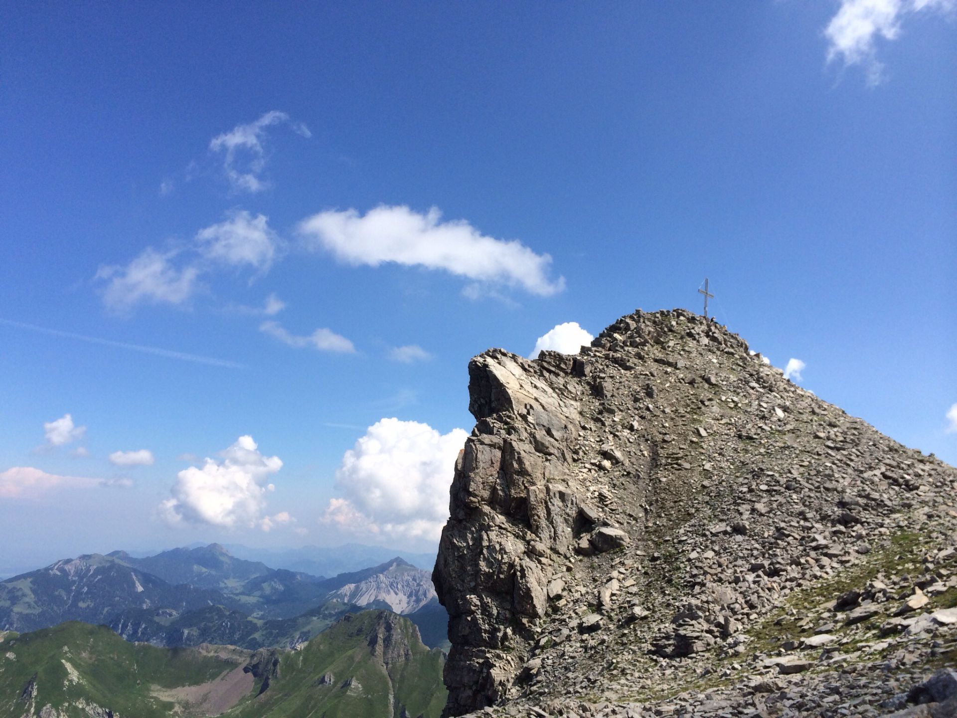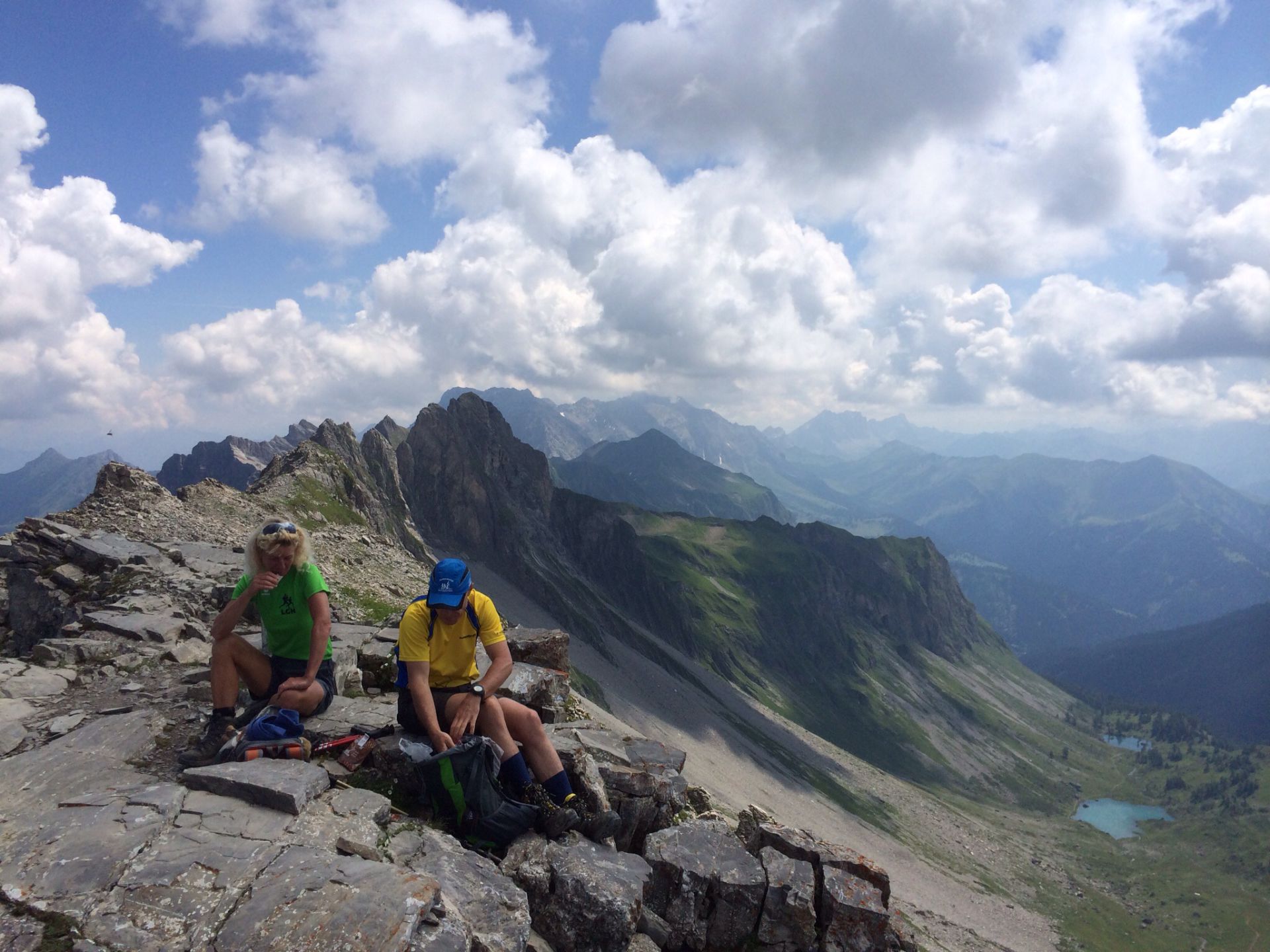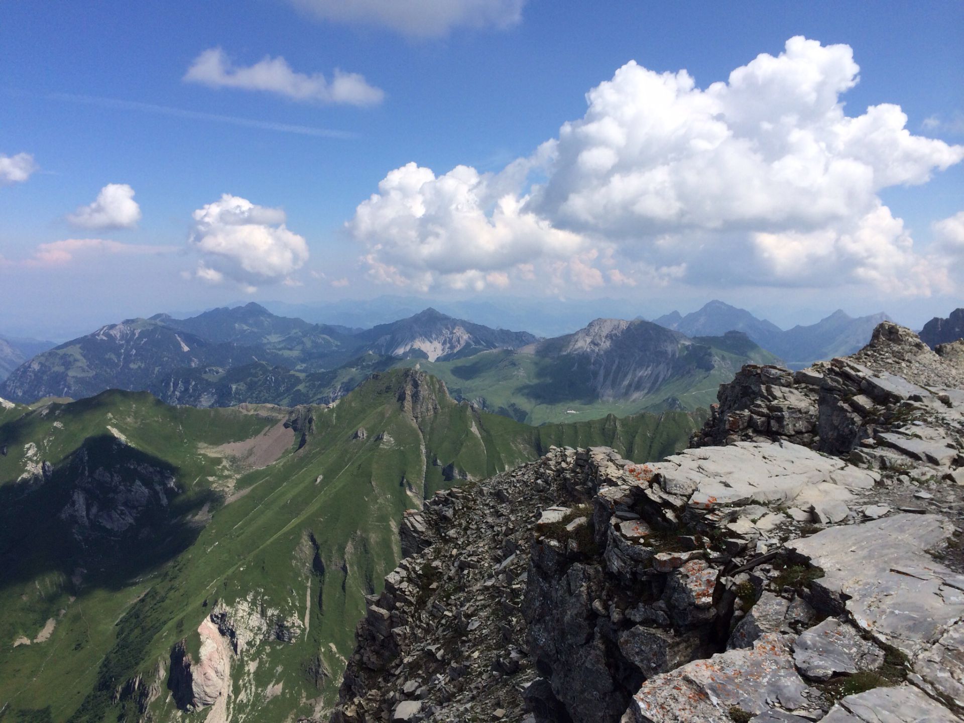 Mit etwas Zähnebeissen erreiche ich den klotzigen Gipfelaufbau und freue mich über die fantastische Weitsicht. Der Gipfel bietet mehr als ich erwartet habe. Der 360-Grad Blick führt vom Toggenburg über das ganze Vorarlberg ins wilde Rätikon. Weiter östlich ragt der Piz Kesch über alles hinaus, genauso wie südlich der Calanda.