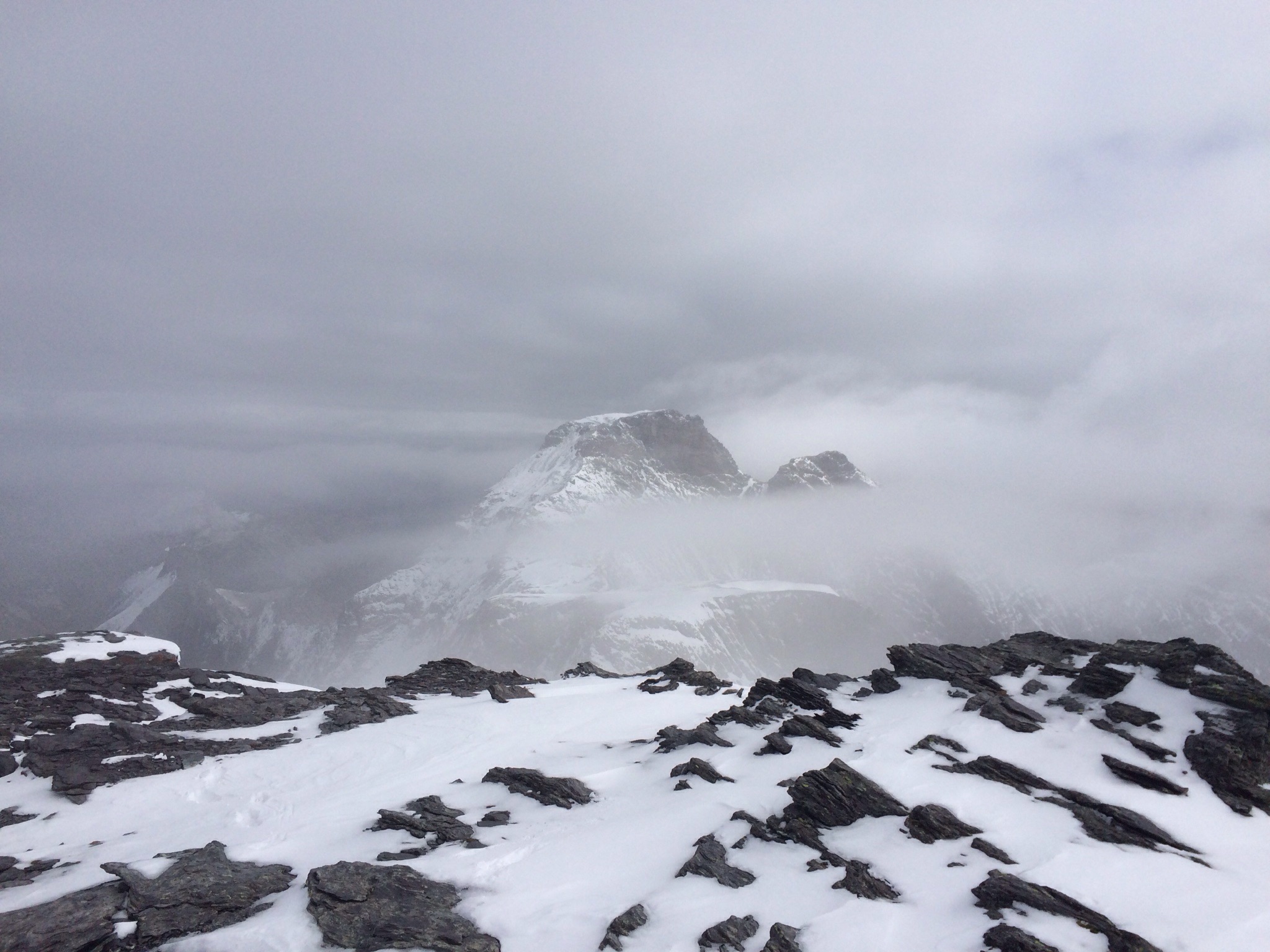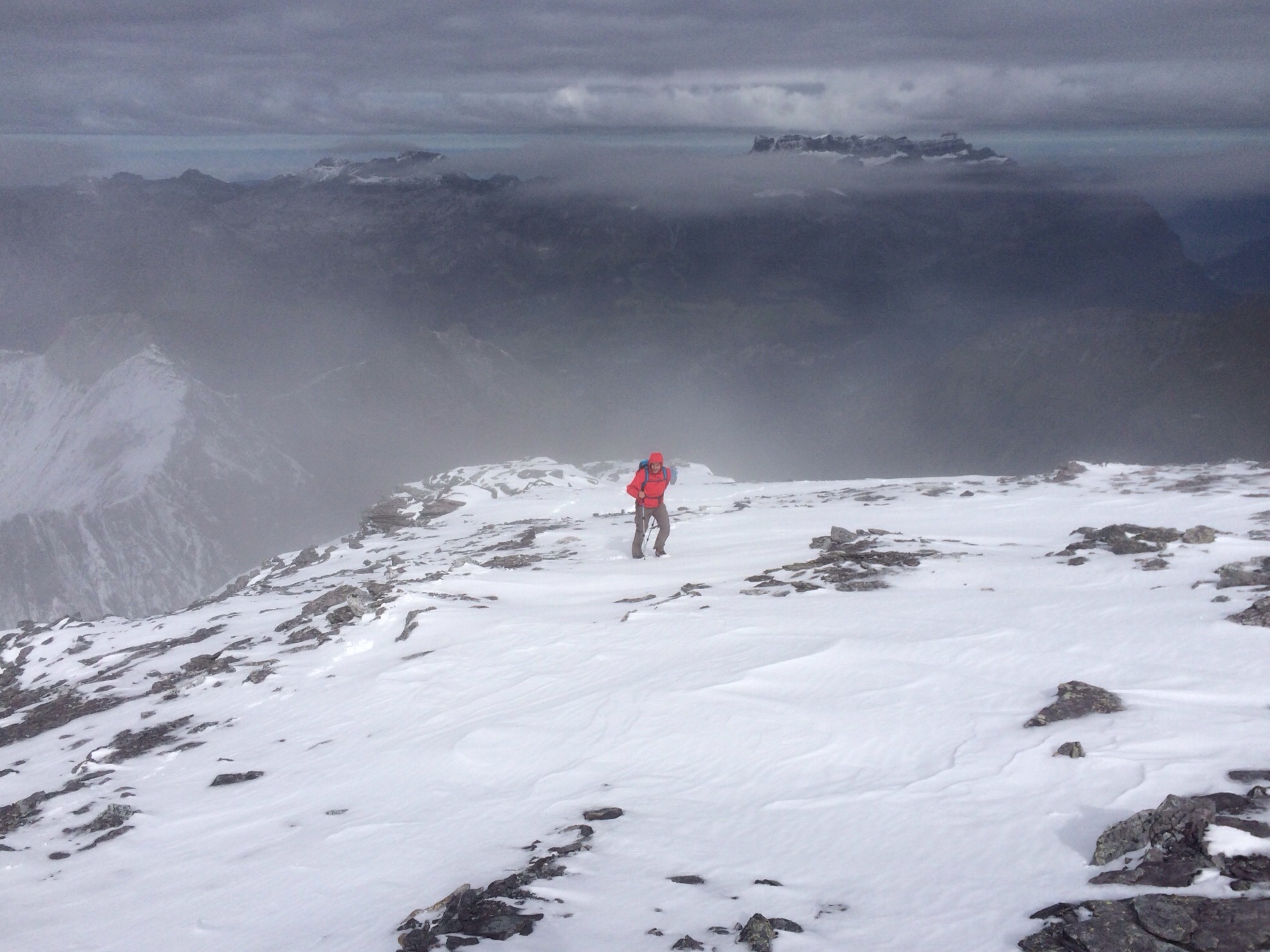 Die Bise bläst erbarmungslos. Kappe und Handschuhe sind ein Segen – gleichzeitig sehen wir über dem Mittelland die Sonne scheinen! Die letzten Höhenmeter über den langen Grat sind geschafft, wir sind froh, zumindest diesen einen Gipfel erreicht zu haben. Derweilen verschwindet der Hausstock in den Wolken. Ich erkläre meinen Bergfreunden, was man hier oben alles sehen würde… Immerhin sehen wir gut auf die monumentale Baustelle hinunter.