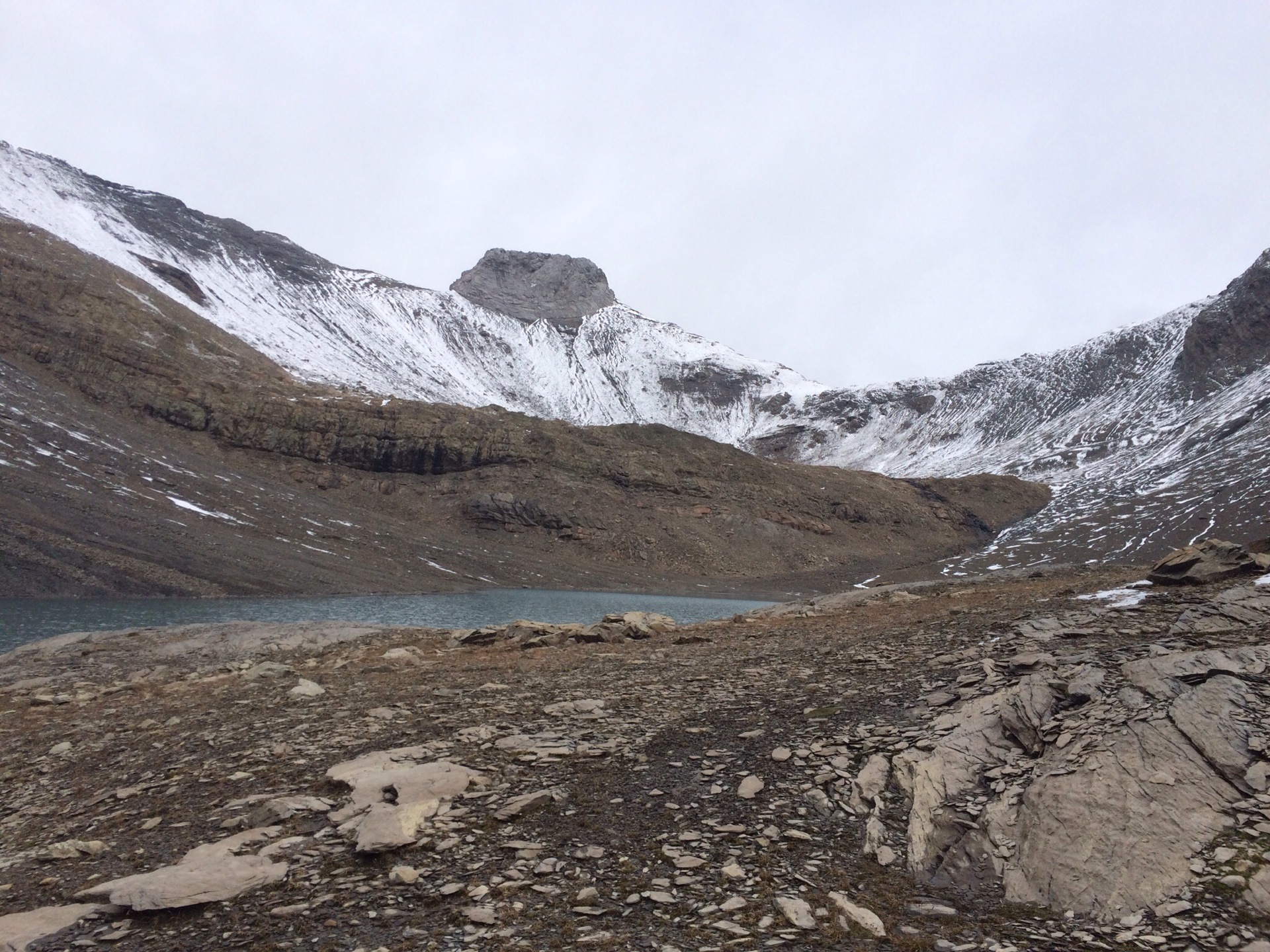 Wir verlassen den Wanderweg und folgen den Wegspuren am See in Richtung Ruchi. Das Gelände gleicht einer friedlichen Mondlandschaft, umrahmt von markanten Felszacken und verziert mit kümmerlichen Blümchen. Wir versuchen die hässliche Baustelle zu ignorieren. Es macht jetzt richtig zu, aber die Wolkendecke ist zum Glück hoch genug. Ich ärgere mich – so wird der Neuschnee nicht schmelzen, der uns jetzt begrüsst. Ich ahne, dass die Begehung des stark ausgesetzten Drahtseilfurggelis zwischen Ruchi und Hausstock zu gefährlich sein wird … und Schneewittchen wieder warten muss. Meinen Kumpanen will ich die Freude noch nicht verderben, so steigen wir in die steilen Schutthalden der Aufstiegsroute ein. Immerhin müssen wir den Weg nicht mehr suchen, das hat mich vor einem Jahr viel Schweiss und mindestens eine halbe Stunde Zeitverlust eingebrockt.