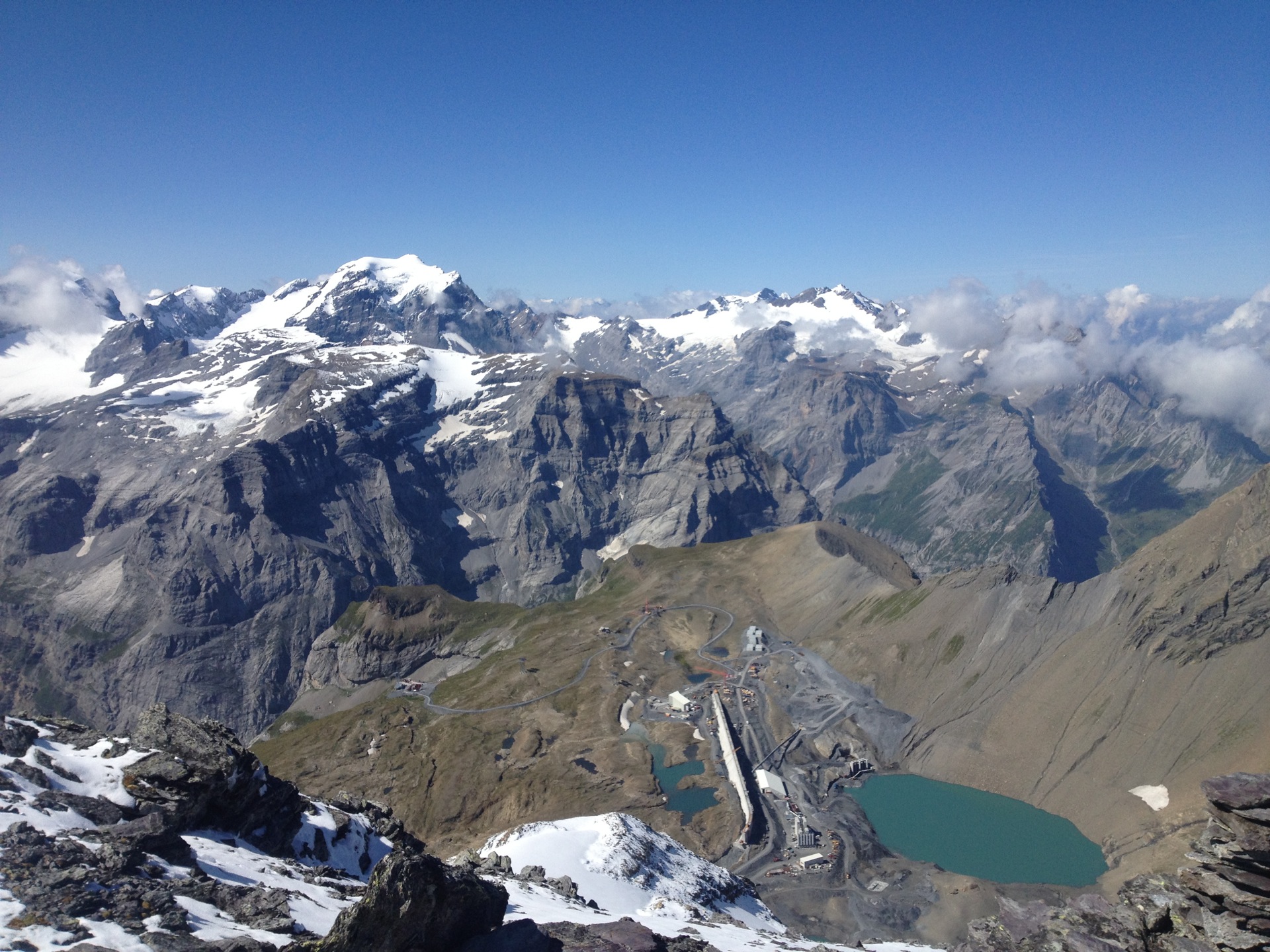 Die Tour beginnt mit dem sogenannten Chalchtrittli. Was früher ein besserer Schafpfad war, ist heute ein kunstvoll ausgebauter, mit zahlreichen Ketten gesicherter Weg. Etwas ausgesetzt, aber aufgrund des luxuriösen Ausbaus ungefährlich. Der neue Weg ist ein Nebenprodukt der Bauarbeiten am Milliardenprojekt „Pumpspeicherwerk Limmernsee/Muttsee“. Nach anderthalbstündigem Steigen erreichen wir die Muttsee-Ebene mit ihrer gewaltigen Baustelle. Schon gewöhnungsbedürftig, auf fast 2500m ü M. Bagger, Betonmischer, behelmte Arbeiter und ein Barackendorf anzutreffen. Die nette Muttseehütte will gar nicht mehr so richtig in die Gegend passen. Doch Ende 2015 soll der Spuk vorbei sein.