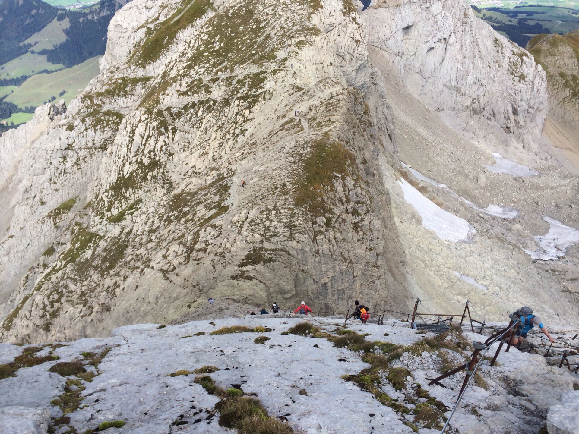 Jetzt beginnt die Schwerarbeit für unsere Knie. Unaufhörlich schwinden die Höhenmeter, zuerst zur Meglisalp hinunter. Chris meint, er hätte besser die Bahn hinunter genommen, aber fügt sich dann seinem zunehmend schmerzhaften Schicksal. Nach der langen Traverse hoch über dem Seealpsee (aufregende Tiefblicke!) folgt der steile Schlussabstieg durch das Hüttentobel, wo die Bremsen nochmals richtig heisslaufen. Zurück in Wasserauen – und 1700 Höhenmeter tiefer – freuen wir uns über das kühle Bier. Freude macht auch die fast halbleere Appenzellerbahn, wo wir unsere müden Beine und die schlottrigen Knie nach dem langen Tag hochlagern können.