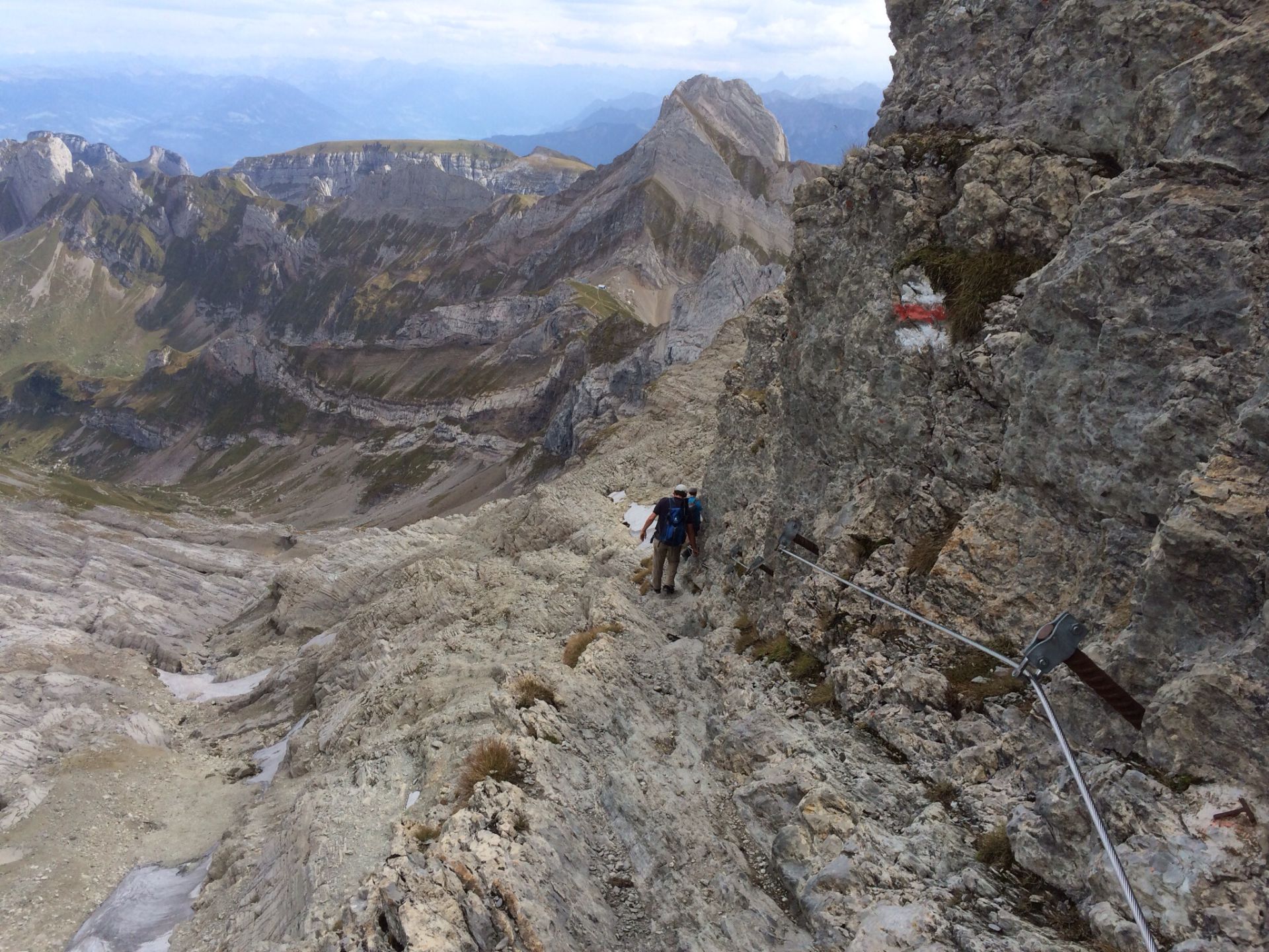In der Säntisüberbauung kommt man sich zuweilen wie im Glattzentrum vor, aber das Gipfelrestaurant ist gut. Die Appenzeller Spezialitäten munden. Wir bleiben dennoch nicht lange, zu sehr sehnen wir uns nach der Bergruhe zurück. Sie kommt keine fünf Minuten später – auf dem ausgesetzten, aber gut gesicherten Lisengratpfad sind wir wieder fast alleine.