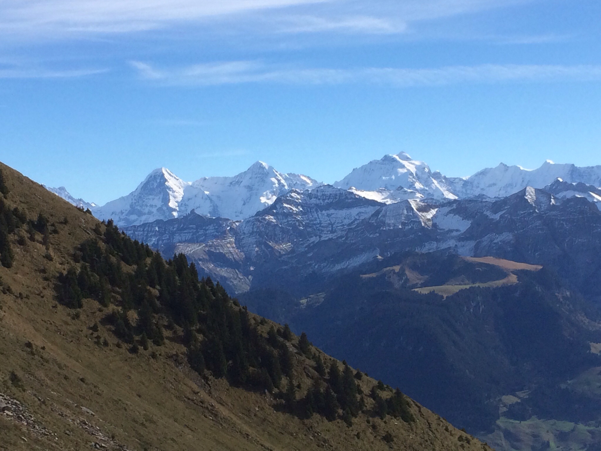 Steil geht es über Wiesen und durch Tobel weiter hinauf. Erholungsphasen sind auf dieser Route nicht vorgesehen, unablässig müssen Höhenmeter gefressen werden. Dafür zeigen sich bald die Wunderwerke des Berner Oberlands: Zunächst guckt die Blüemlisalpgruppe hervor, bald lässt sich auch das EMJ Trio (für einmal ein anderes Wort für „Eiger, Mönch und Jungfrau“) blicken.