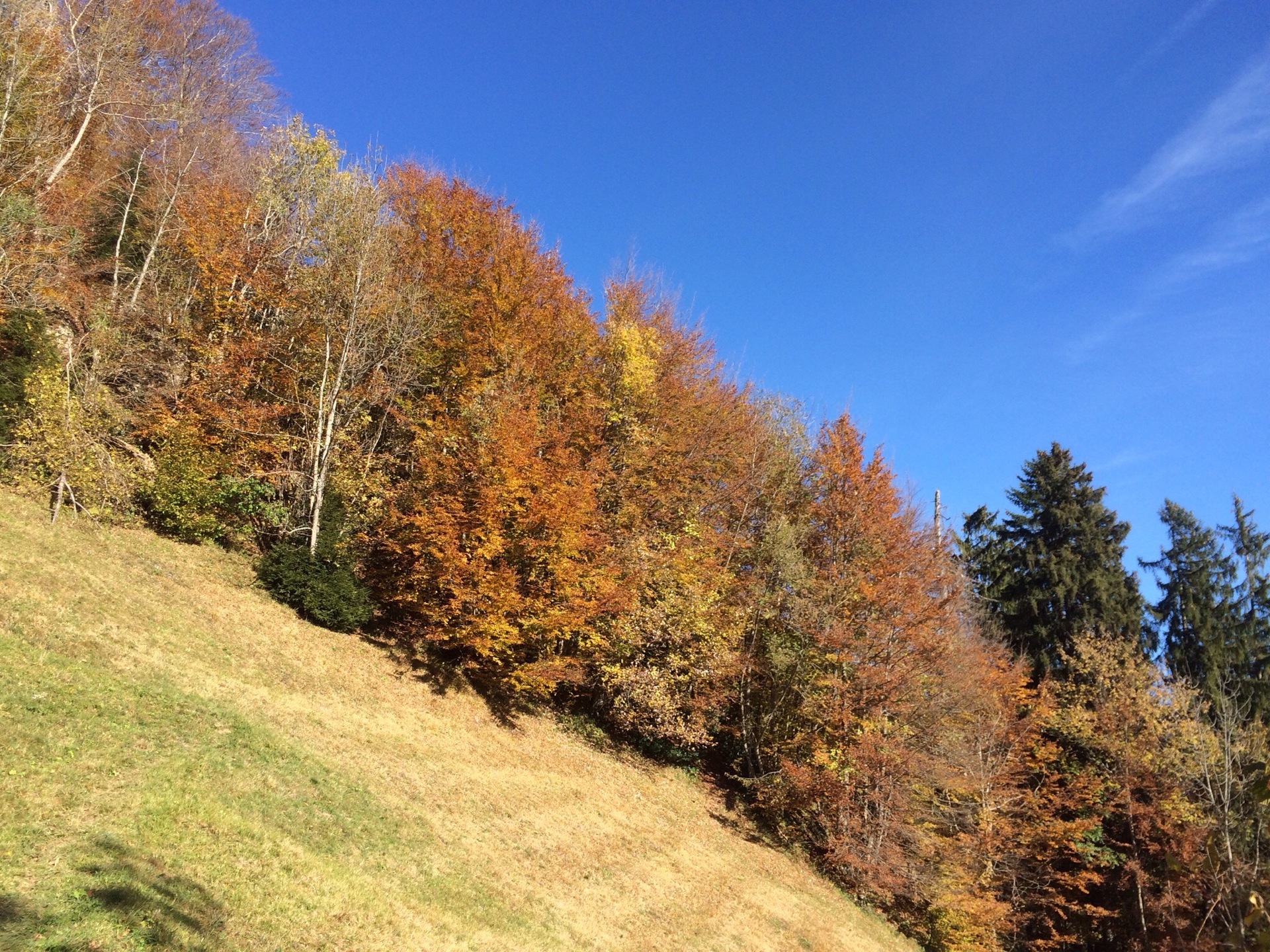 Nun erfolgt der Rest des Abstiegs über die immer noch erstaunlich grünen Wiesen und durch den lichten Wald. Der erste andere Berggänger kreuzt hier unseren Weg. Unser Tempo verlangsamt sich – die sanfte Sonne und der blaue Himmel sorgen für derart schöne Landschaftsansichten, dass wir immer wieder stehenbleiben und fotografieren müssen.