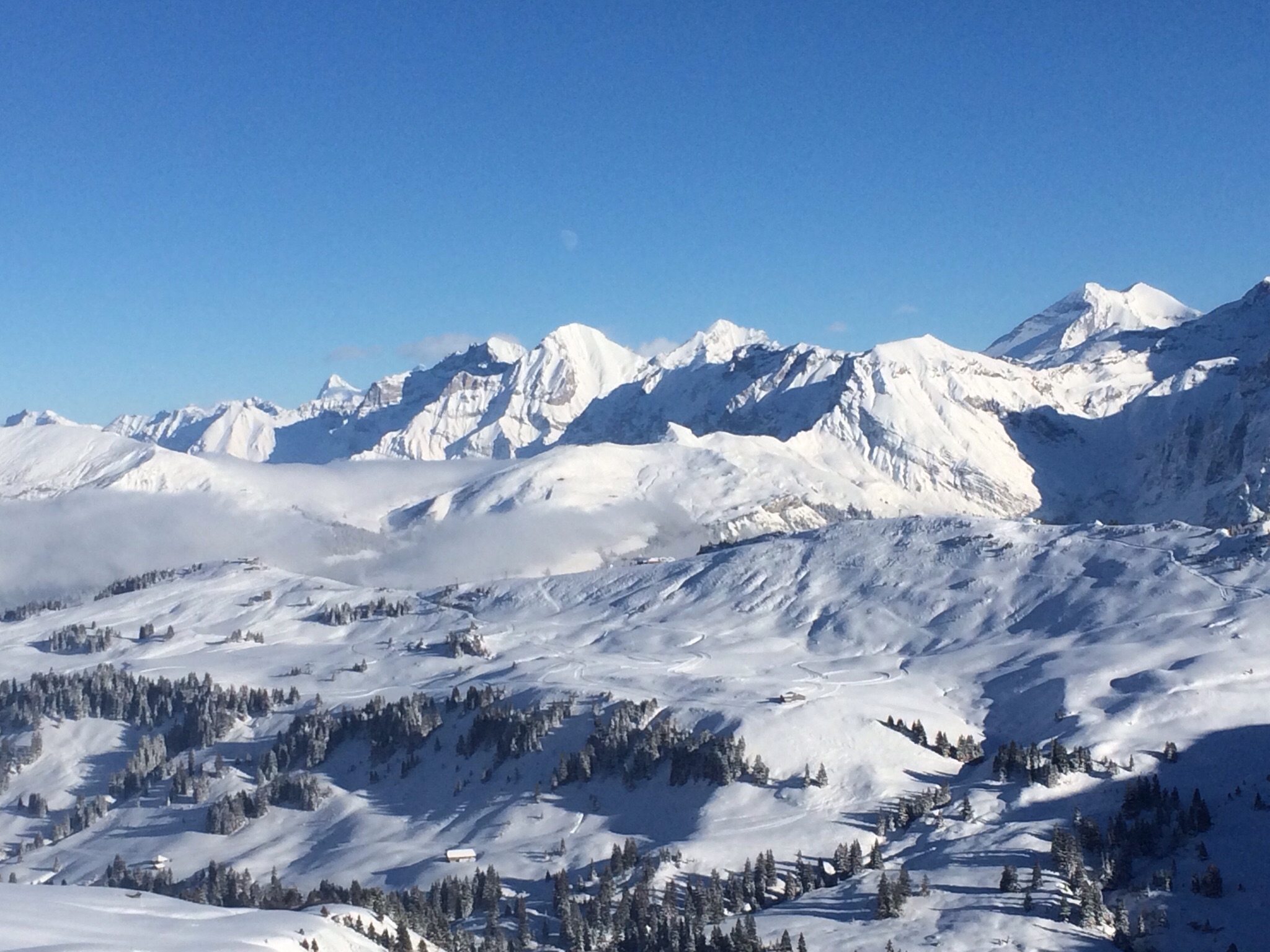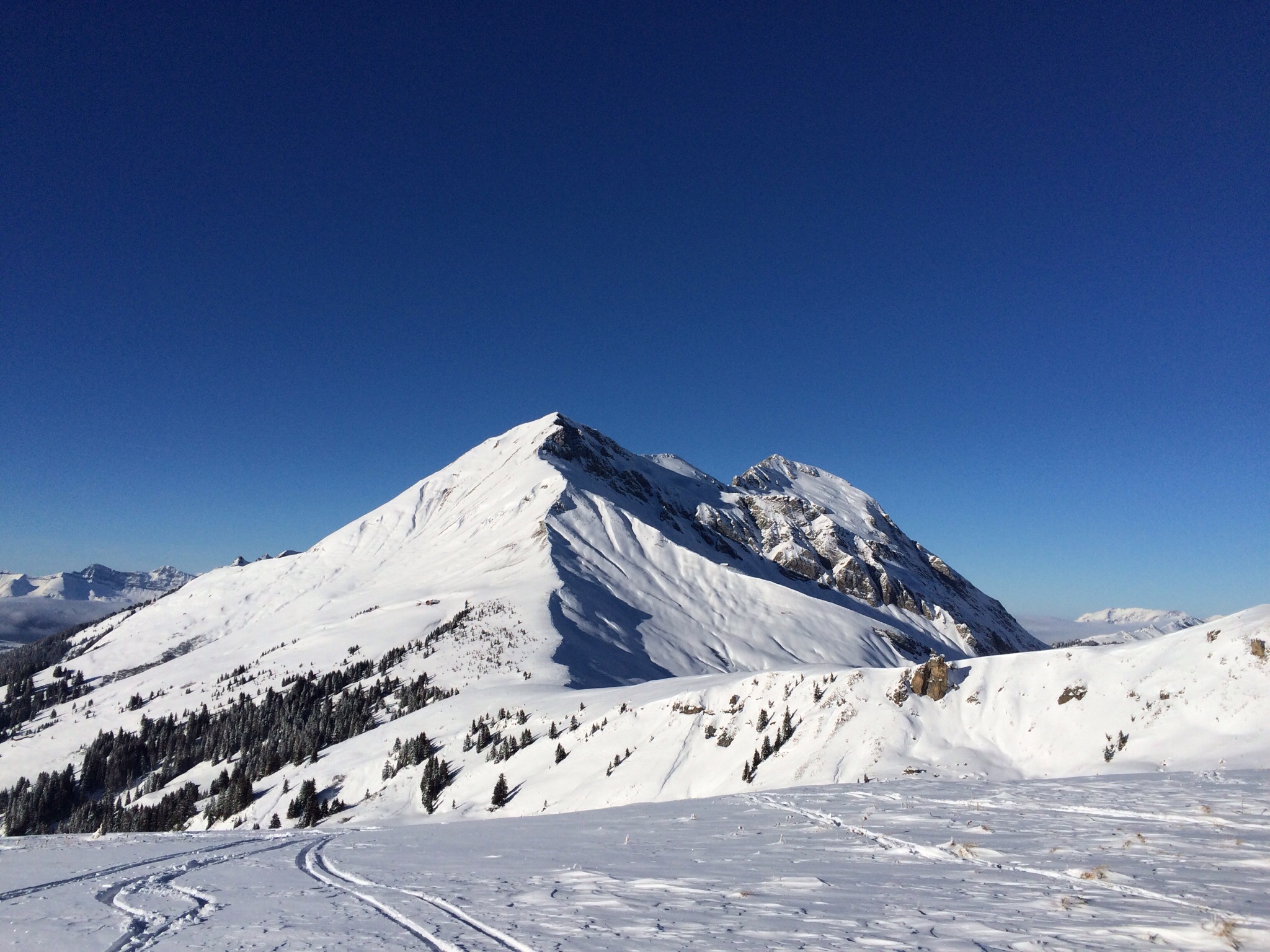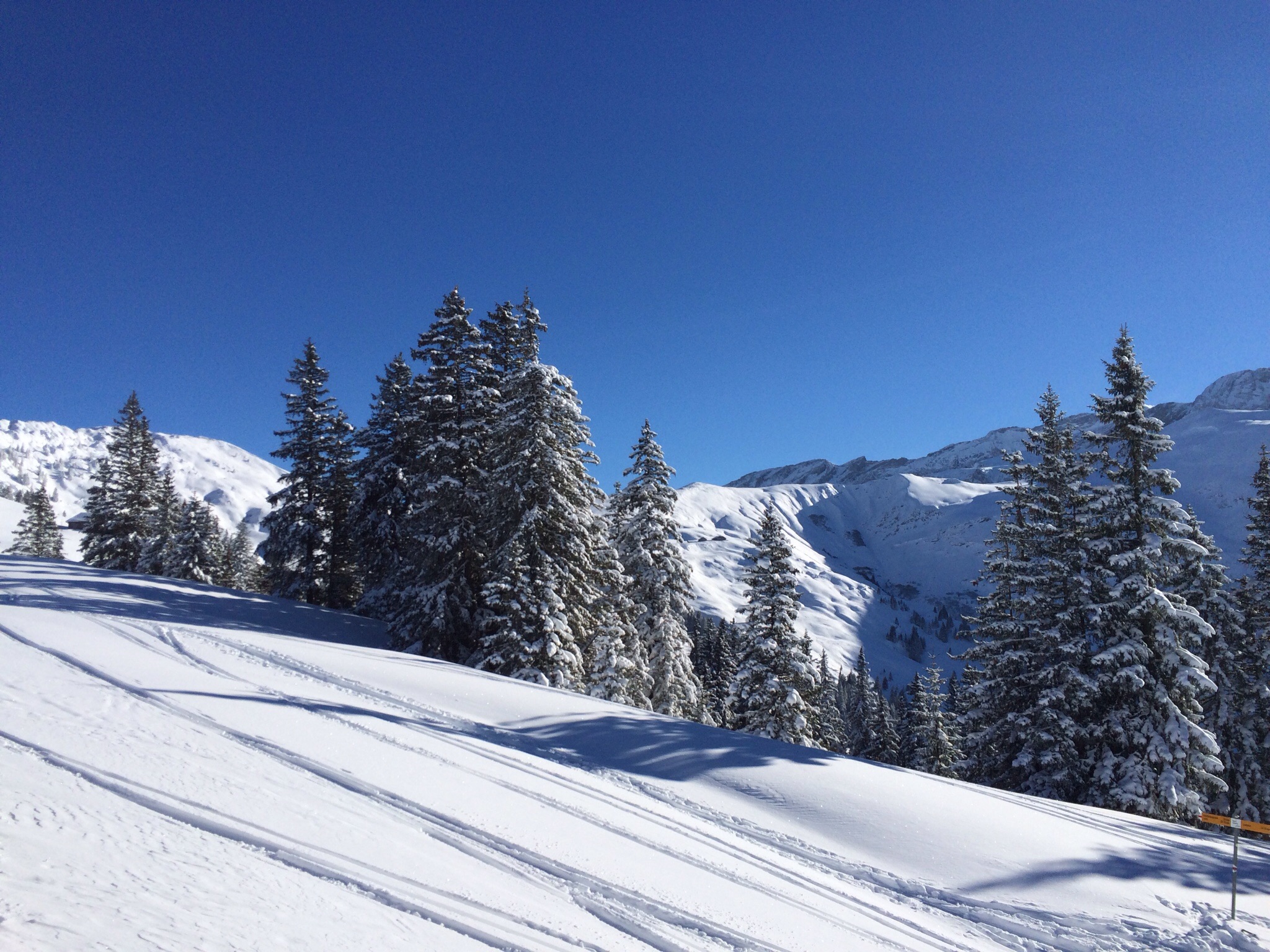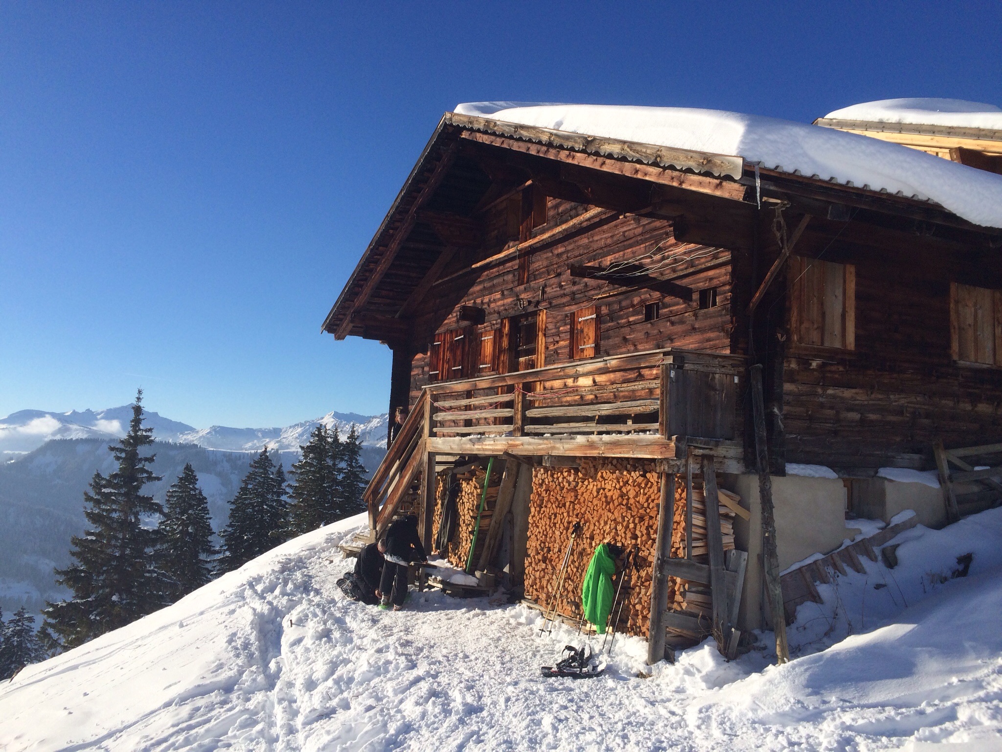 Wie erwartet hat schon jemand vorgespurt, der frische Schnee der letzten Tage ist tief und pulvrig. Trotzdem kommen wir nur langsam vorwärts, da das „Ah“ und „Oh“ an diesem herrlichen Tag insbesondere Evi zu ununterbrochenem Fotografieren verleitet. Auf 1800m folgt der obligate Halt bei einer Alphütte, die schöner nicht gelegen sein könnte und Genuss pur auf der Bank an der sonnengedunkelten Holzwand bietet. Mandarinli und Sandwiches schmecken einfach besser sitzend als stehend im Schnee…
