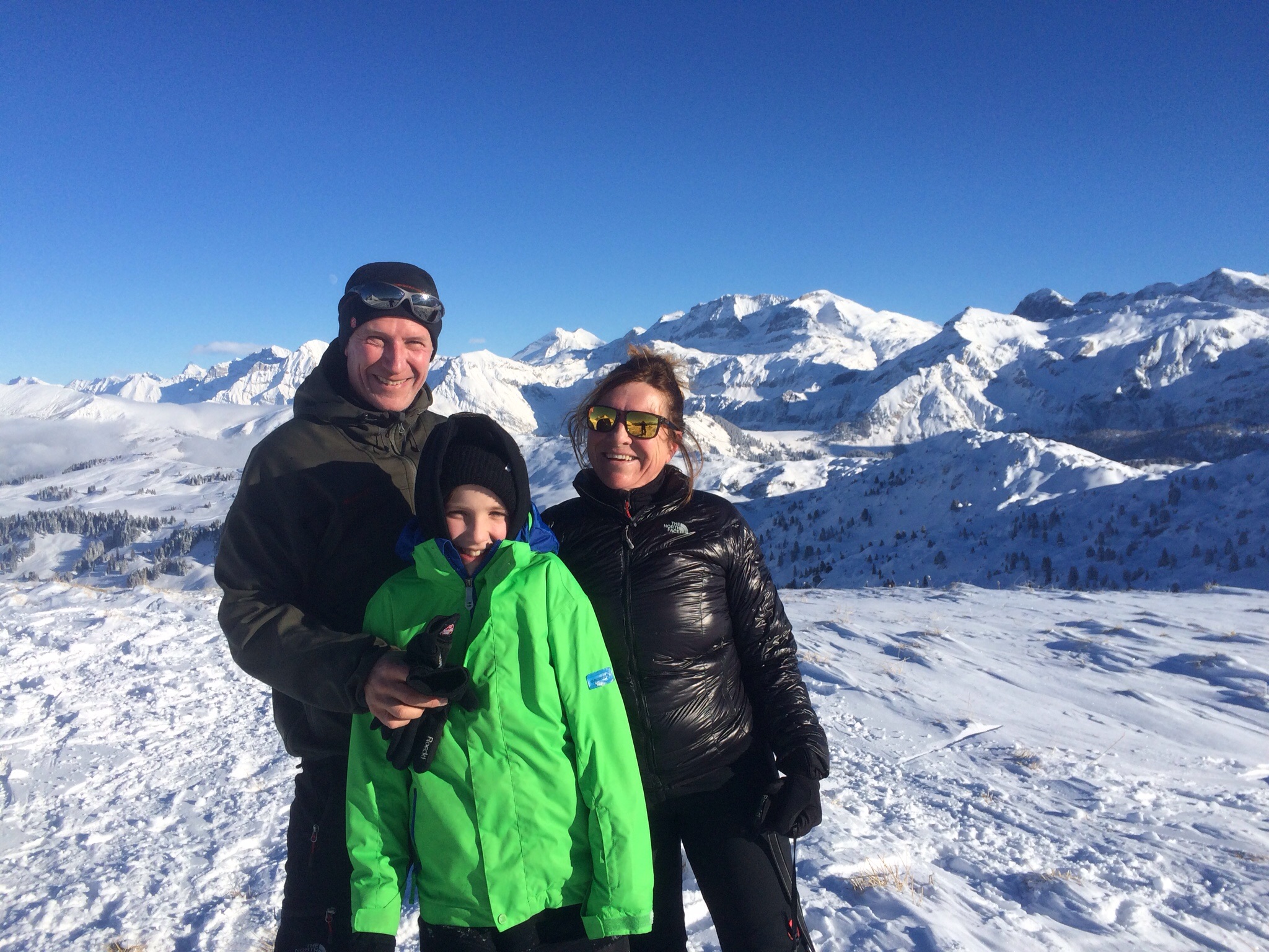 Auf dem Gipfel bläst eine kräftige Ostbise, die wir angesichts der Schneewolken über Wildhorn und Spitzhorn schon erwartet hatten. Aber man hat ja den Rucksack voll mit wunderbarer Funktionswäsche, Handschuhen und Mützen, sodass einmal angezogen genug Zeit bleibt, die grandiose Aussicht zu geniessen. Neben Wildhorn und Wildstrubel sticht in der Ferne besonders der Eiger mit seiner tiefverschneiten Westwand hervor. Jan Lukas meint, dass er von hier aus wie das Matterhorn aussieht.