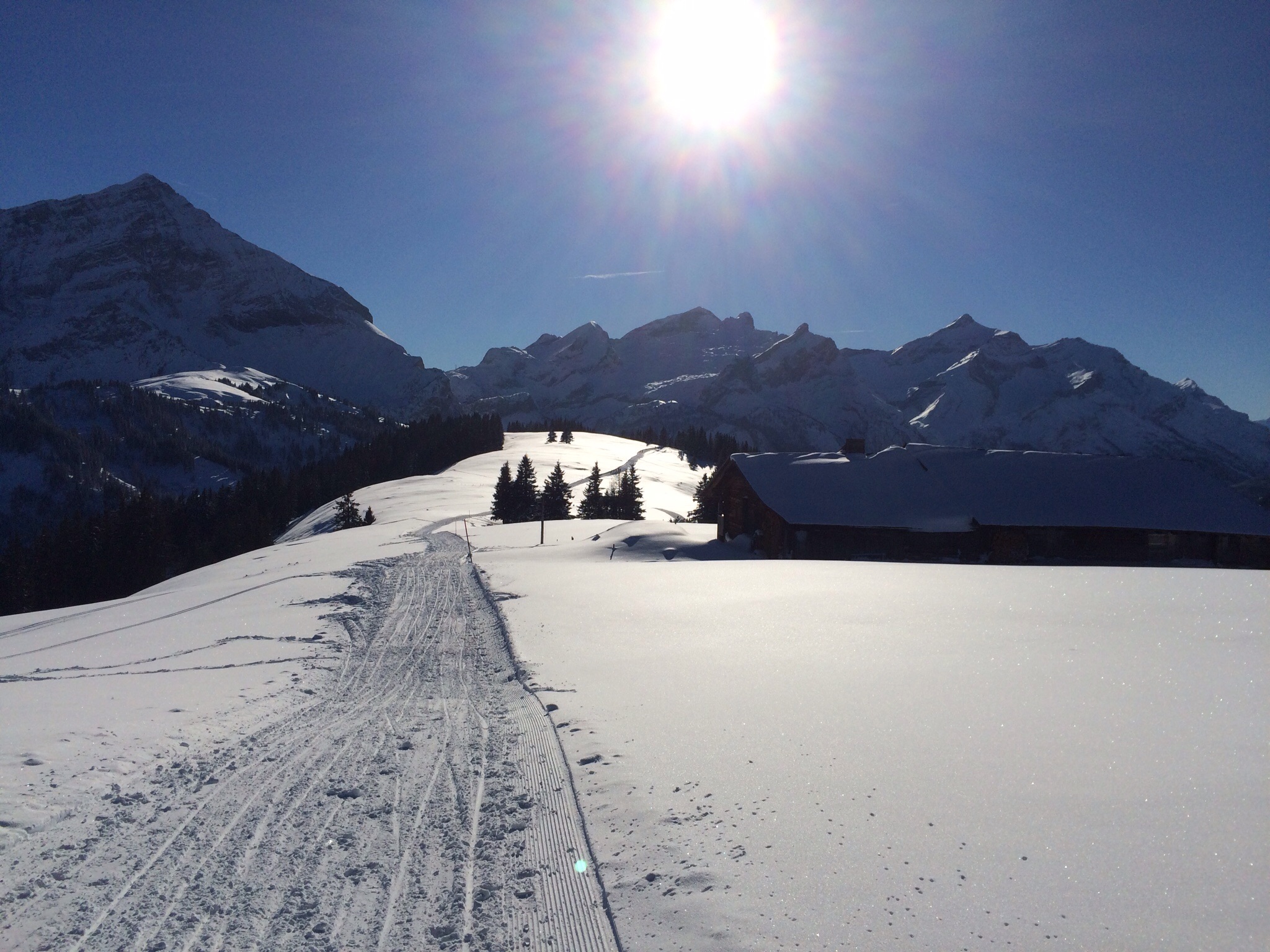 Die tiefstehende Sonne macht aus den weiten Schneefeldern Prinzessinnenkleider, die mit Millionen von glitzernden Diamanten versetzt sind. Wenn das Laufen über den noch nicht ganz gesetzten Schneepfad nicht so anstrengend wäre, könnte man endlos weiterwandern umd staunen. Doch nach einer Stunde stehen wir am Waldrand oberhalb des Chrinnepasses und bereiten uns auf die Abfahrt vor, die ziemlich steil anfängt. Nach den ersten paar Hundert Metern Einfahren ist deshalb ein Halt beim Bergbäsebeizli angesagt, das an sonnigen Wintertagen von einem betagten Ehepaar betrieben wird. Die Schümlipflümlis müssen offenbar keiner Erfolgsrechnung standhalten, so grosszügig ist das Hochprozentige darin vertreten.