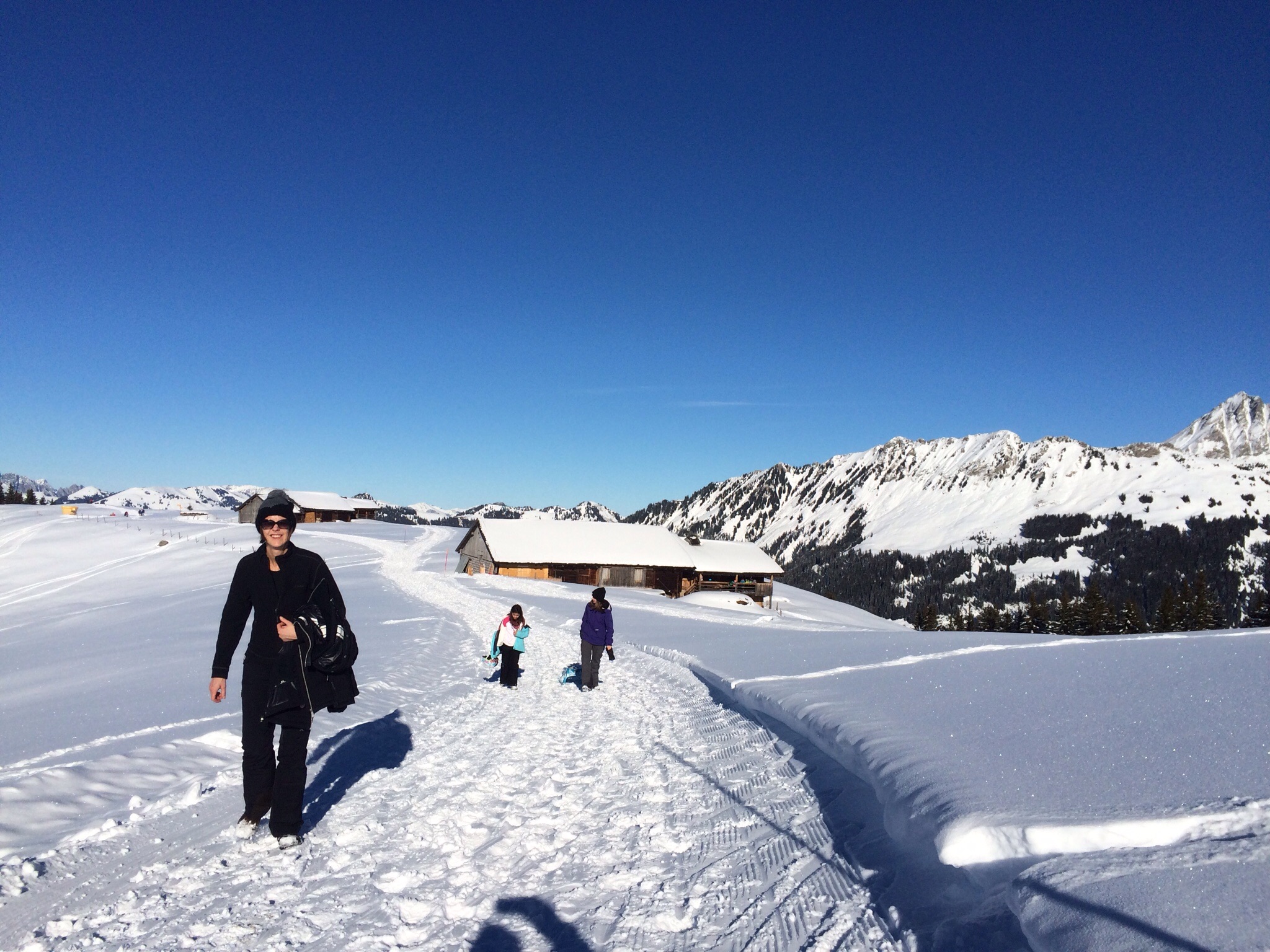 Nur wenige Minuten nach dem Abmarsch sind wir alleine in der Natur. Die verschneiten Bäume, der tiefblaue Himmel und die makellose Fernsicht machen unsere Freunde aus Kalifornien fast sprachlos. „Only 3 hours from Zürich – unbelievable!“. Die Route über die breite Bergrückenlandschaft ist abwechslungsreich, wir passieren, mal schlittelnd, mal laufend, verschiedene Alpen. Auf einer dieser Alpen findet im Sommer einer der legendären „Suufsunntige“ statt, an denen jeweils die hübscheste Kuh – mit Blumen geschmückt – den Tanz eröffnet.