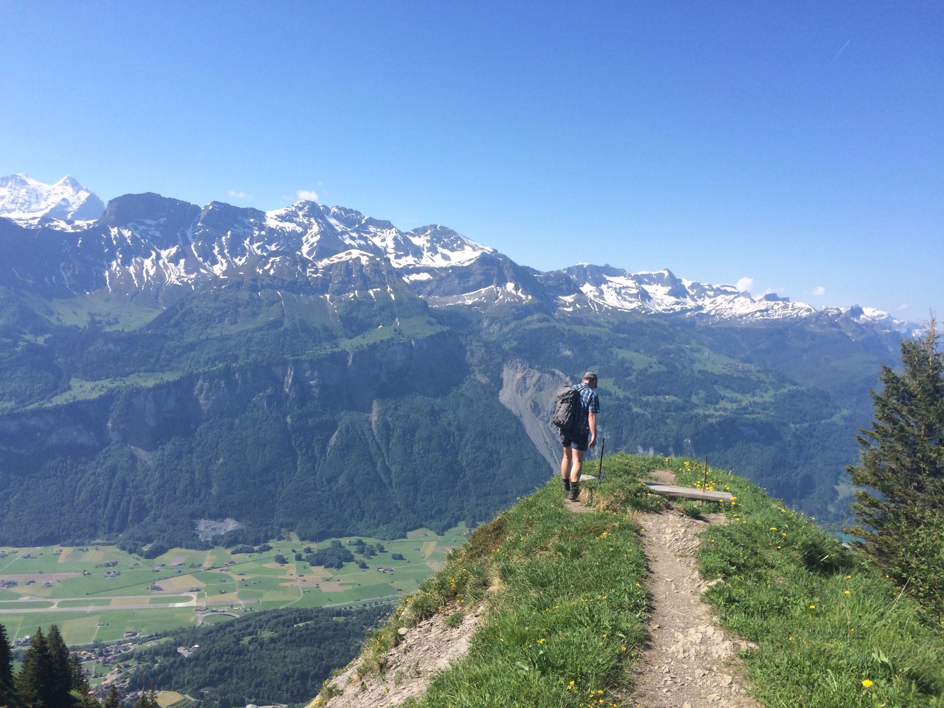 Die wunderbare Ruhe auf diesem vielbereisten Ausssichtsberg hat ihren Preis – wir müssen hinunterlaufen. Wir folgen in etwa dem Verlauf der Bahnstrecke bis zur Mittelstation auf der Planalp. Über 1000 Höhenmeter müssen auf einer vergleichsweise kurzen Strecke abgebaut werden. Die Knie sind gefordert, aber sie halten gut. Der Weg ist hier gut ausgebaut und die Aussicht auf den See und diverse kuriose Gratzacken spannend. Umgekehrt möchte ich diese Strecke aber nicht begehen, der ständige Anblick der nicht näher kommen wollenden Bergstation muss etwas demotivierend sein.