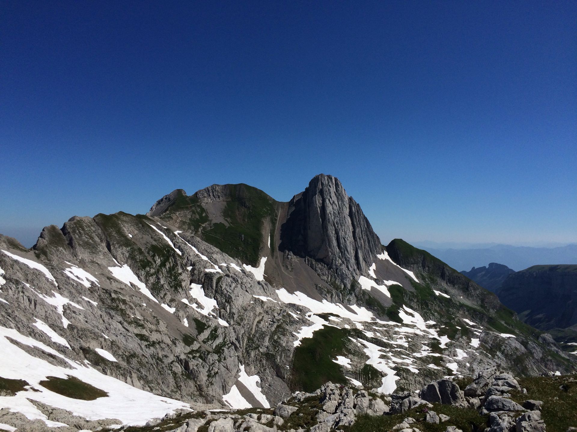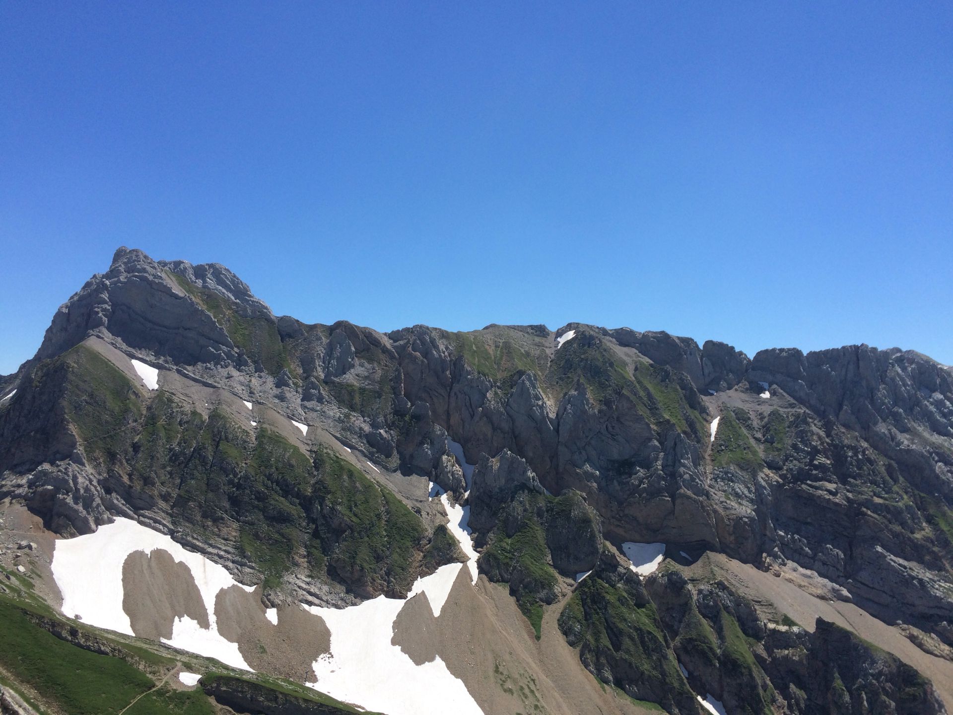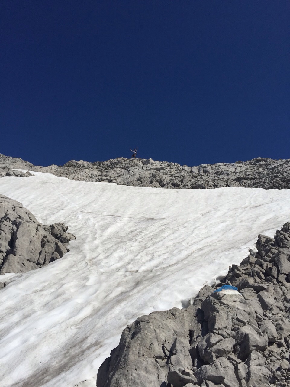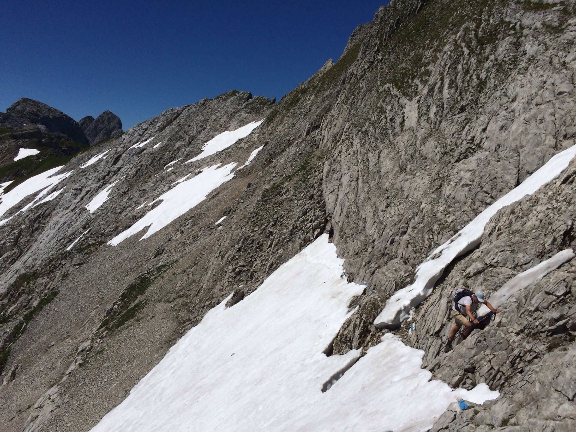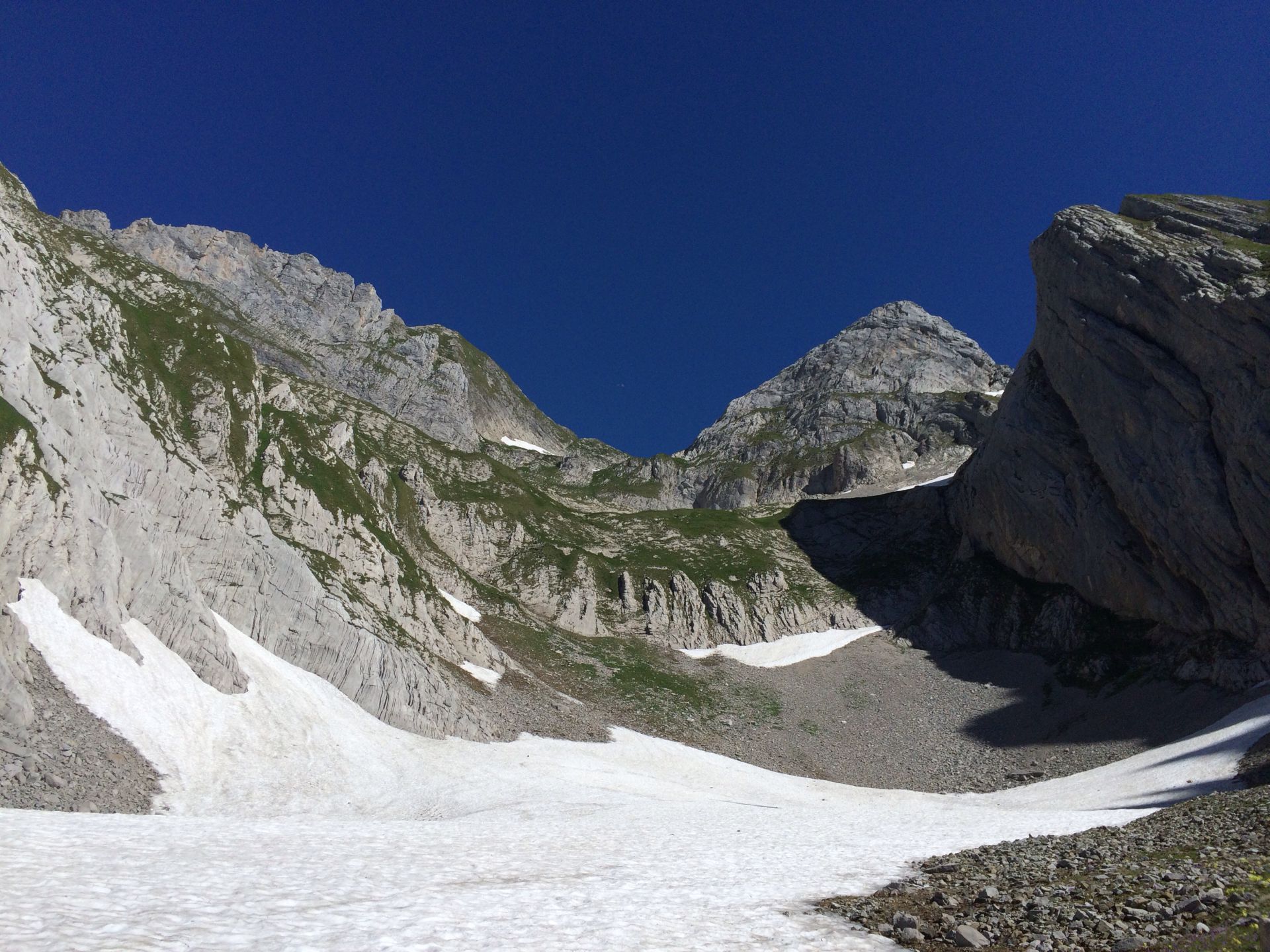 Bei fantastischem Hochsommerwetter mit bester Sicht ziehen wir los. Die Churfirsten recken ihre Köpfe in die Höhe, die Kühe ihre Nasen tief ins frische Gras. Auf der steilen Rampe in Richtung des unteren Schafbodens bestaunen wir den von Hand angelegten Weg, der den Kühen und Ziegen den sicheren Aufstieg in dieses Hochtal erlaubt. Bald lassen wir die Weidelandschaft hinter uns und betreten die alpine Welt am Fuss des Schafbergs. Eine einsame Gämse sitzt auf einem kühlenden Schneefeld. Sie lässt sich von uns nicht aus der Ruhe bringen.