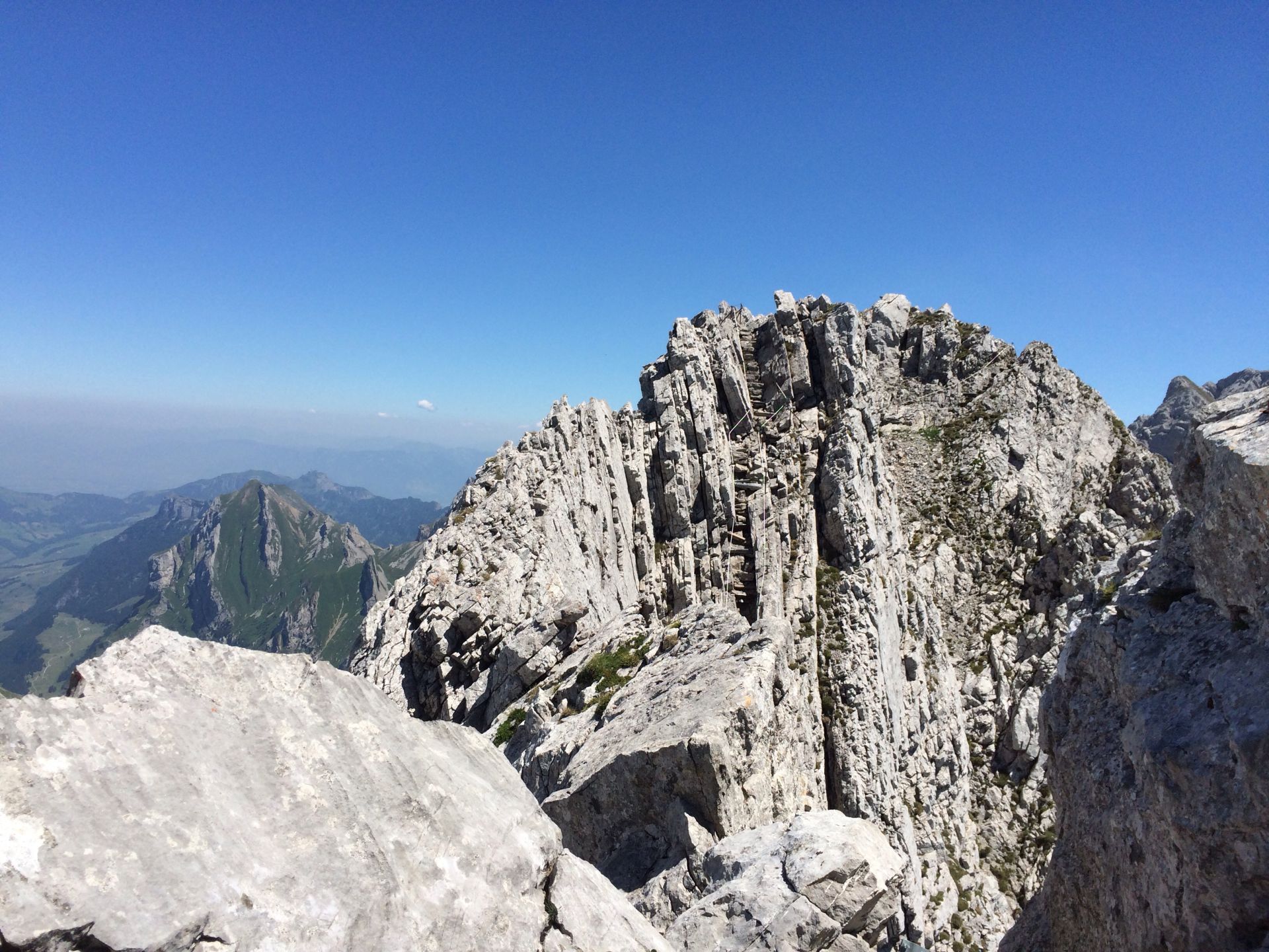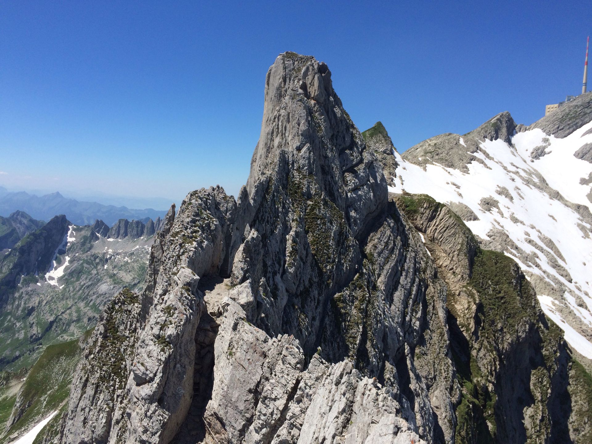 Im Rotsteinpass-Beizli stärken wir uns mit Rivella und Schorle und nehmen dann den Lisengrat unter die Füsse. Noch fehlen weitere 400 Höhenmeter zum Säntis. Die letzte Stunde vergeht wie im Flug, die Überschreitung des Lisengrats ist ein weiterer Höhepunkt. Der kunstvoll angelegte Weg, der im Bereich der Wisswand etwas Nerven und Vertrauen ins Sicherungsmaterial voraussetzt, geizt nicht mit Reizen. Tiefblicke in die nördlichen Täler zur Meglisalp, zum Marwees und zum Seealpsee erfreuen genauso wie der Rückblick zum Jöchli und zum Nädliger. Wenn man es nicht besser wüsste, würde man von hier aus gesehen die Fliswand für unpassierbar halten.