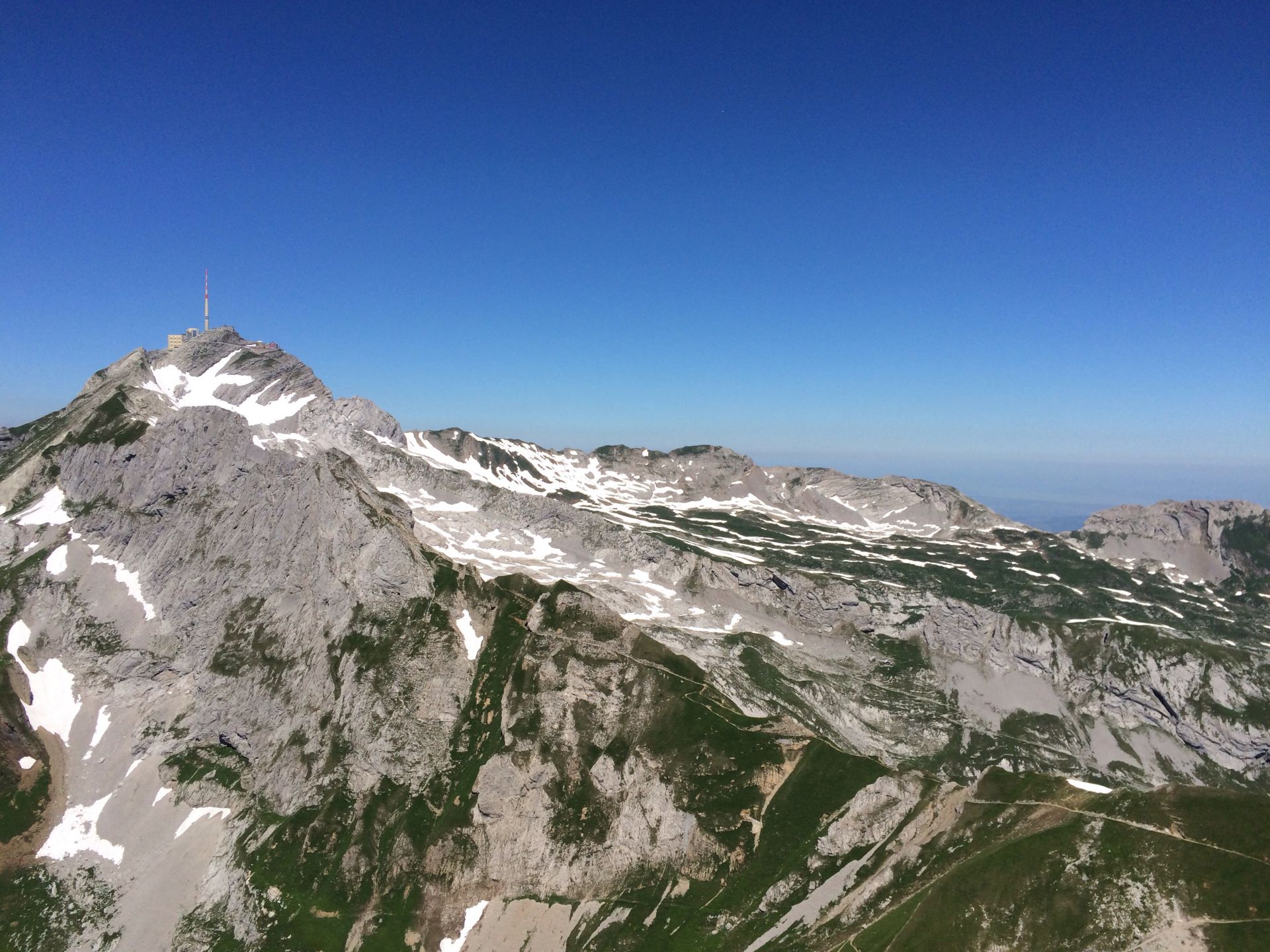 Kurz vor dem Gipfel picknicken wir, geniessen die Sonne und die Ruhe. Dann überwinden wir die letzten Passagen des Grats und erreichen den Säntis, wo uns die Massen erwarten. Wir stürzen uns gleich in die Bahn und freuen uns nach dem knieschonenden Abstieg auf das kalte Panaché auf der Schwägalp. Und Pascal? Er tritt dem Fanclub bei.