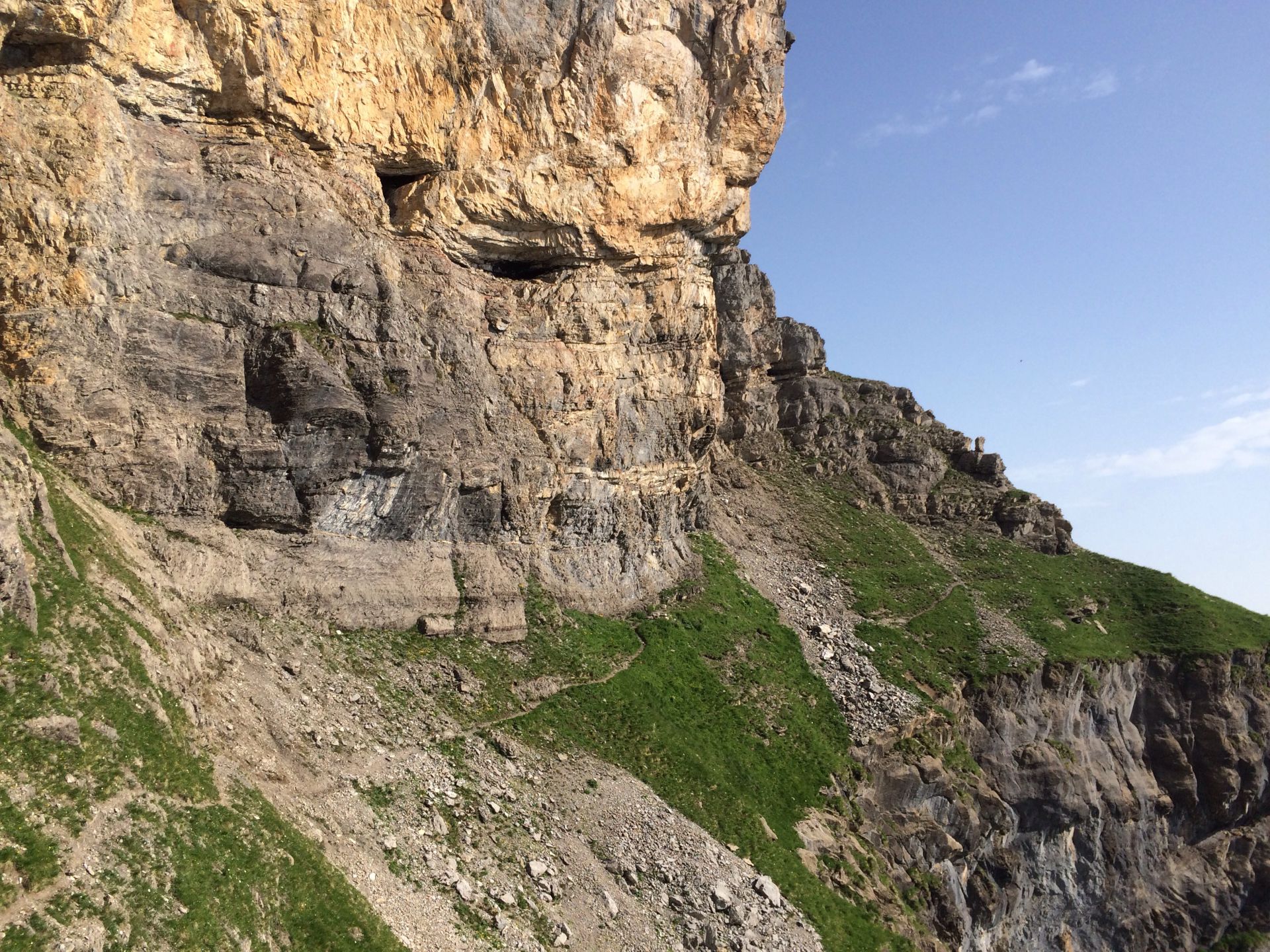 Ab jetzt braucht es etwas Mut, und vor allem muss es trocken sein. Der Pfad schlängelt sich mehrere Hundert Meter um die schroffen Felsen des Gipfelturms herum. Trocken ist die Passage ziemlich harmlos, nass sind die abwärtsgerichteten Platten kaum passierbar. Die vielen Runsen führen direttisima 1000m nach unten, wo sich das Gelände erstmals etwas abflacht. Ein spannendes Erlebnis in einer einzigartigen Kulisse! Nur zwei kleine Restschneefelder verlangen etwas mehr Vorsicht als mir lieb ist. Ein paar Ketten wären nicht schlecht hier.