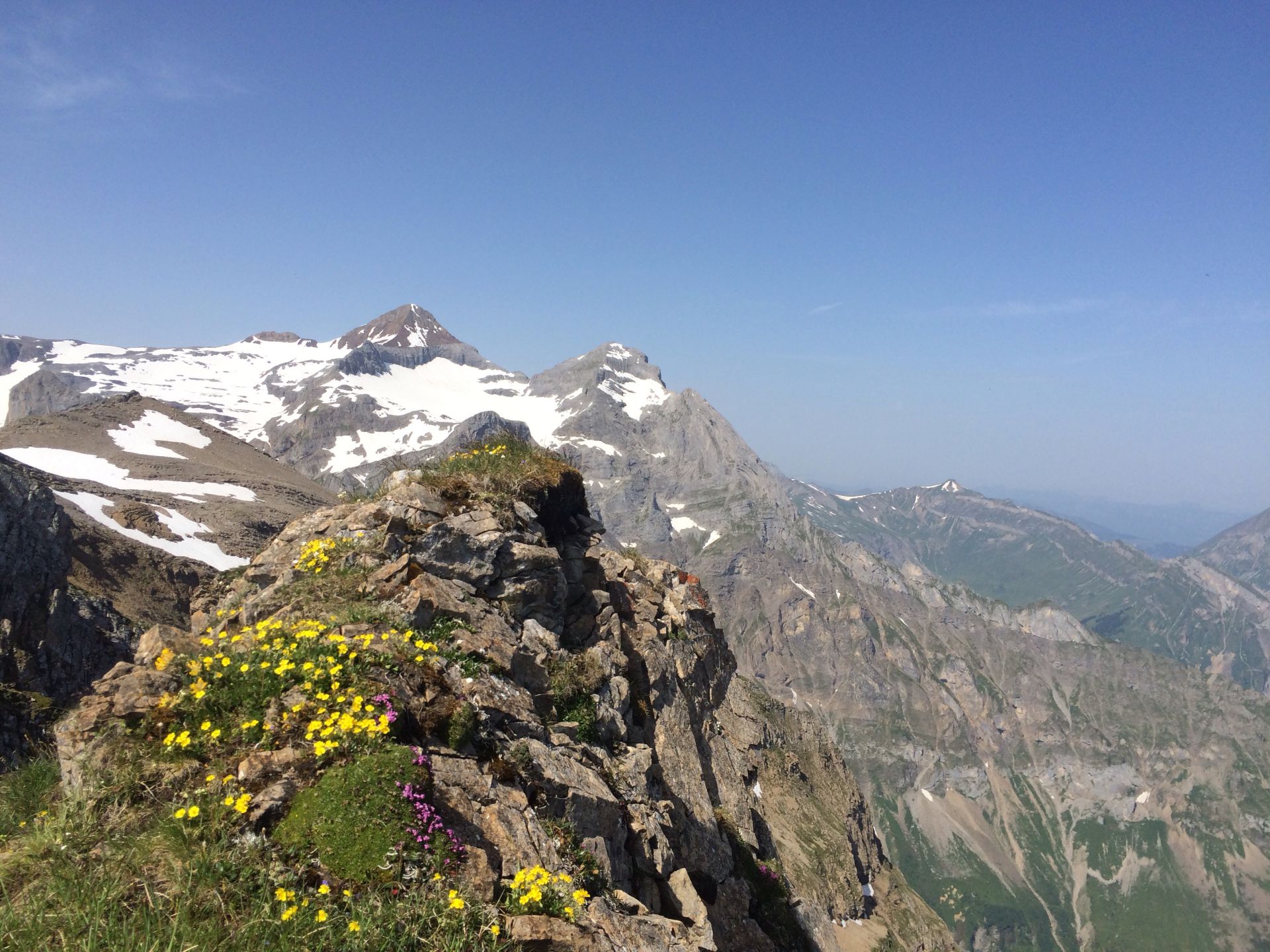 Auf der Umgehung der Wand folgt wieder Gras, über das steile Vordere Gämsfeld erreiche ich – hin und wieder mit Hilfe der Hände – den Gipfelgrat. Kurz trocken schlucken: Im Süden das tiefgrüne Gras voller Alpblumen, die in allen Farben leuchten – auf der anderen Seite ein eiskalter, fast senkrechter Abgrund.