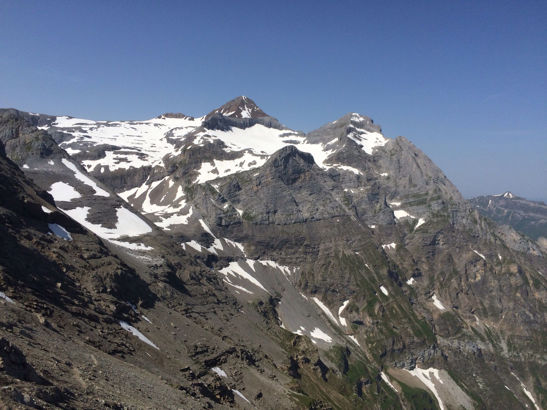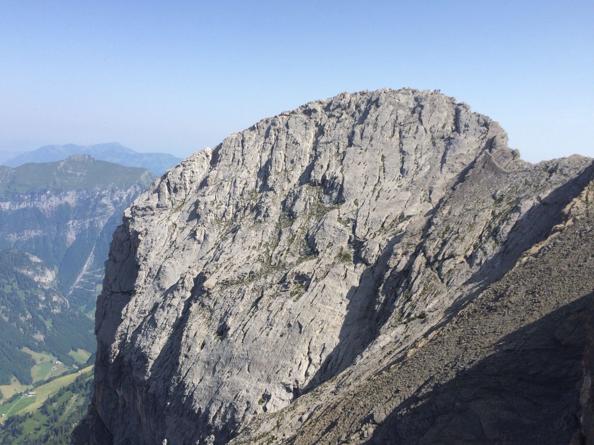 Der Abstieg folgt in umgekehrter Richtung noch etwas länger dem Grat. Nach einer kurzen Gegensteigung (diesmal entschärft durch eine Kette) und erneut mit leichter Kletterei erreiche ich die grauen Schutthänge, über die mich der Weg über die steil abfallenden Flanken auf die Musenalp hinunter führen wird.