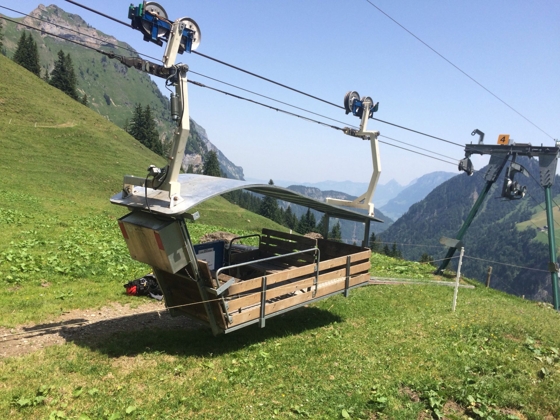 Auf der Musenalp stecke ich Kopf und Rumpf in den Brunnen, so heiss ist es inzwischen geworden. Die Wirtin bringt mir einen wunderbaren Wurst-Käse-Salat und einen Liter Schorle, dann noch ein grosses Panaché. Die Musenalp-Beiz ist einer meiner Big Favourites unter den Alpbeizlis! Schliesslich lasse ich mich in der Sänfte (siehe Foto) ins Tal tragen und spaziere die letzten 15 Minuten zum Auto zurück.