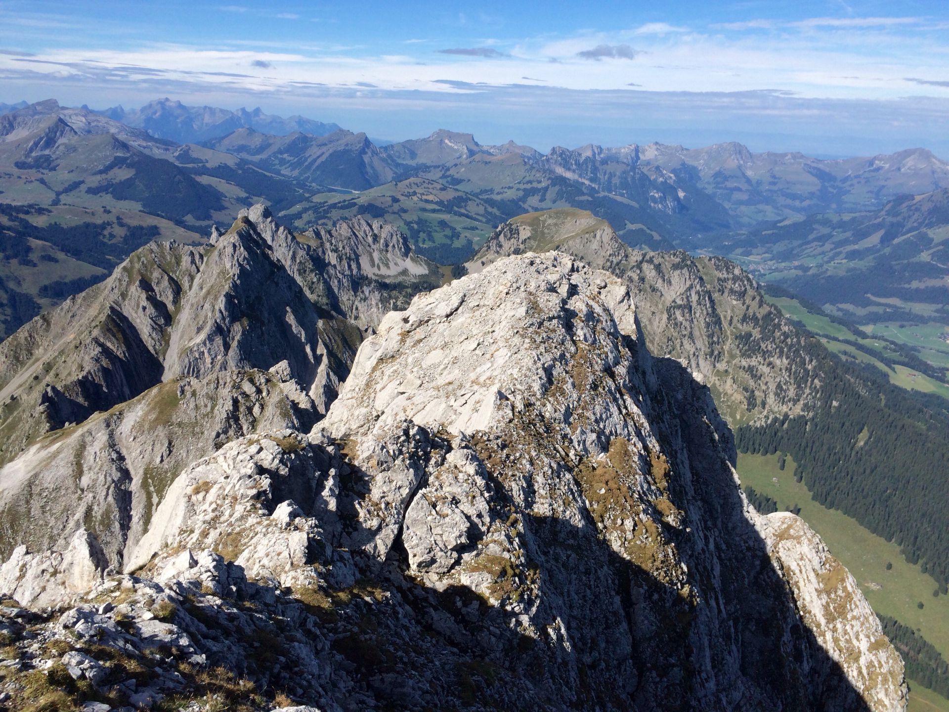 Die Gummfluh bietet eine grandiose Aussicht auf das Saanenland und auf die Berner Oberländer Alpenkette vom Wetterhorn im Osten bis zu den Diablerets im Westen. Dahinter zeigt sich der Mont Blanc, aber auch eine ganze Reihe Walliser Viertausender. Auch den Genfersee und die Jurahöhen sehen wir – Föhn sei dank – bestechend scharf. Letzterer zwingt uns aber auch, auf der Nordseite ein windgeschütztes Plätzchen einzunehmen, wo Jan Lukas sich gleich an die Produktion unserer „Blevita mit Le Parfait“-Sandwiches macht.