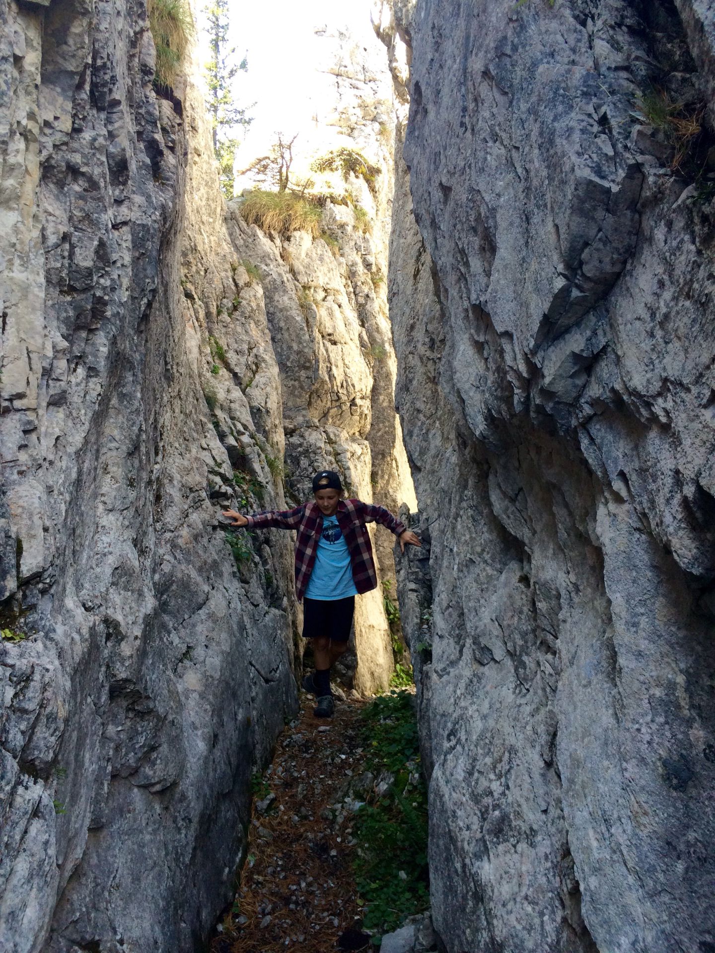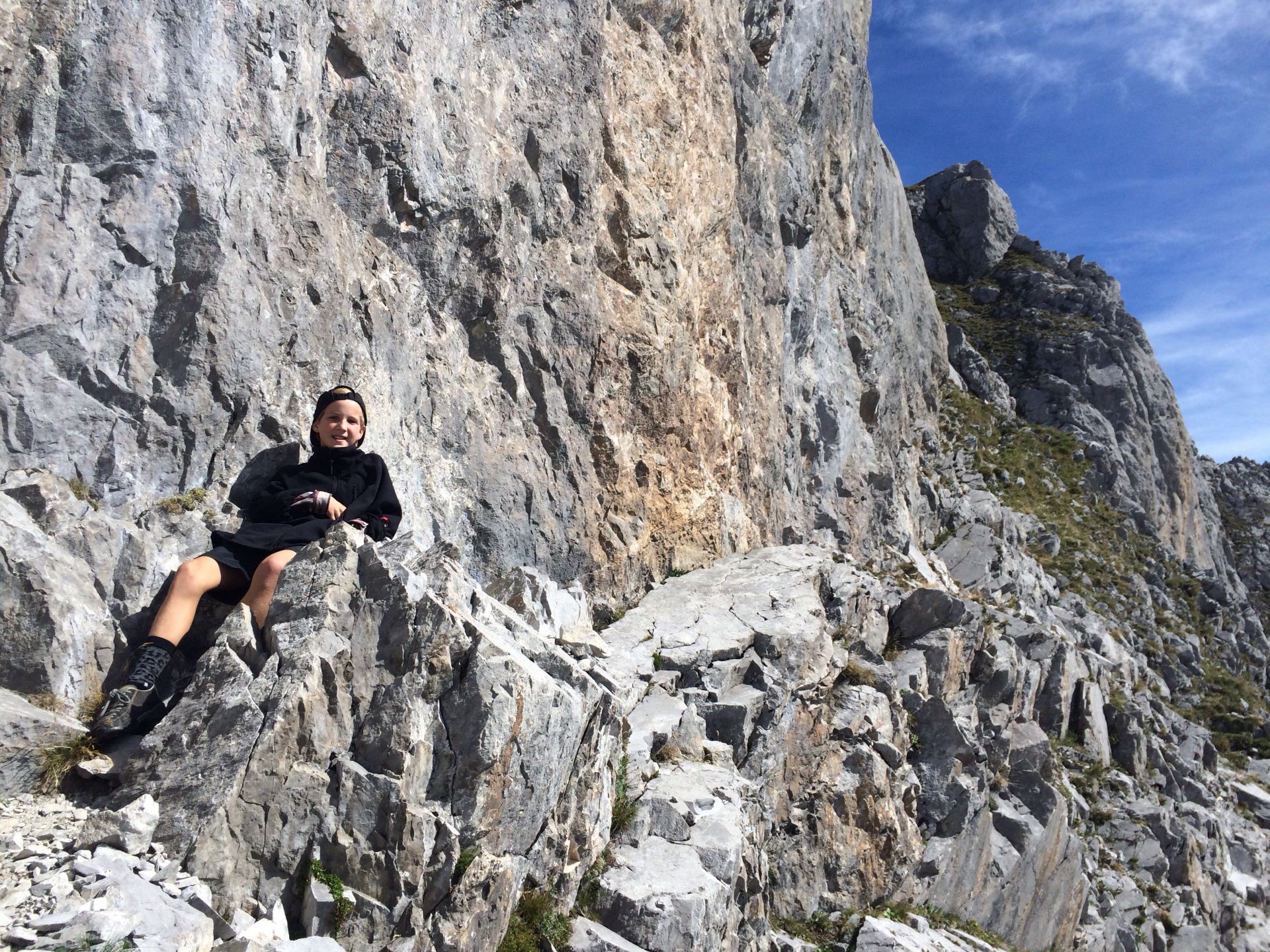 Von jetzt an muss das Gras zunehmend dem Schutt Platz machen, auf dem Pfad sind Trittsicherheit und Balance gefragt. Wir erreichen den Fuss der Gummfluh-Südwand und erkunden die Routenführung zum schmalen Band, das den Durchstieg auf den Gipfelgrat ermöglicht (siehe Foto). Da der Fels so wunderbar griffig ist, schlage ich vor, eine direktere Kraxelroute zu nehmen. Das brauche ich dem jungen Gipfelstürmer nur einmal zu sagen….