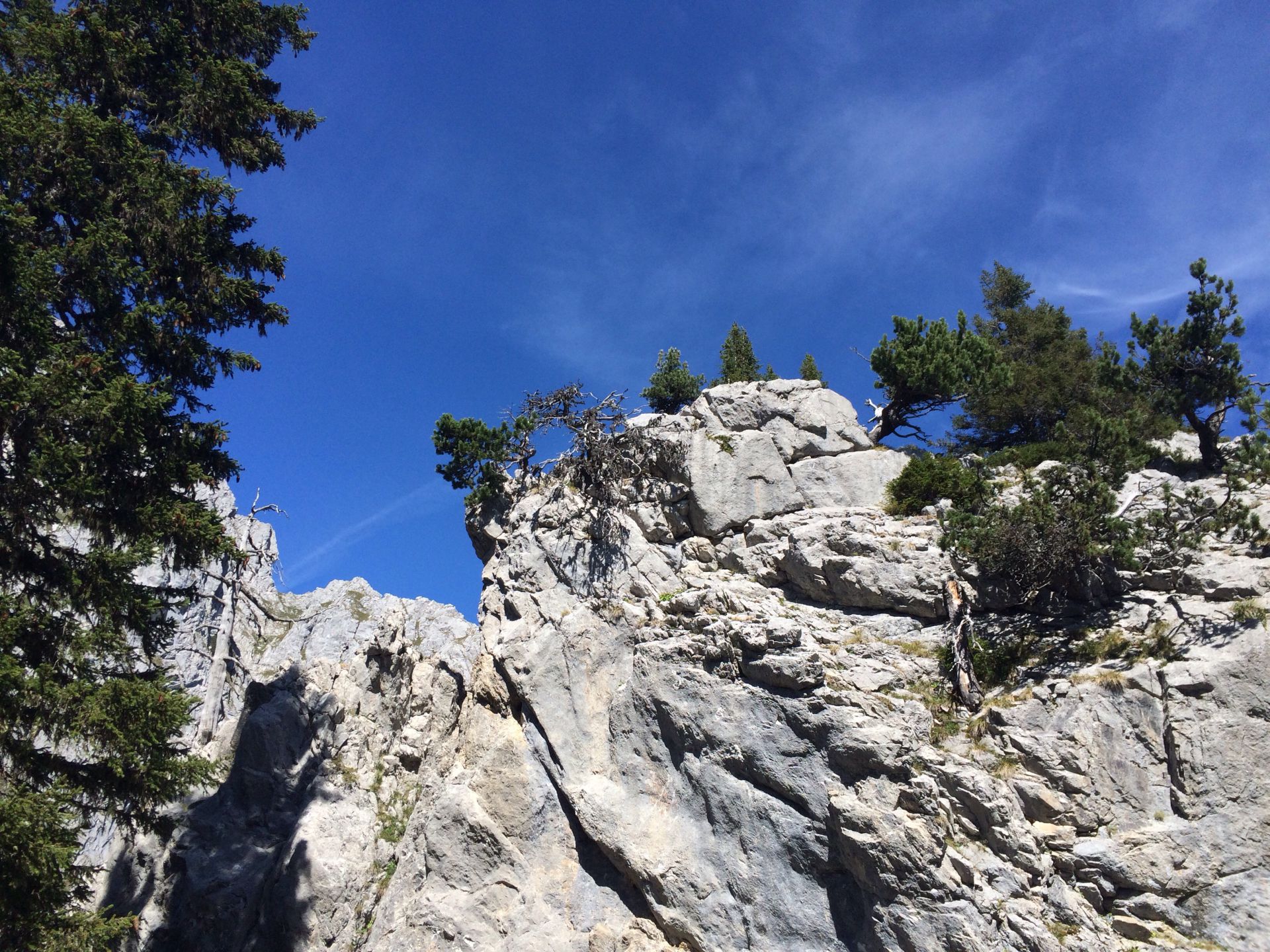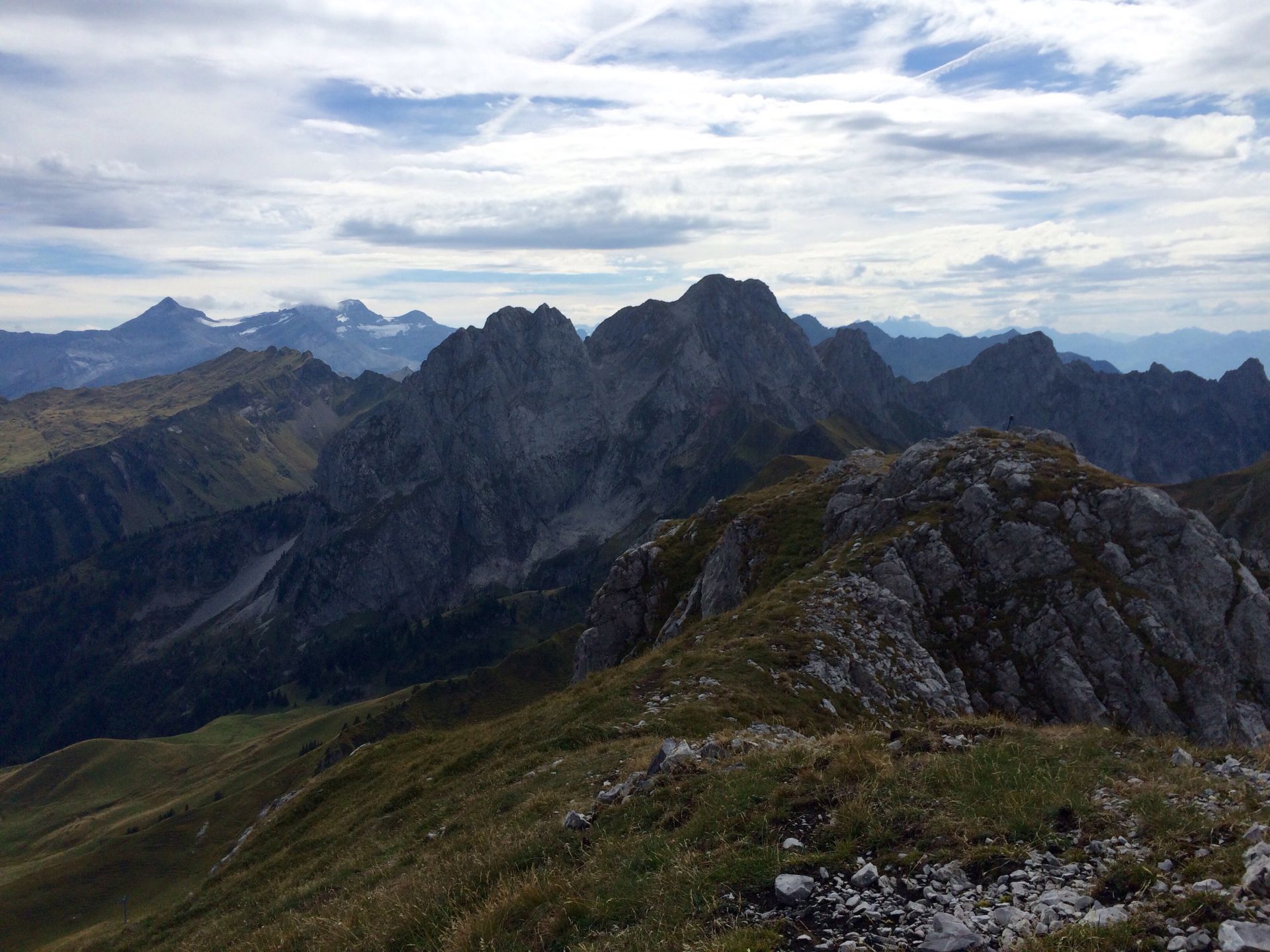 Der blockige Grat bietet eine gute Sicht auf die senkrechten Wände der Pointes de Sur Combe, gleichzeitig aber auch auf „die Hand Gottes“ – das Saanenland mit seinen fünf Tälern. Jan Lukas läuft zügig voraus – wie lange mag ich ihm wohl noch nachkommen? Der Trampelpfad wird immer steiler, mein Puls schlägt höher als mir lieb ist. Auf 2250m flacht die Route etwas ab, wir traversieren nun unterhalb der Felsen, holen wieder etwas Luft und pausieren dort, wo beim letzten Versuch Schluss war.