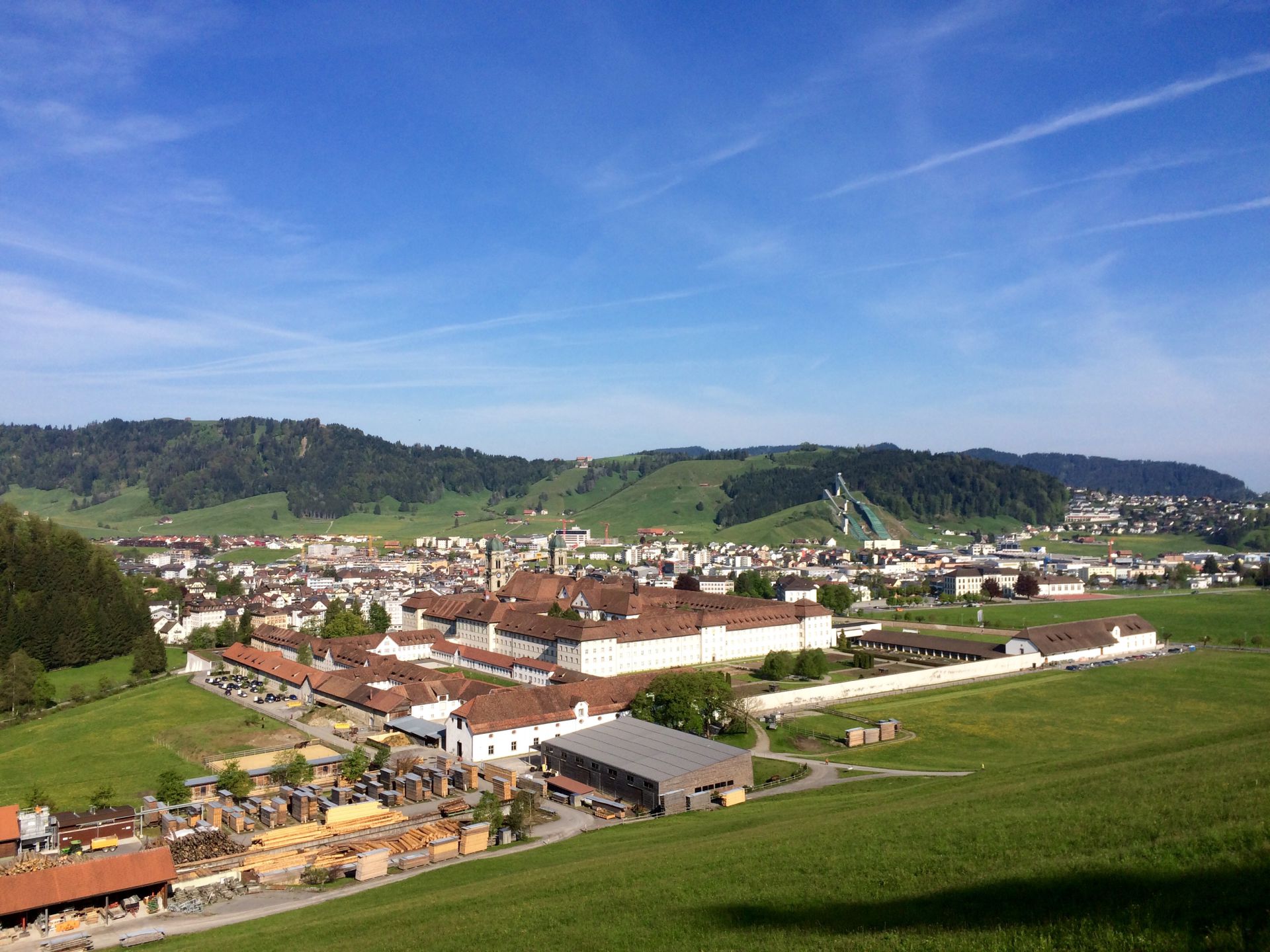 Neun Uhr morgens ist es noch ruhig in Einsiedeln. Der Parkplatz vor dem Kloster ist leer und die Devotionalien in den Souvenirgeschäften warten geduldig auf ihre Käufer. Der Weg führt an die Klostergärten vorbei und steigt dann rasch an. Ein informativer Baumlehrpfad schafft Kurzweile im Aufstieg über den breiten Waldweg. Auf der erste Anhöhe überblicke ich das vom Kloster dominierte Dorf. Einzig die Sprungschanzenanlage vermag vom übermächtigen Sakralbau abzulenken.