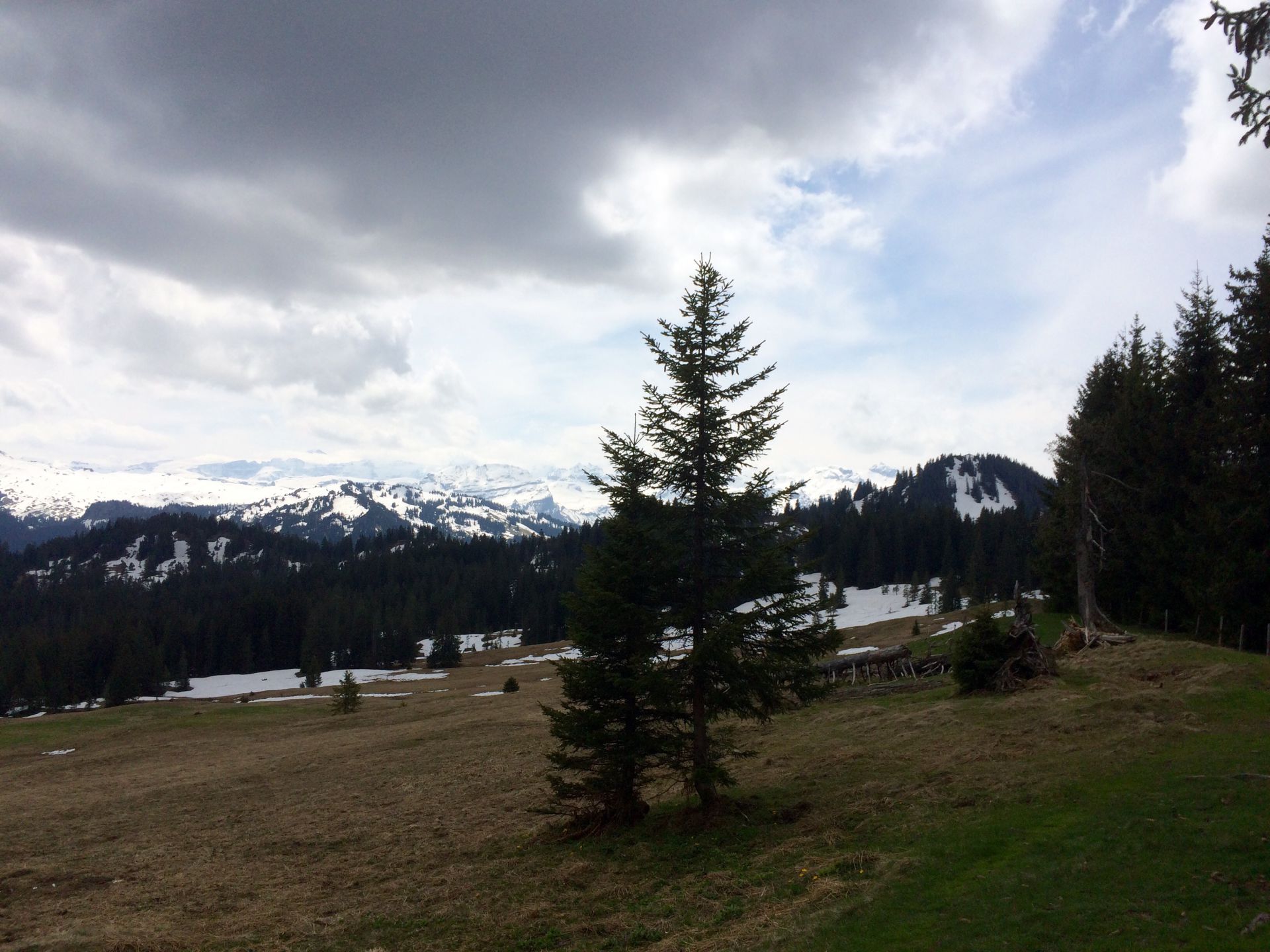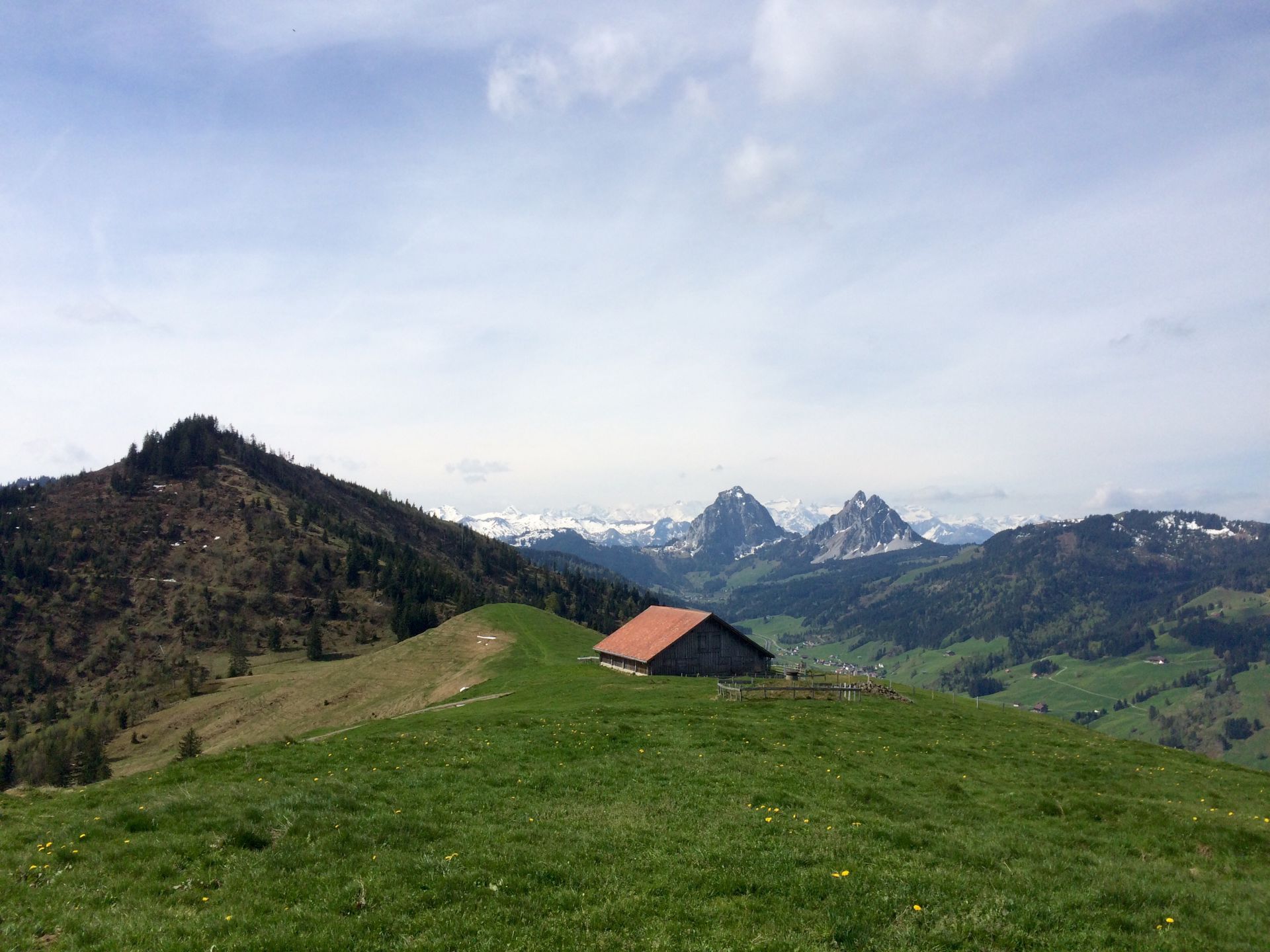 Der Amselspitz begrüsst mich mit einer netten Holzbank, verwehrt mir aber aufgrund der Bäume den Blick nach Norden. Aber die Aufmerksamkeit richtet sich eh auf den Süden, wo sich jetzt der ganze Alpenkranz zeigt. Ich esse ein Sandwich und freue mich, endlich auf diesem Gipfelchen zu sitzen. Er stand auf meiner ToDo-Liste seit ich vor Jahren das erste Amselspitz-Joghurt gegessen hatte, das Simone mit nach Hause gebracht hatte. Im genüsslichen Abwärtsgang wandere ich weiter zur Stockhütte, das Gelände erinnert inzwischen an OL-Gelände in Skandinavien.