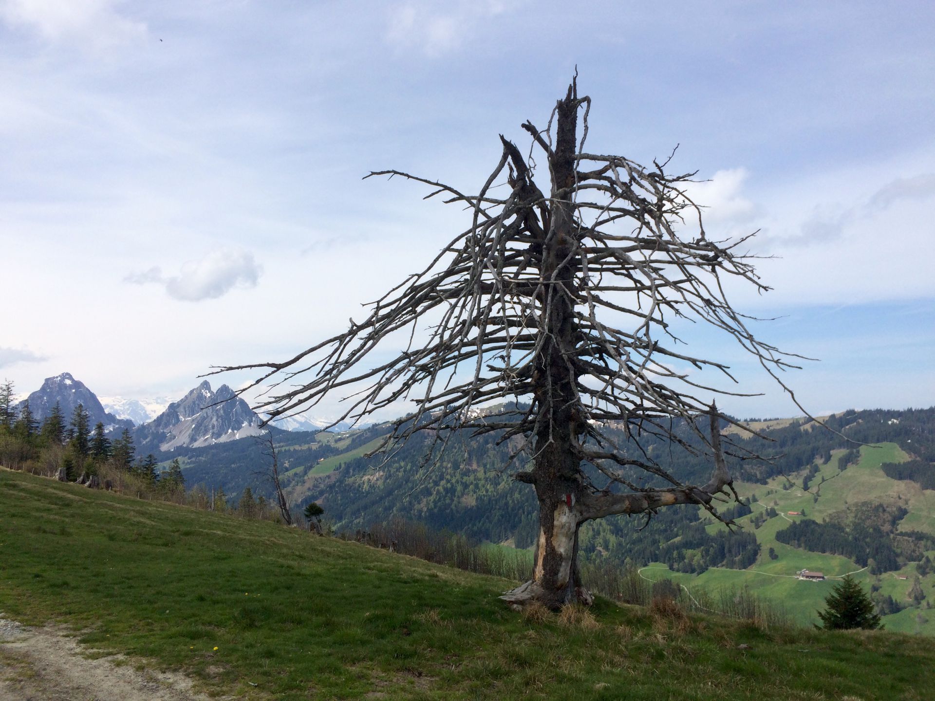 Am Fuss des Amselspitz betrete ich das Naturschutzgebiet Ibergeregg, das ich nun bis zum Ende der Tour nicht mehr verlassen werde. Prompt wird der Weg von umgefallenen Bäumen gesäumt – ist das Naturschutz oder Saisonanfang? Wohl eher das Letztere, denn auch zahlreiche Wegweiser zeugen noch von winterlichen Gewalteinwirkungen. Das wird in zwei, drei Wochen korrigiert sein.