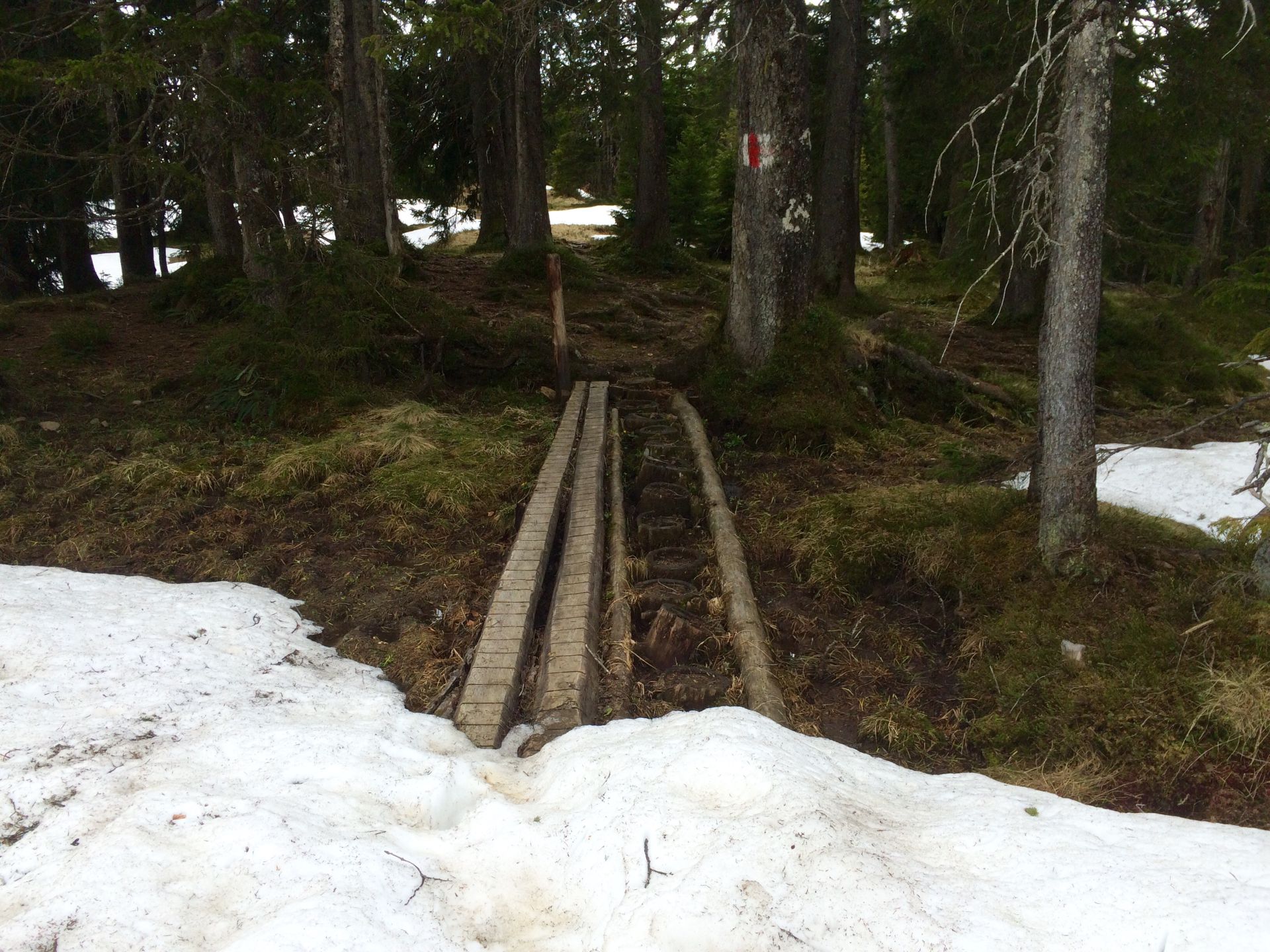 Der etwas waldige (und langweilige) Anstieg zum Gschwändstock bringt dann die ersten Schneepassagen. Nach einem steilen, glitschigen Abstieg folgt wieder eine sehenswerte Passage durch offenes Hochmoorgebiet mit viel Blumen und schöner Sicht auf die Skigebiete von Oberiberg und Hoch Ybrig, die ihrerseits noch im tiefsten Winter zu verweilen scheinen. Nur die Wegfindung ist nicht einfach, wer aber einfach immer wieder die Grathöhe sucht, findet auch den Pfad.