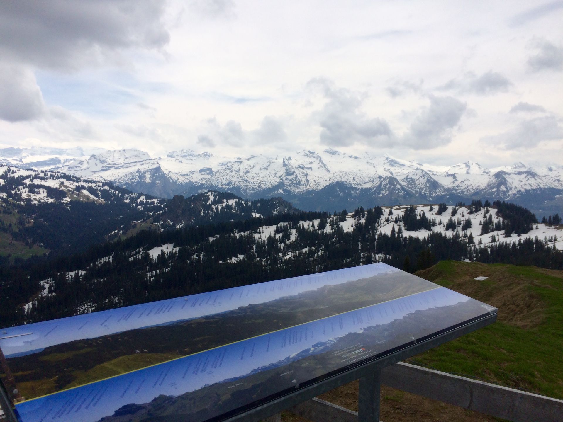 Bei Furggelen erreiche ich die Hütte, die von den Skitourenfahren immer so schön besungen wird, sie ist aber natürlich längst dicht. Ich nehme nun die letzte Steigung unter die Füsse und erreiche wenig später, durch Schnee watend, den höchsten Punktes des Tages, den Furggelenstock. Ein begnadeter Hobbyfotograf hat sich hier verwirklicht und schön beschriftete Panoramaphotos installiert, die ich gerne studiere, um meine Geographiekenntnisse aufzufrischen.
