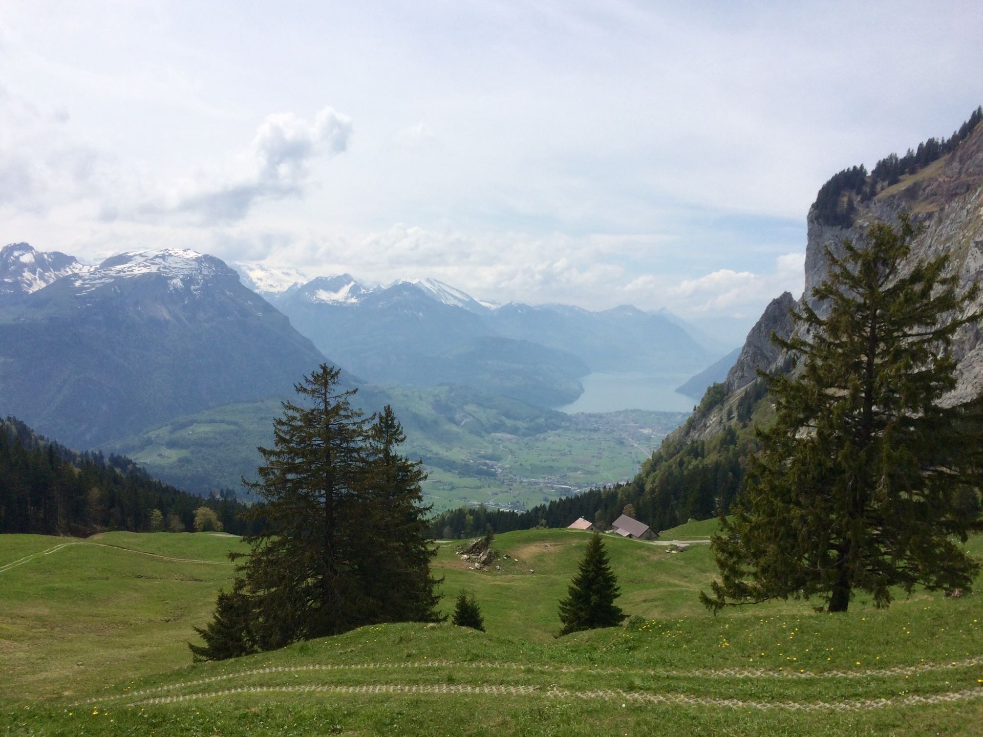 Auf dem Scheitel des Friherrenbergs wird der Weg schmal und abwechslungsreich. Ich freue mich über den blauen Sihlsee und die noch weisse Fluebrig, bald auch über die eindrückliche Nordwand des Druesbergs. Der Weg führt nun wieder leicht hinunter, eine Eigenschaft dieser Tour, die mich den ganzen Tag begleiten wird: ein stetes Auf und Ab. Auf dem Chli Amslen wird ein erstes Highlight erreicht. Im Süden begrüssen mich der Amselspitz und die Mythen, im Talboden nördlich breitet sich der Sihlsee aus, etwas weiter weg schimmern die drei grossen Zürcher Seen.