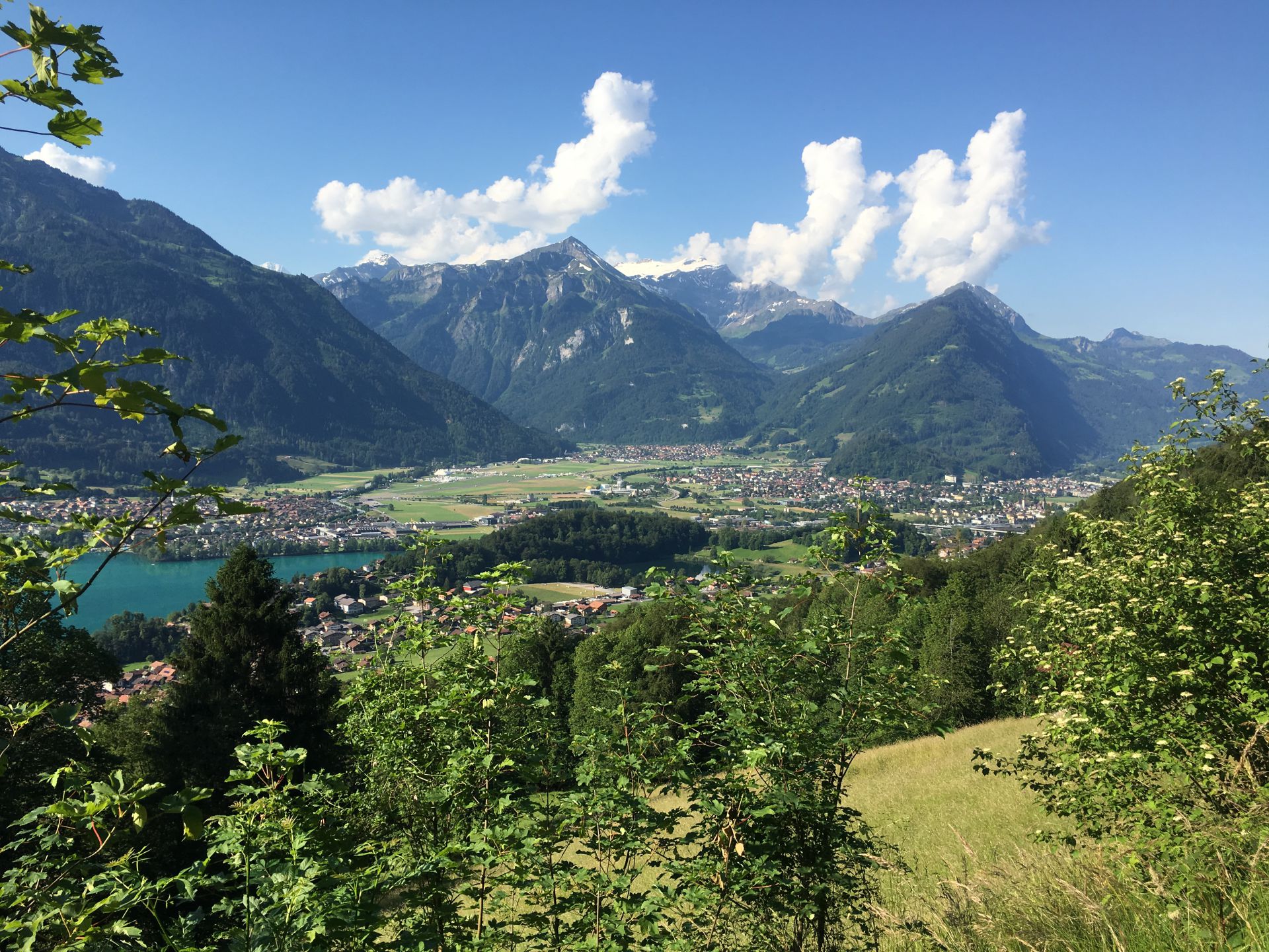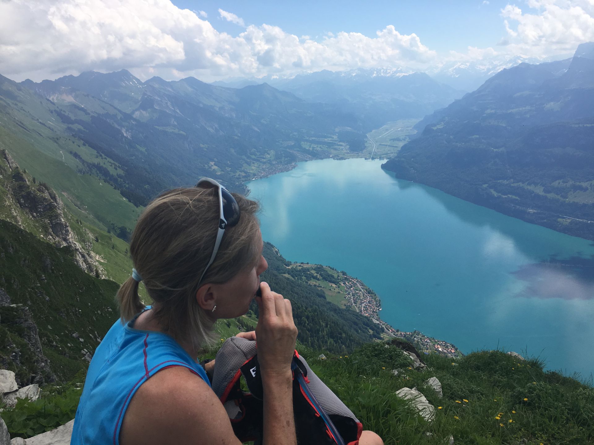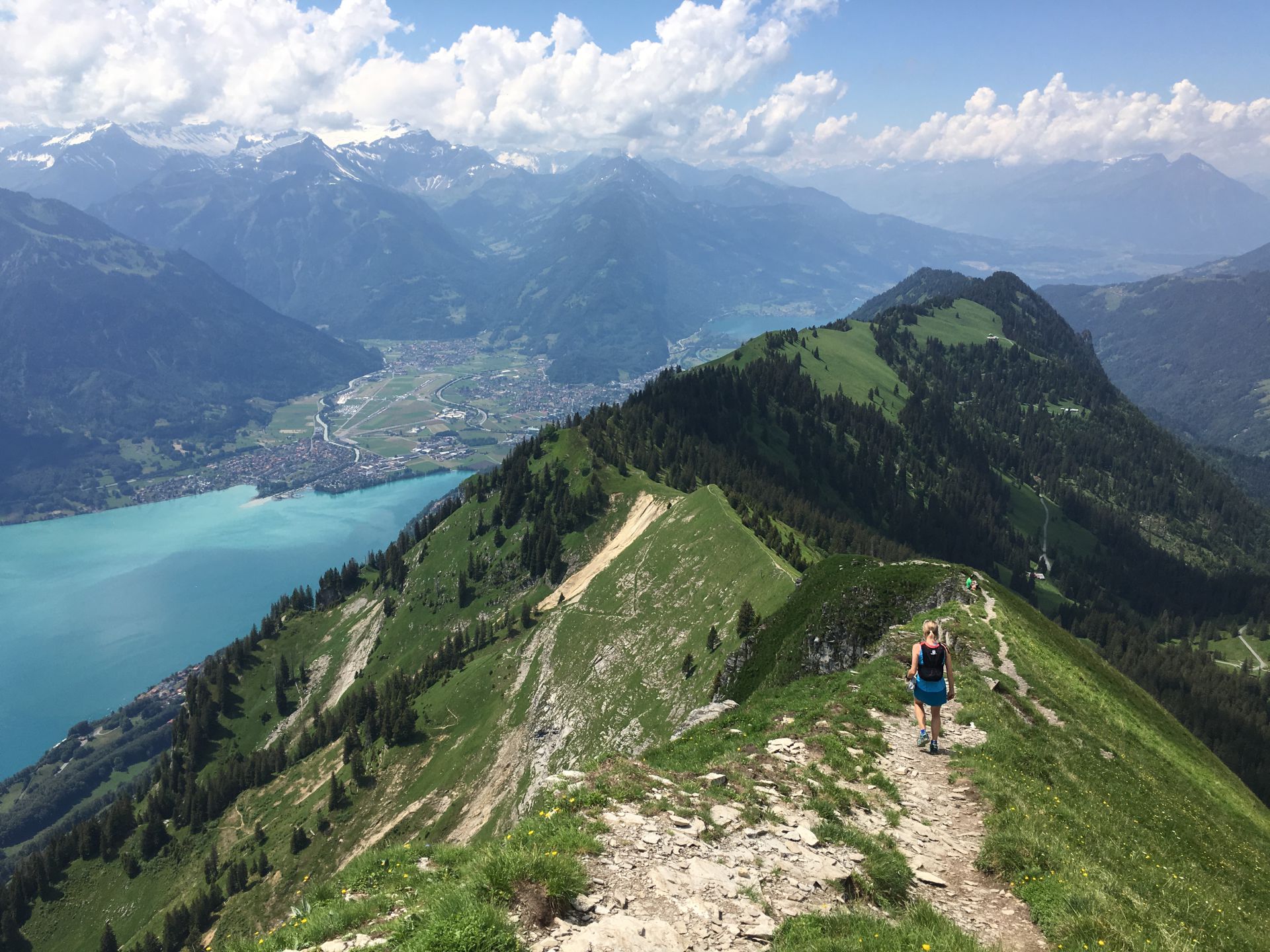 Es ist heiss und wir sind nicht unglücklich, dass die äusserst steilen ersten neunzig Minuten mehrheitlich durch dichten Wald führen. Ich beneide Pauline um ihre ultraleichte Mountain Running Ausrüstung – das muss ich mir jetzt dann auch zutun. Immer mal wieder erlaubt eine Lichtung den Blick (und damit verbunden eine Verschnaufpause) auf den türkisblauen Brienzersee, der schnell kleiner wird. Auf der anderen Seeseite zeigen sich über der Schynige Platte zuerst Breithorn und Grosshorn, danach Fiescherhörner, Mönch und Eiger. Nur die Jungfrau ziert sich zunächst noch und versteckt sich hinter Cumuli.