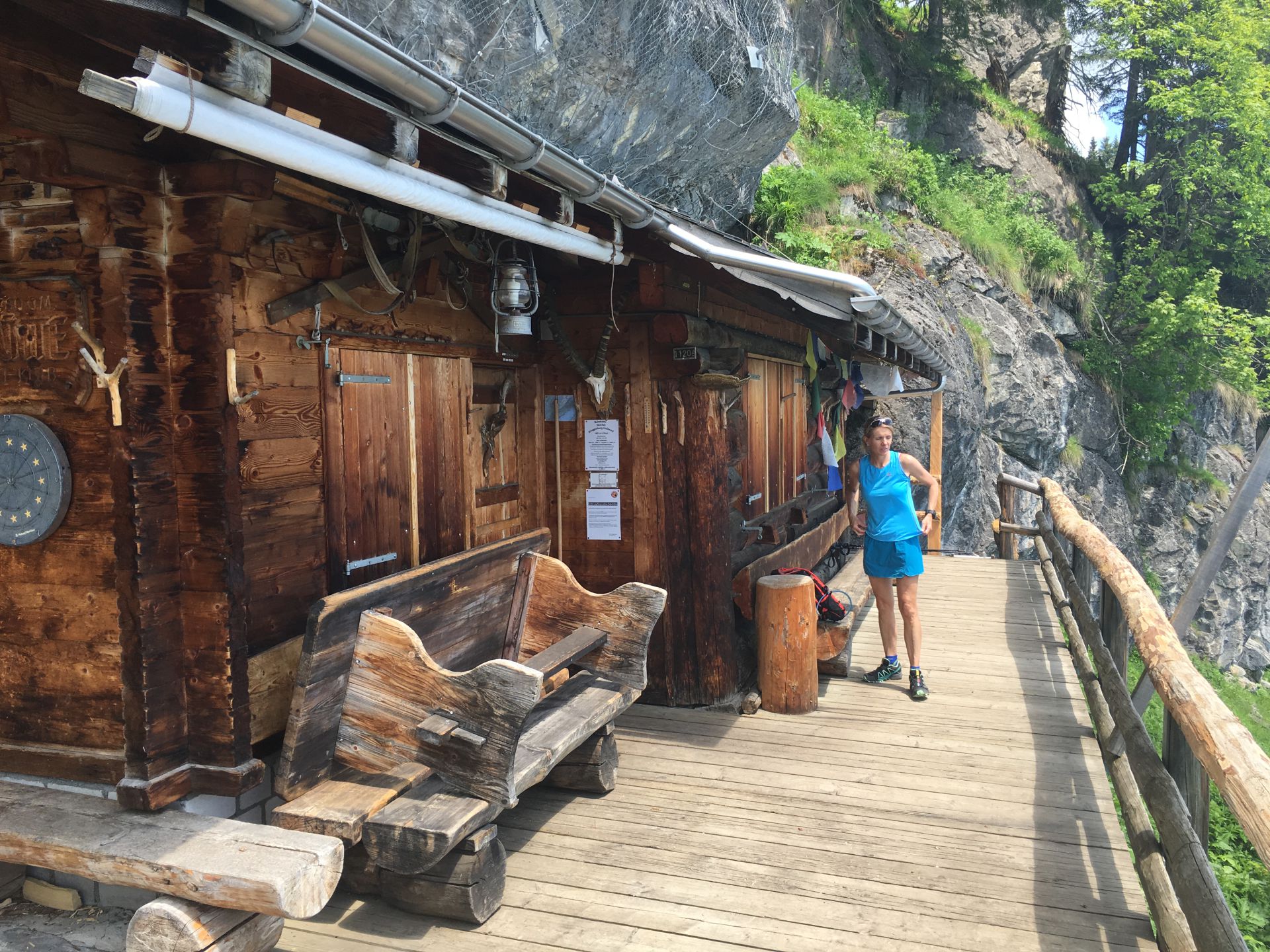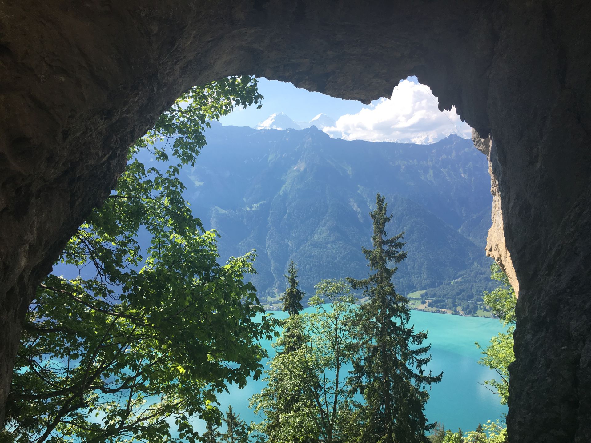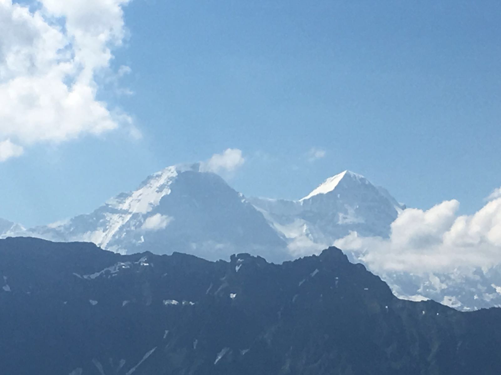 Es ist heiss und wir sind nicht unglücklich, dass die äusserst steilen ersten neunzig Minuten mehrheitlich durch dichten Wald führen. Ich beneide Pauline um ihre ultraleichte Mountain Running Ausrüstung – das muss ich mir jetzt dann auch zutun. Immer mal wieder erlaubt eine Lichtung den Blick (und damit verbunden eine Verschnaufpause) auf den türkisblauen Brienzersee, der schnell kleiner wird. Auf der anderen Seeseite zeigen sich über der Schynige Platte zuerst Breithorn und Grosshorn, danach Fiescherhörner, Mönch und Eiger. Nur die Jungfrau ziert sich zunächst noch und versteckt sich hinter Cumuli.