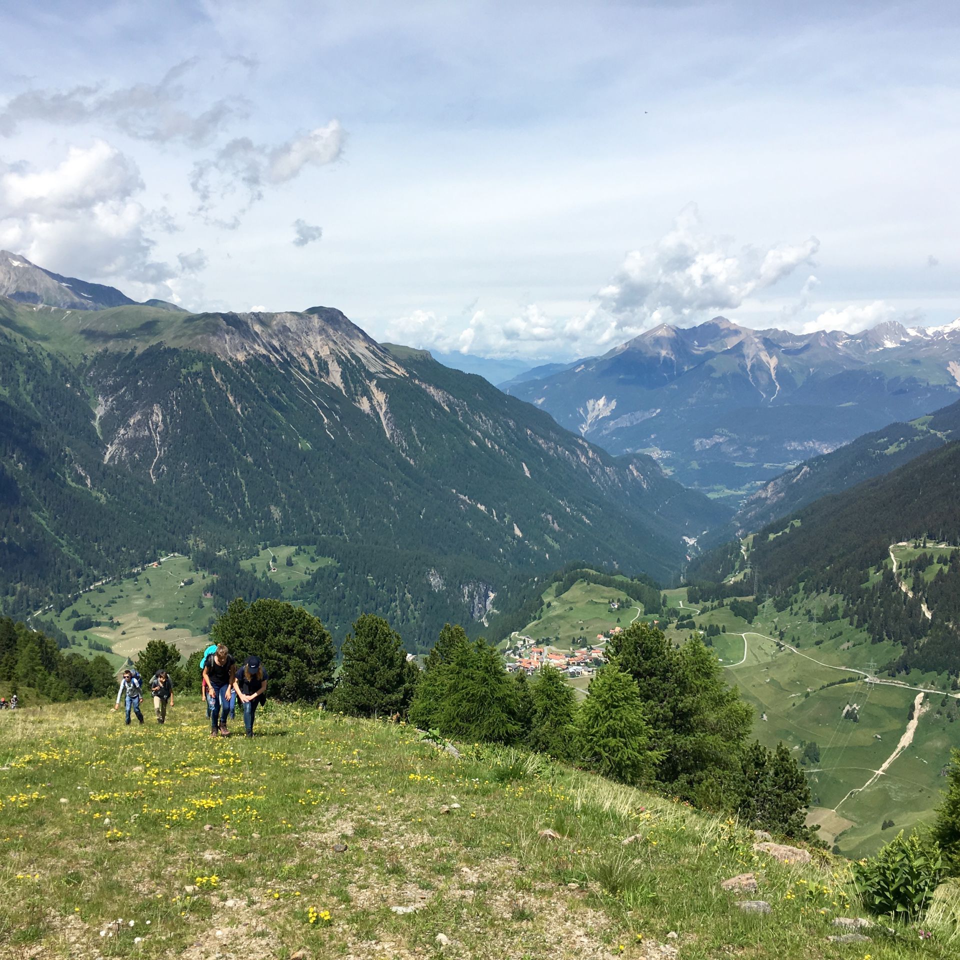Wir beginnen in Bergün mit einem kurzweiligen Marsch durch das stille Bergdorf, an dessen Ende eine etwas in die Jahre gekommene Sesselbahn auf uns wartet. Von der Mittelstation steigen wir hoch durch den Wald, und über eine planierte Skipistenrampe erreichen wir den Panoramaweg. Ganz schön steil für den Beginn! Nach einer kurzen Trinkpause mäandern wir gemütlich dem Hang entlang, überspringen Stock, Stein und kleine Bäche und erreichen nach einer guten Stunde die Alp Muotta Sur. Die Sicht auf das Val Tuor und die Bergüner Berggrössen Piz Ela, Corn da Tinizong und Piz Mitgel sind wunderbar. Auch die Keschhütte sehen wir schon in der Ferne, dazwischen liegt aber noch ein tiefes Tal…