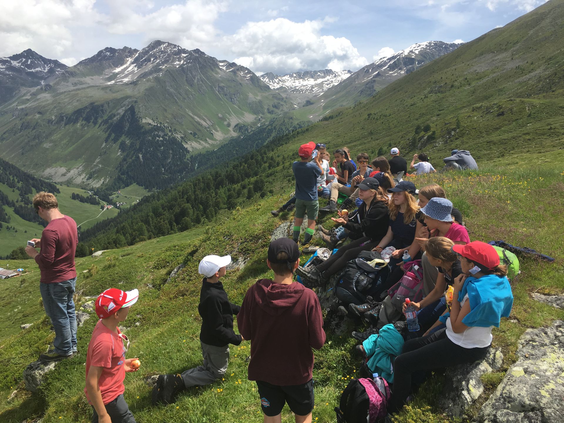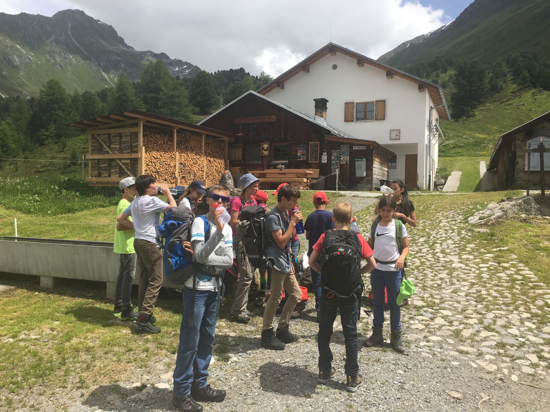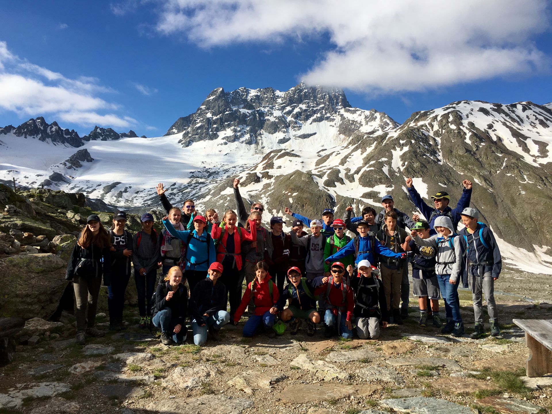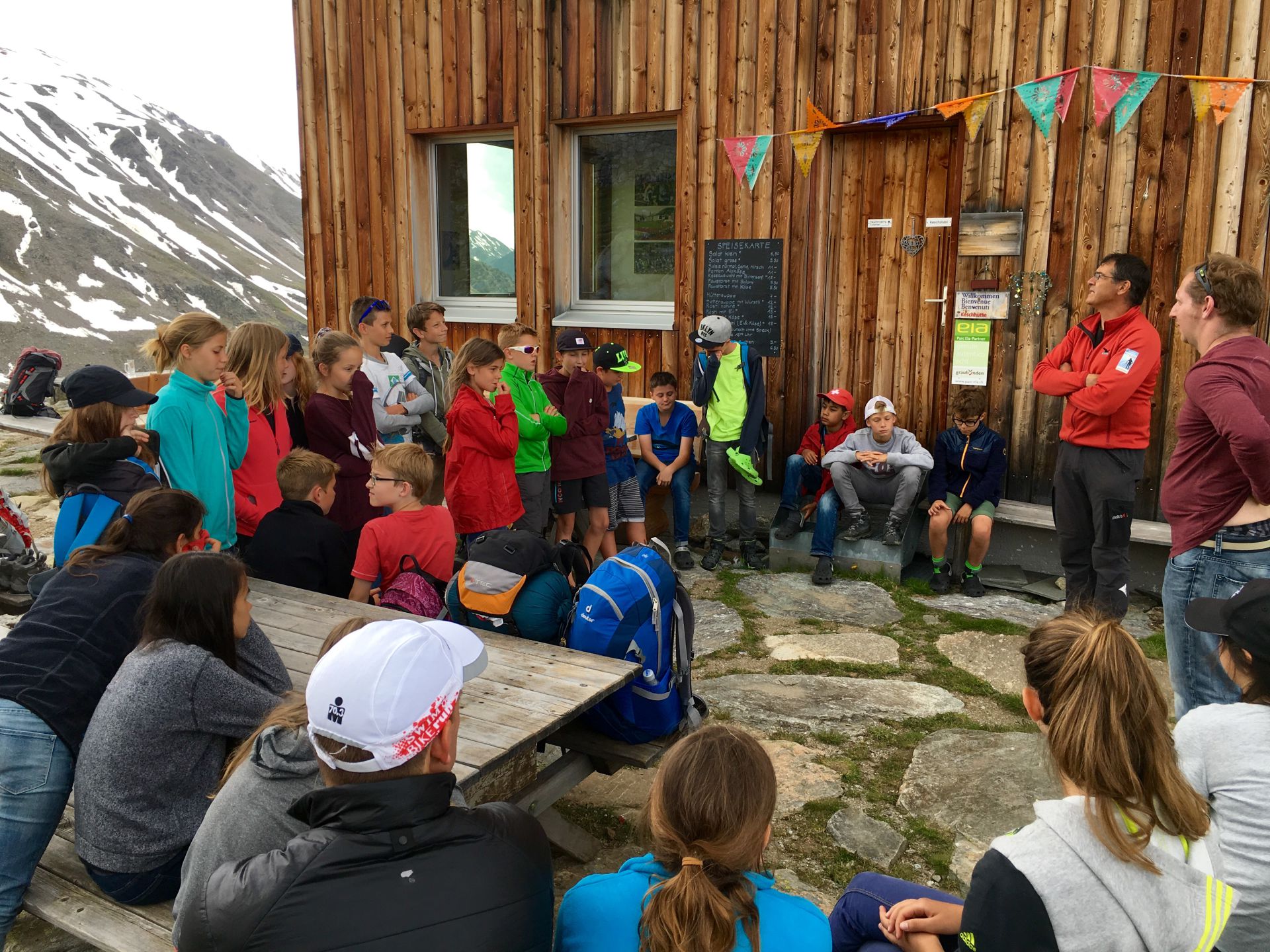 Das (sehr) steile Waldstück in der brennenden Sonne selektiert unter den jungen Wilden rasch. Zwei Jungs sind auch so nicht zu bremsen, die Abstände werden grösser. Oberhalb des Waldes wird das Gelände alpin, blumige Wiesen werden durch Schutthalden abgelöst, erste Schneeflecken säumen die Strecke. Der Gletscherbach ist prallvoll und gibt mit seinem Rauschen den Ton im Tal an. Die Beine werden schwerer, aber die Hütte kommt näher. Auch die zahlreichen Murmeltiere lenken von der Schwerarbeit ab. Ab 15 Uhr treffen wir gestaffelt bei der Hütte ein. Alle neuen Ankömmlinge werden von den schon Wartenden frenetisch bejubelt. Was für ein toller Klassengeist!