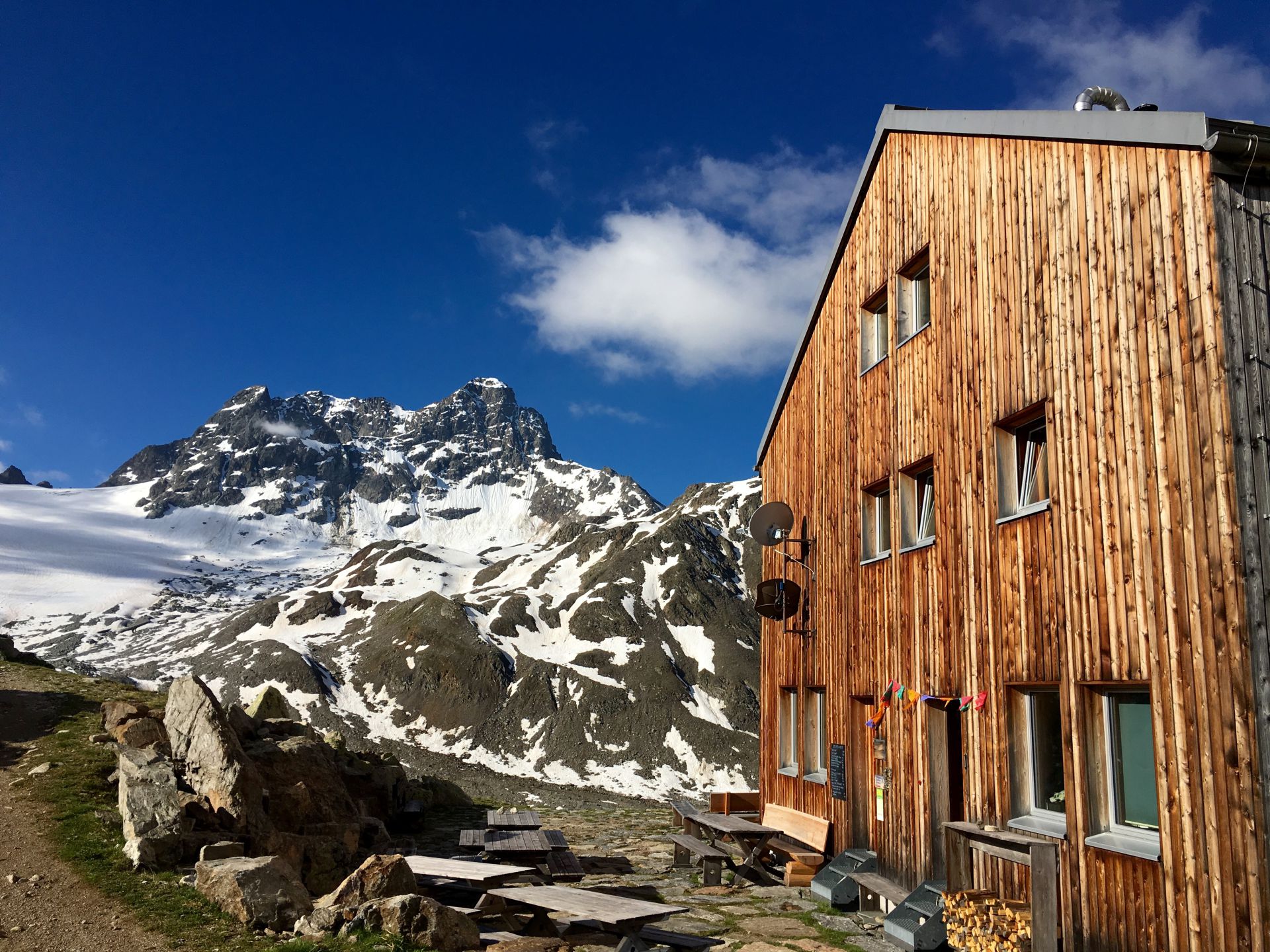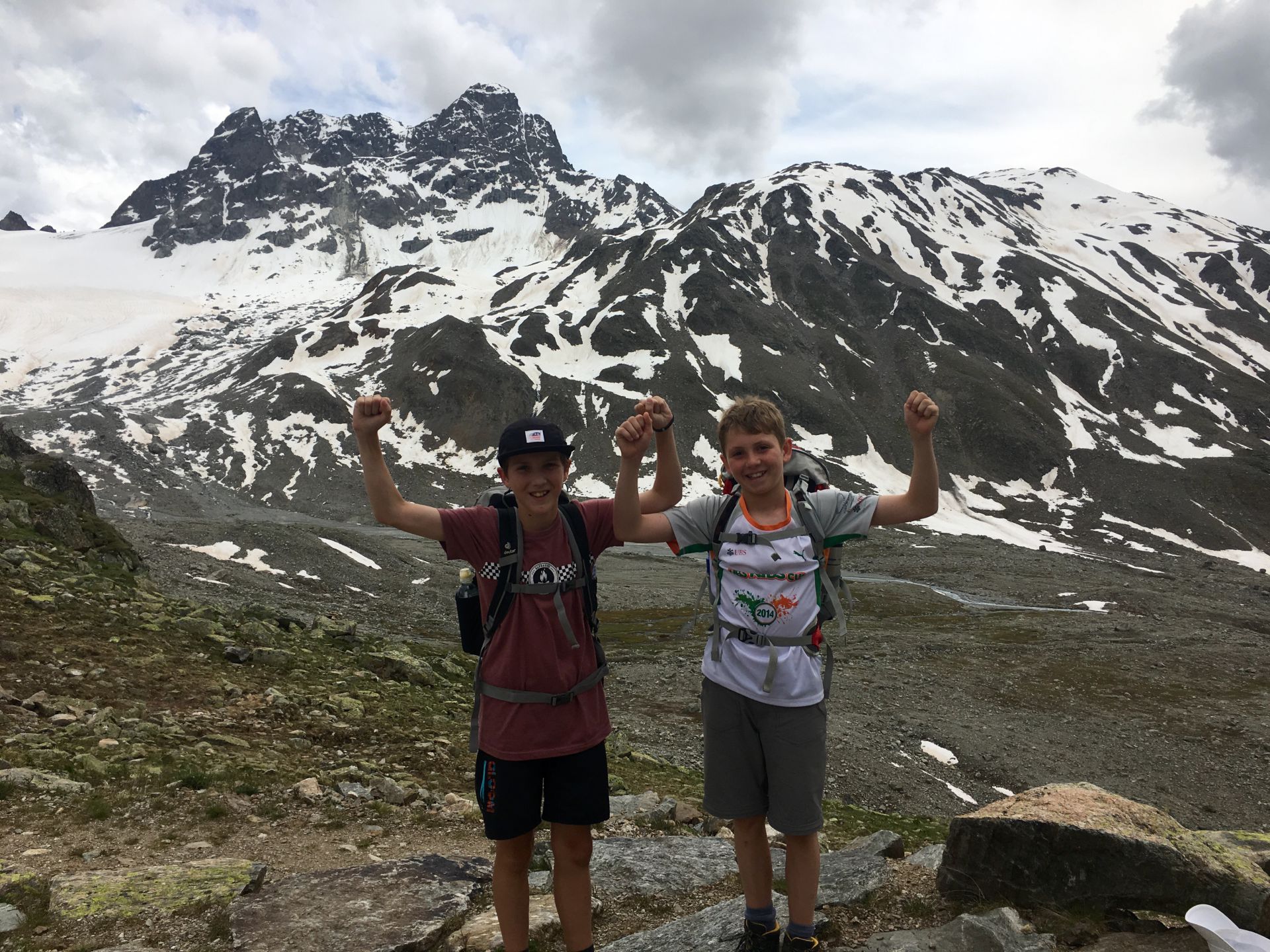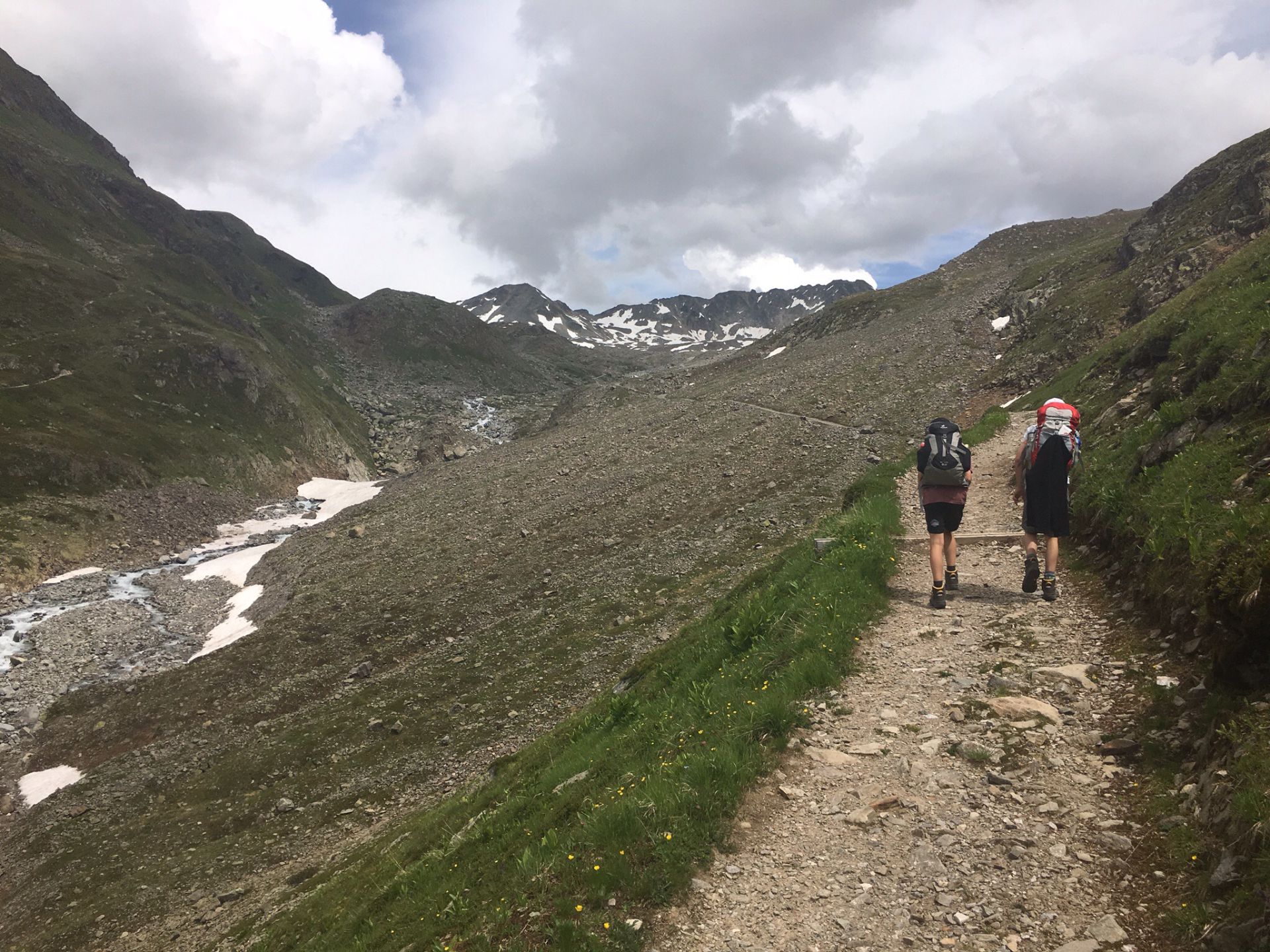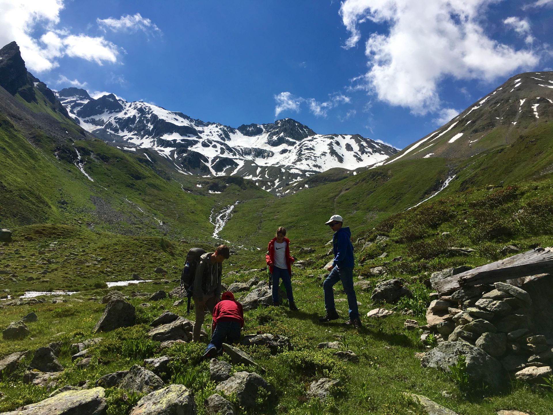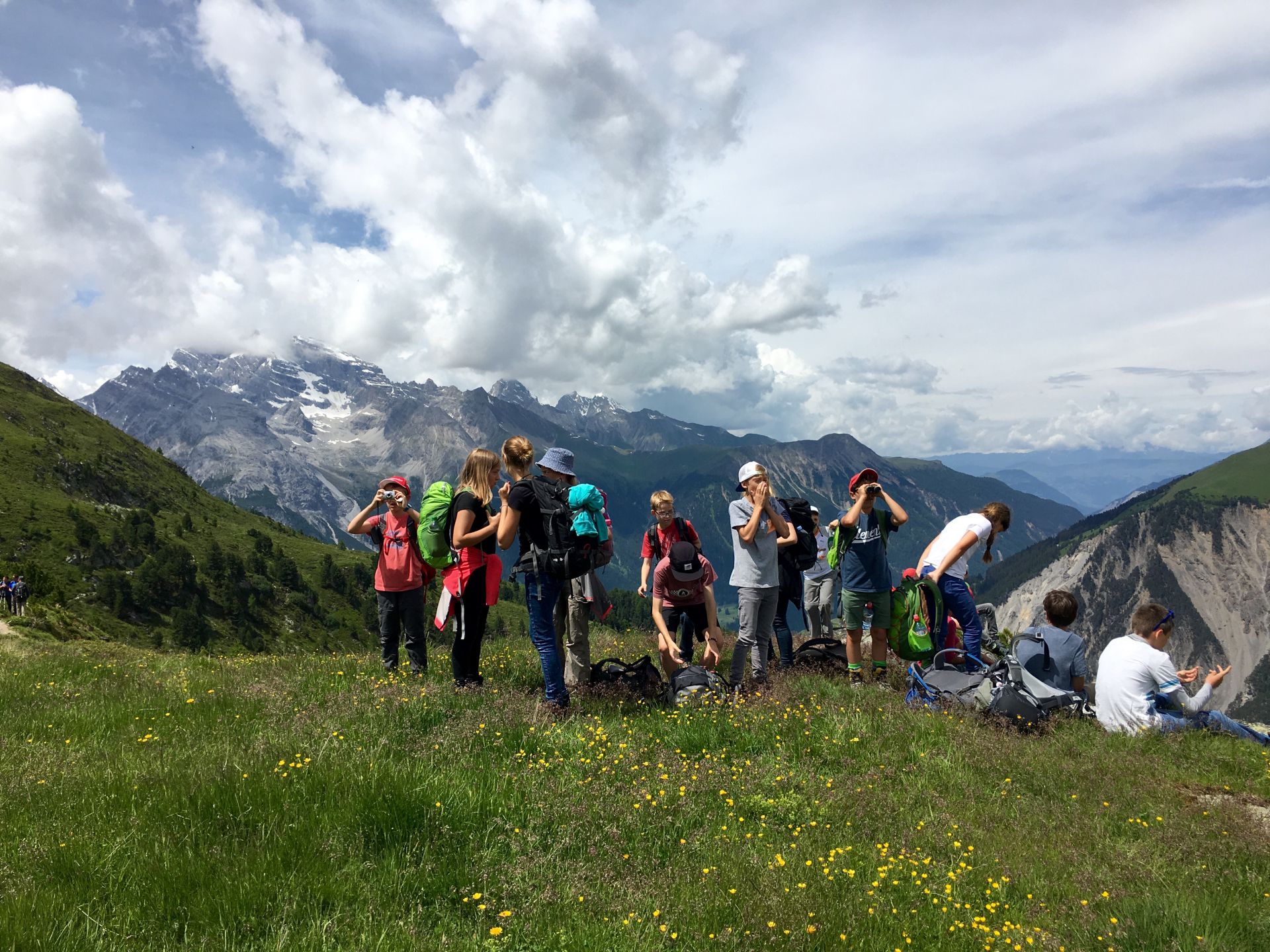 Das (sehr) steile Waldstück in der brennenden Sonne selektiert unter den jungen Wilden rasch. Zwei Jungs sind auch so nicht zu bremsen, die Abstände werden grösser. Oberhalb des Waldes wird das Gelände alpin, blumige Wiesen werden durch Schutthalden abgelöst, erste Schneeflecken säumen die Strecke. Der Gletscherbach ist prallvoll und gibt mit seinem Rauschen den Ton im Tal an. Die Beine werden schwerer, aber die Hütte kommt näher. Auch die zahlreichen Murmeltiere lenken von der Schwerarbeit ab. Ab 15 Uhr treffen wir gestaffelt bei der Hütte ein. Alle neuen Ankömmlinge werden von den schon Wartenden frenetisch bejubelt. Was für ein toller Klassengeist!