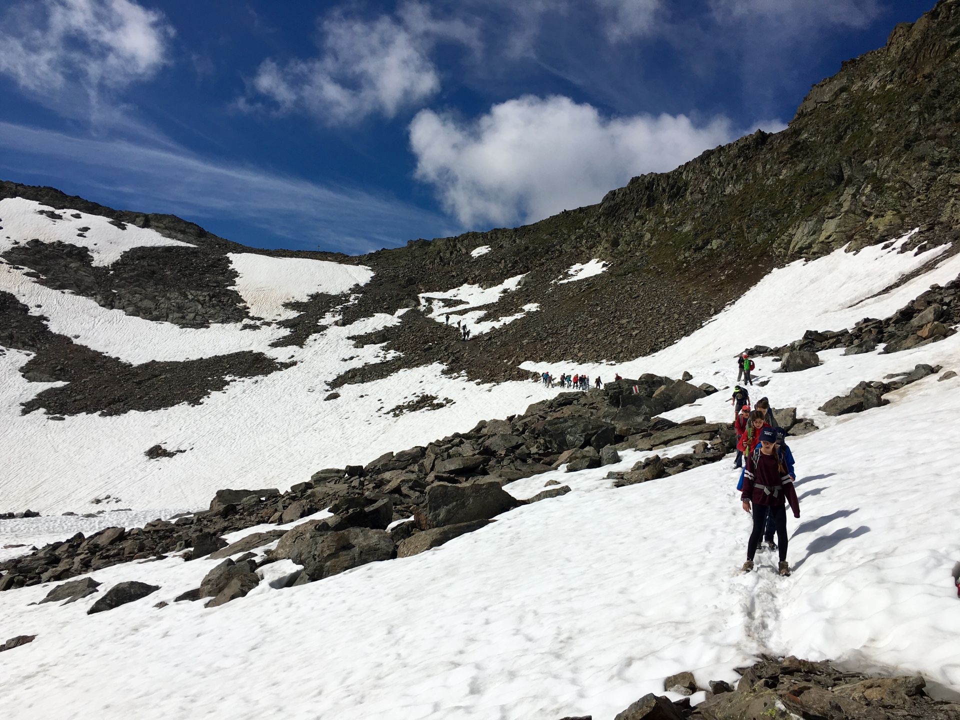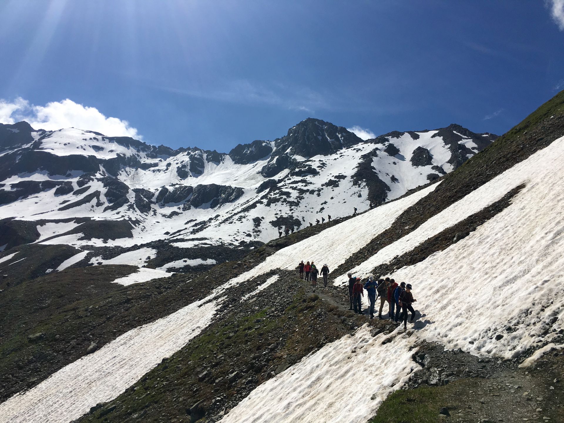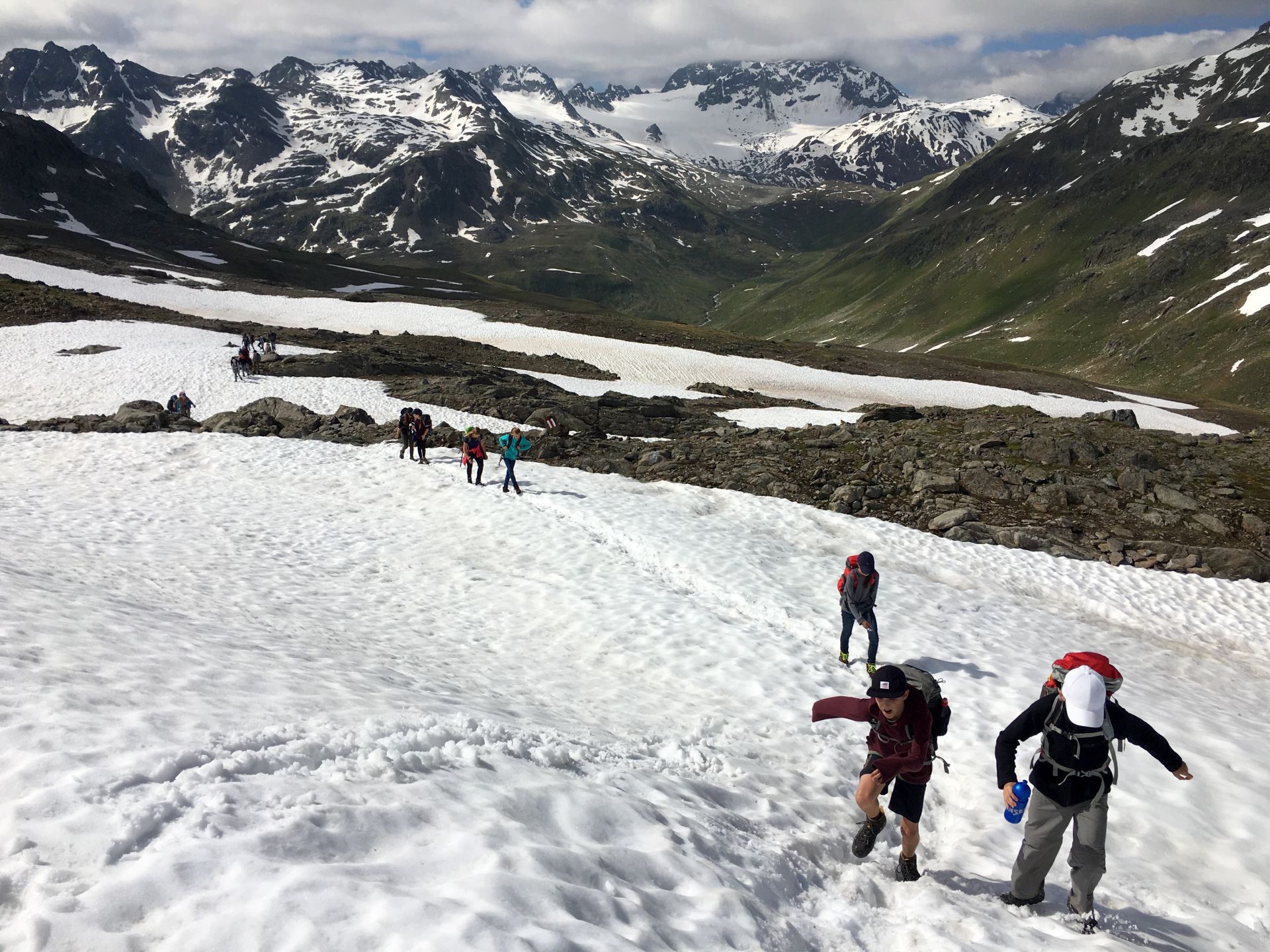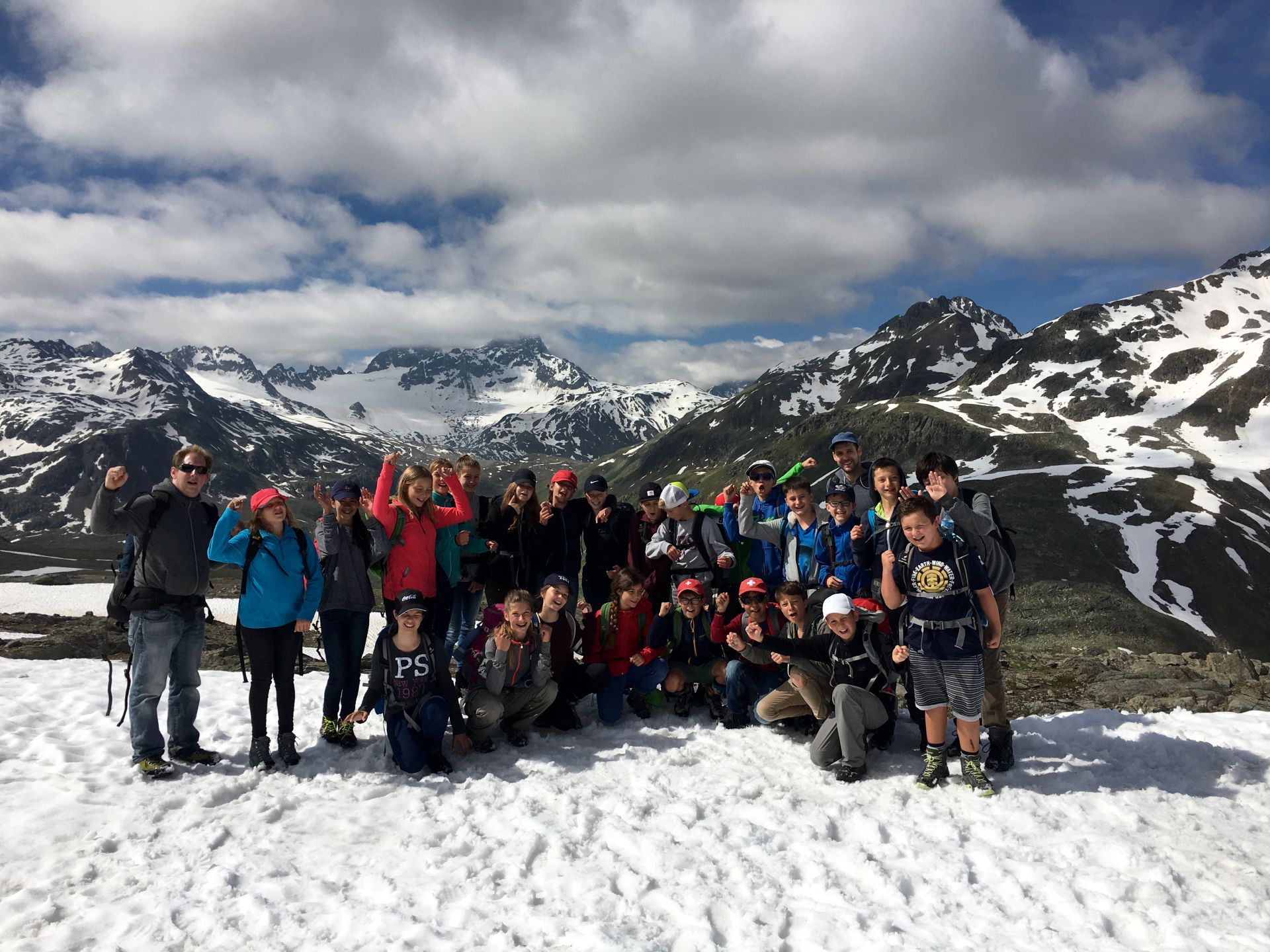 Morgens sind alle wieder topfit. Das Postkartenwetter erlaubt ein schönes Gruppenfoto vor der Hütte, dann sind wir bereit für die schneebedingt doch etwas anspruchsvolle Überschreitung des Sertigpasses. Nach einem kurzen Abstieg müssen nochmals ein paar Hundert Höhenmeter bewältigt werden. Sie sind aber nicht steil, und so haben die Jungs genug Luft, alle Tore, Stars und Siege der laufenden Europameisterschaft zu besprechen. Petkovic, es gibt Alternativen! Die Zeit fliegt um, bald stehen wir auf dem winterlichen Sertigpass und erreichen damit den höchsten Punkt der Tour (2739), was gebührend gefeiert wird.